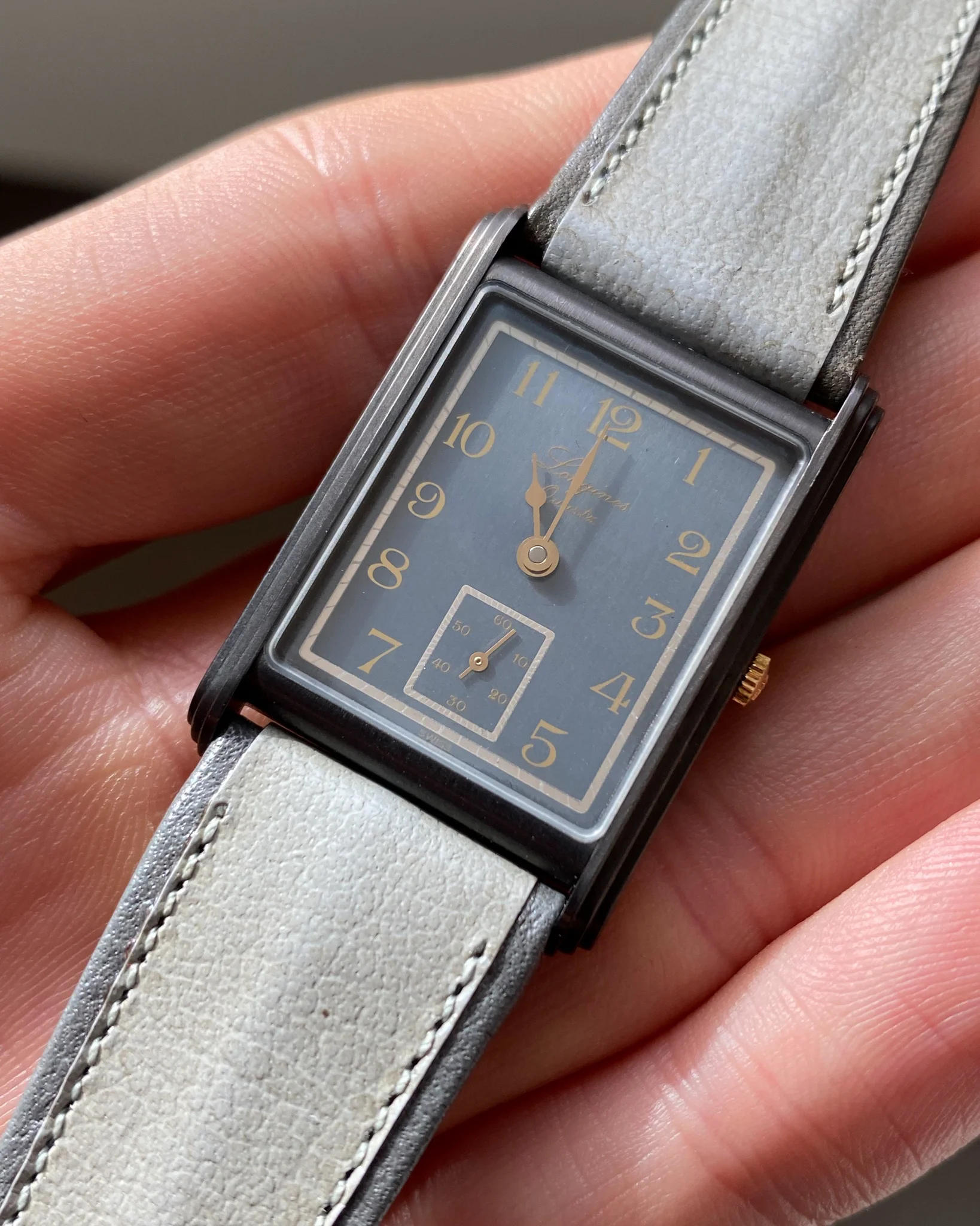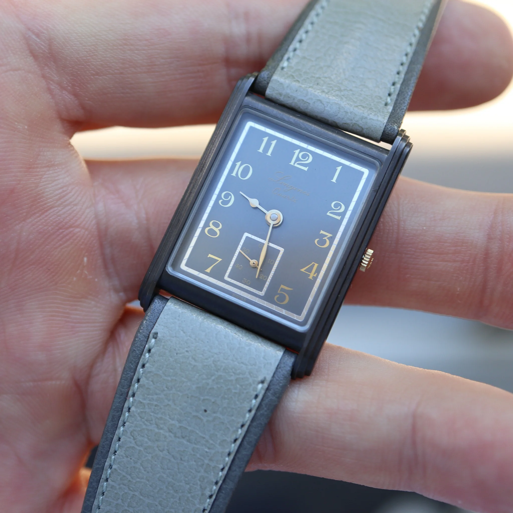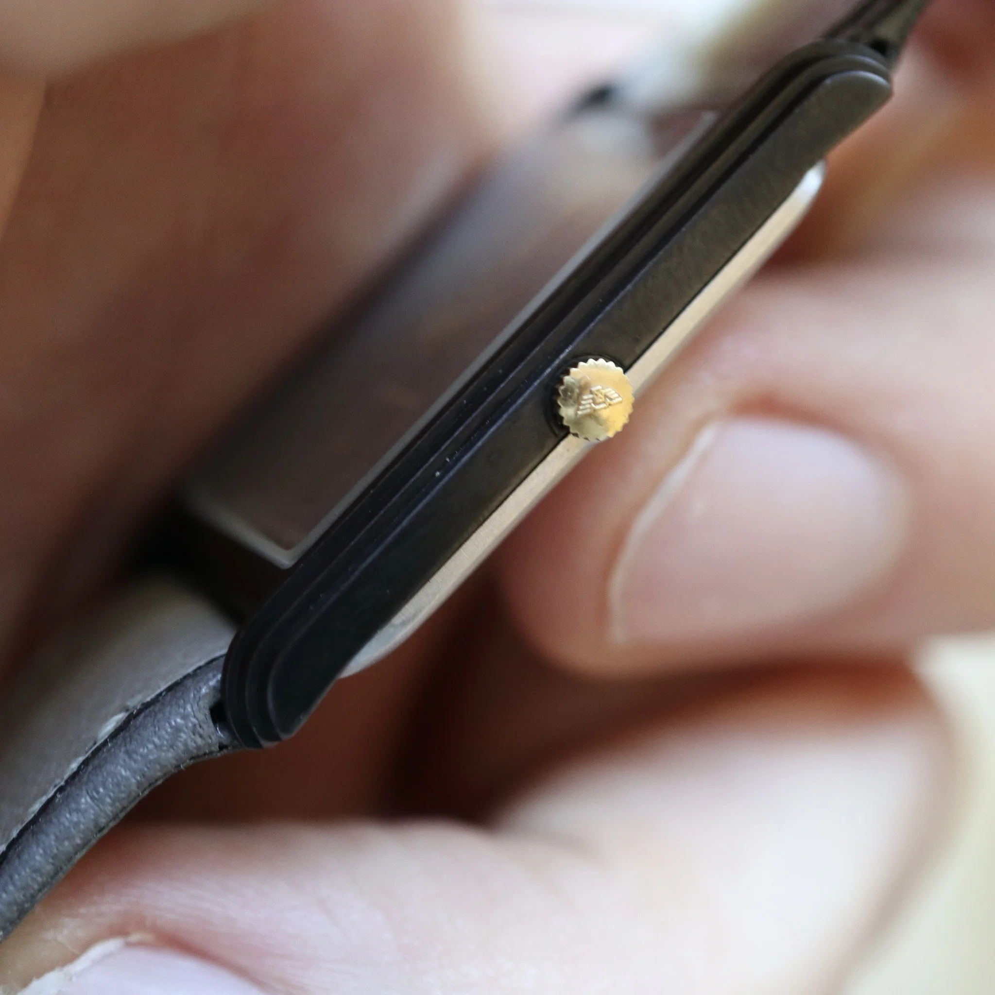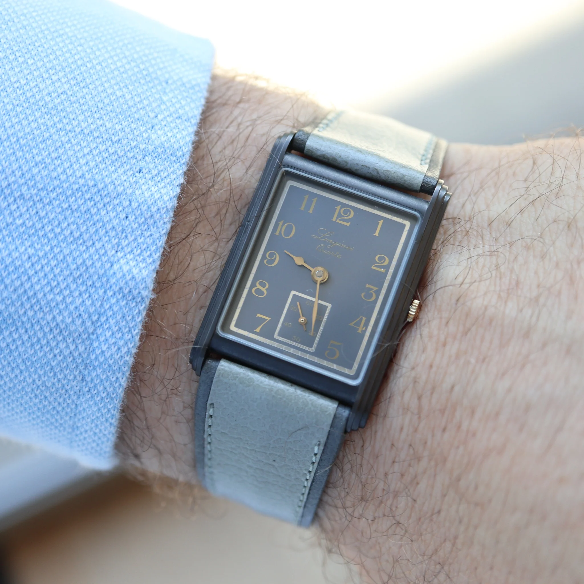 A nice Longines special anniversary reference in near NOS condition. Very thin and light on the wrist. PVD coated step case, stainless steel back, mineral glass, tri-color brushed center dial, breguet numerals, original signed crown, original bicolor leather strap, original pvd buckle. It runs perfectly. Lots of value for money! There is no damage, whatever you see on the case are dust particles!