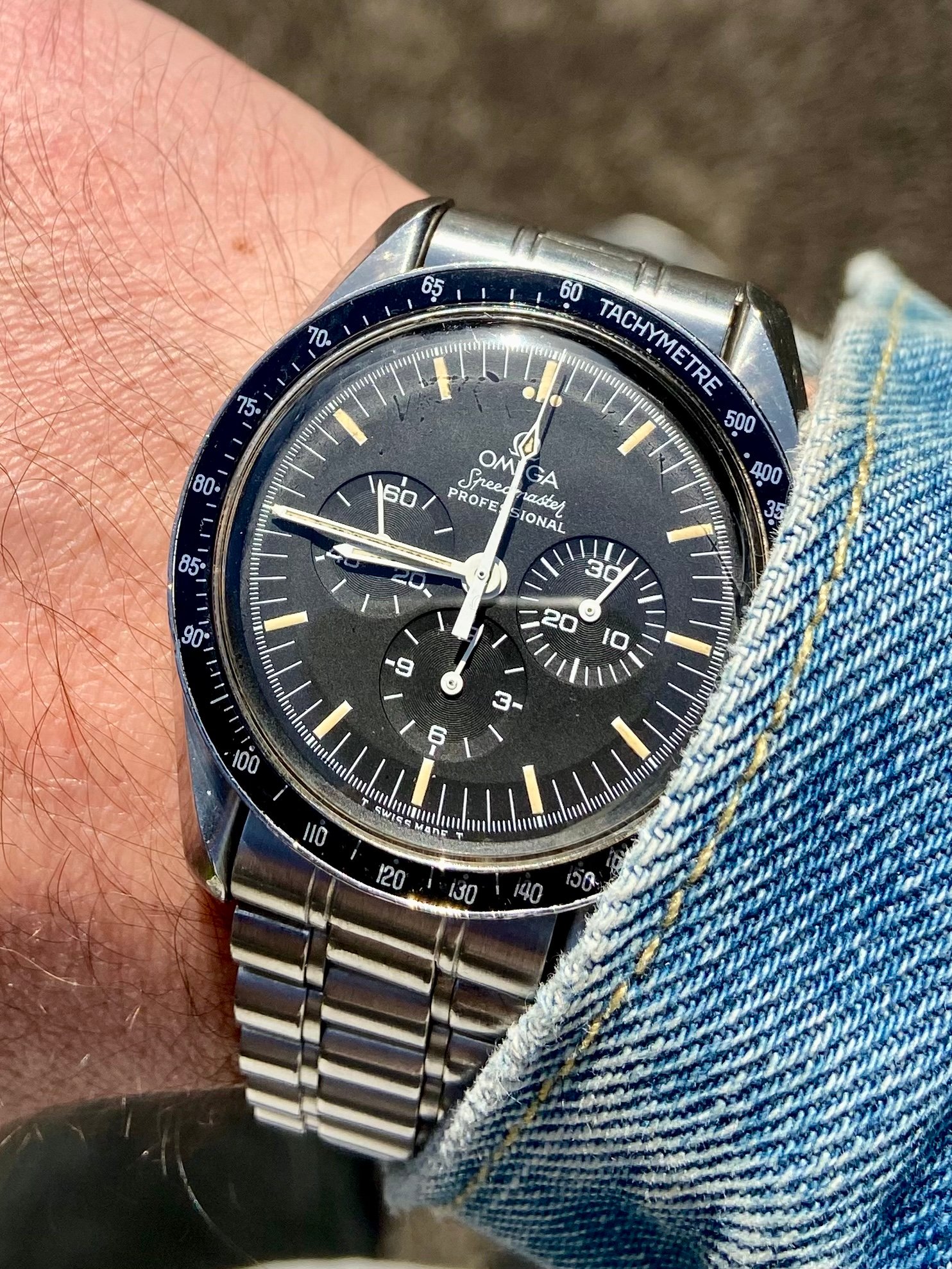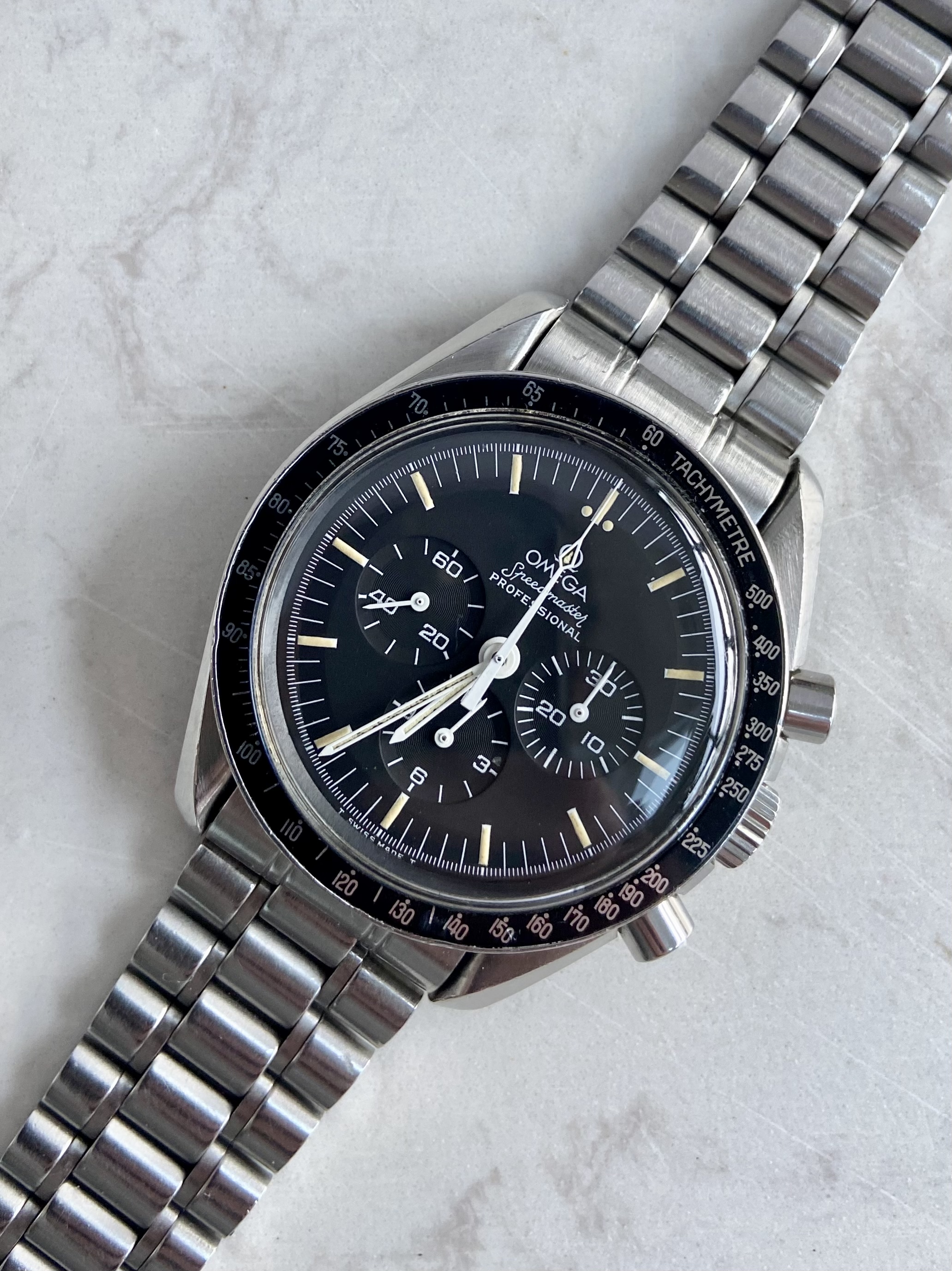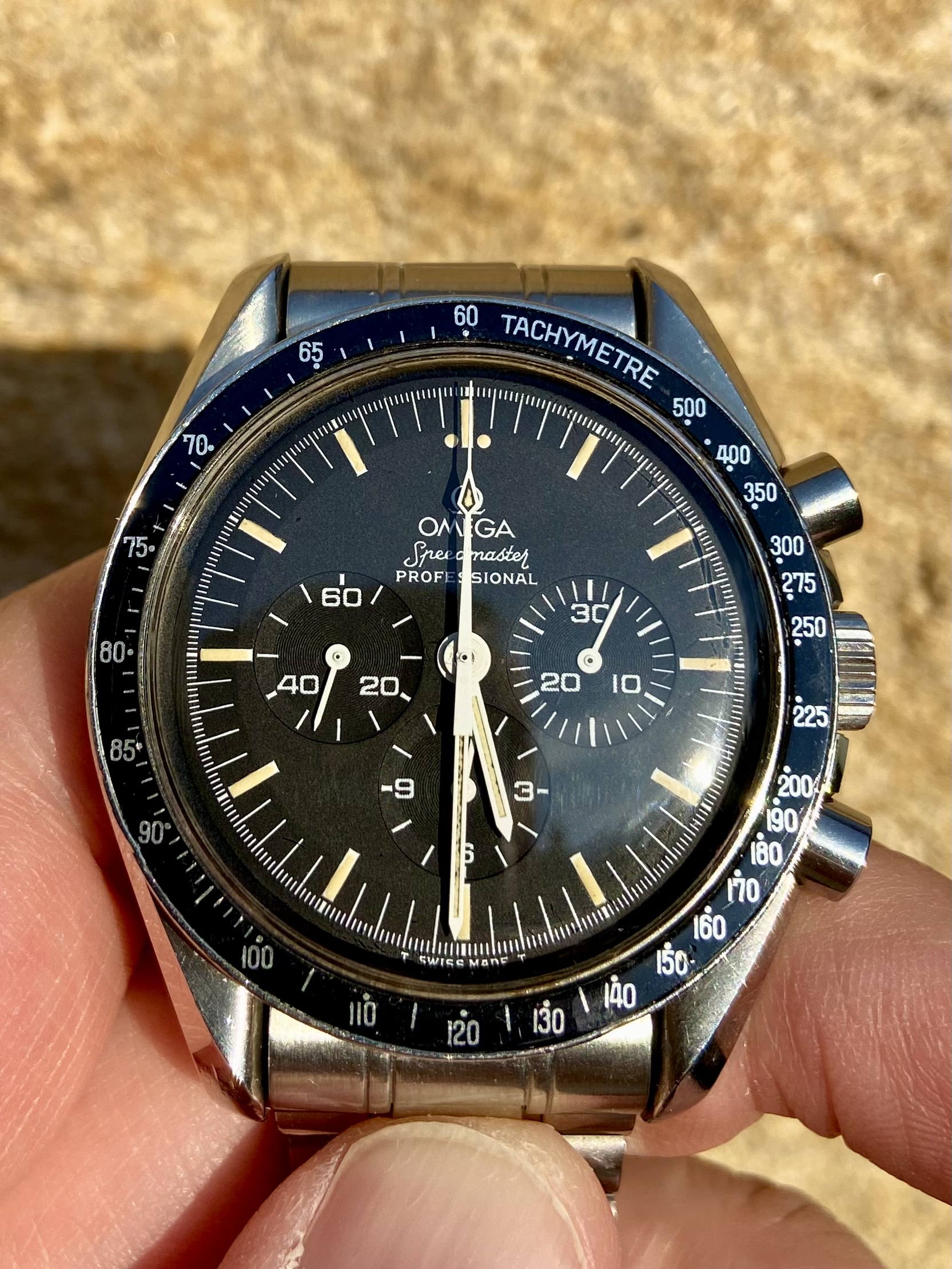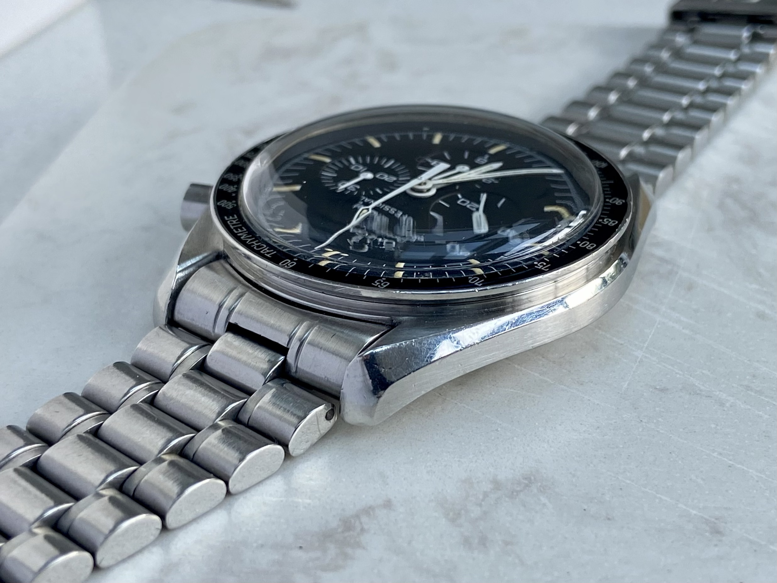 These 80’s/early 90’s Speedmasters often age wonderfully with attractive yellow lume and still retain the same bezel used in the 70’s.