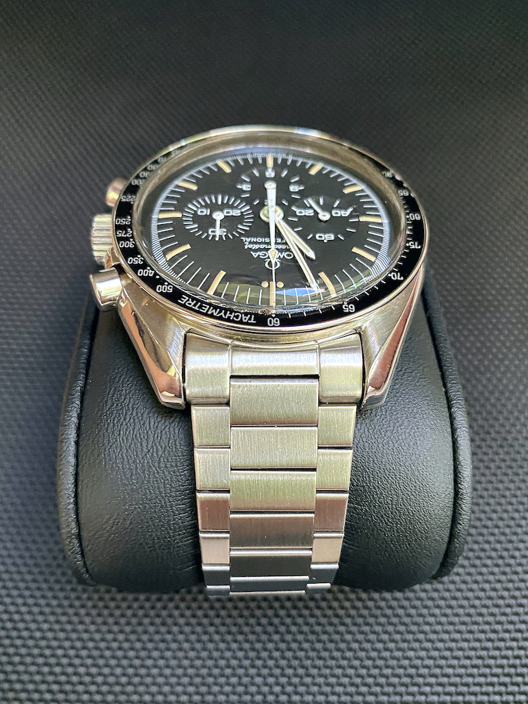 I am offering this watch on a Forstner (aftermarket) brushed flat link bracelet. Note: This is not an OEM Omega bracelet, and I have adjusted my asking price accordingly.