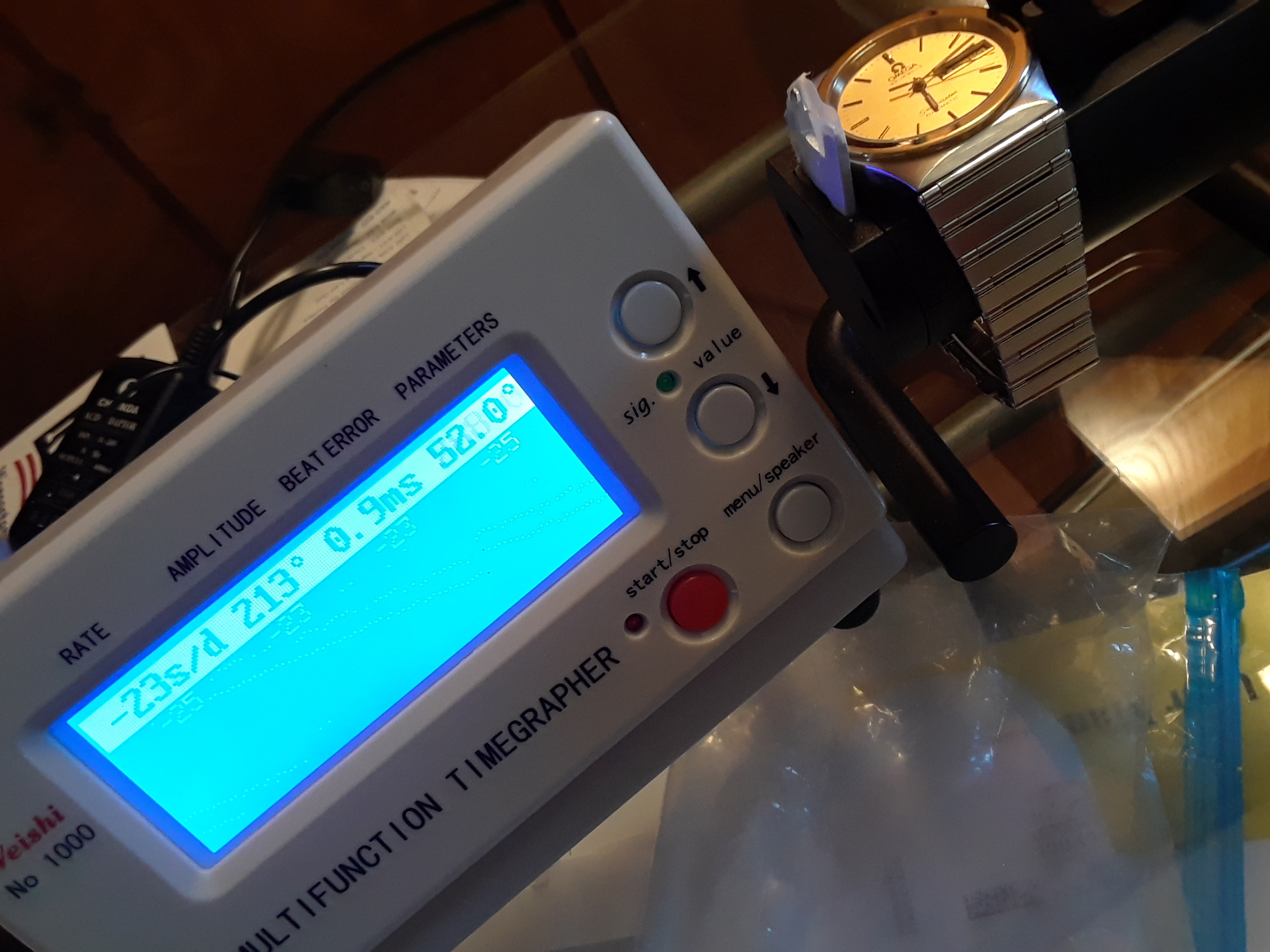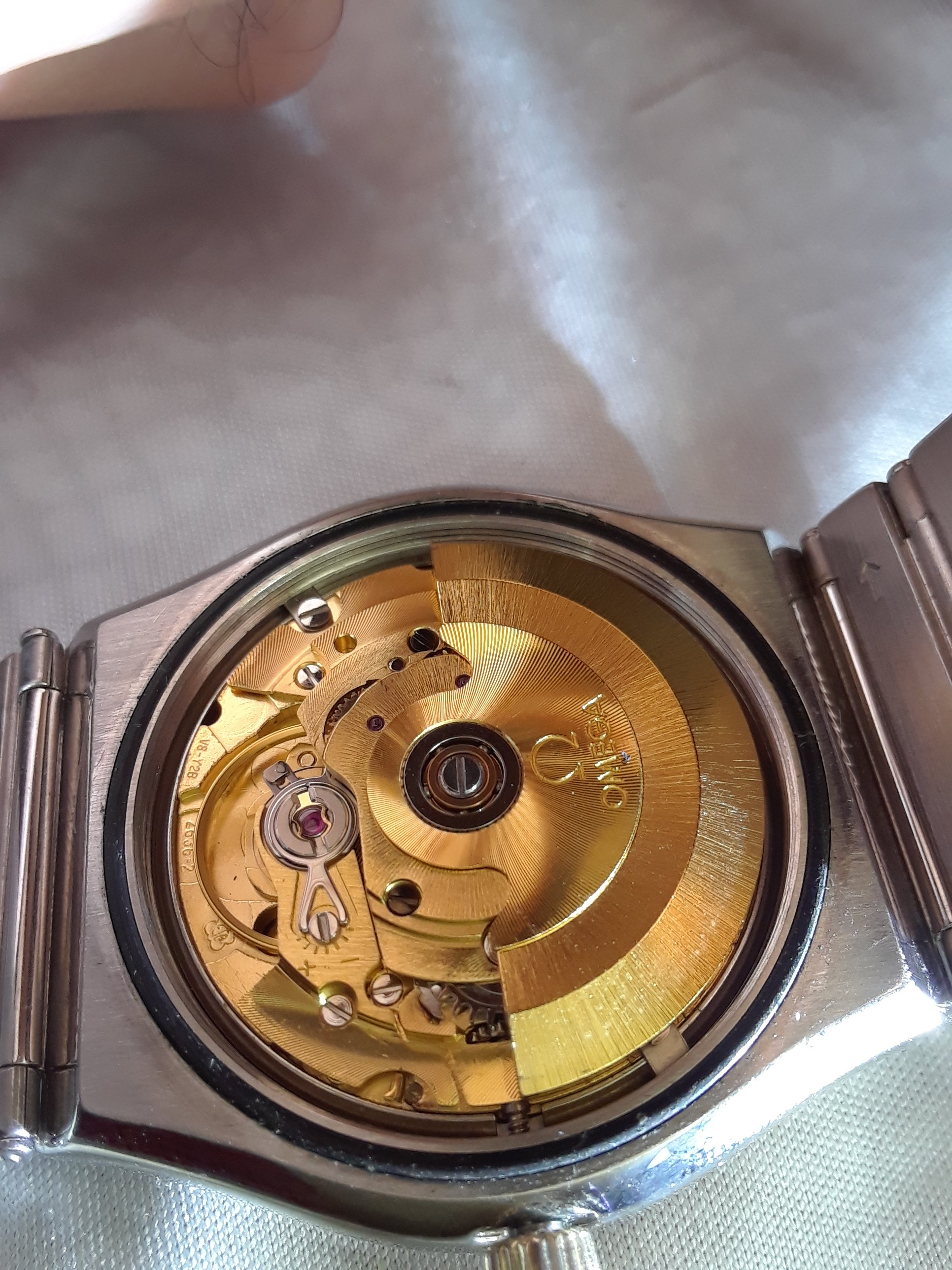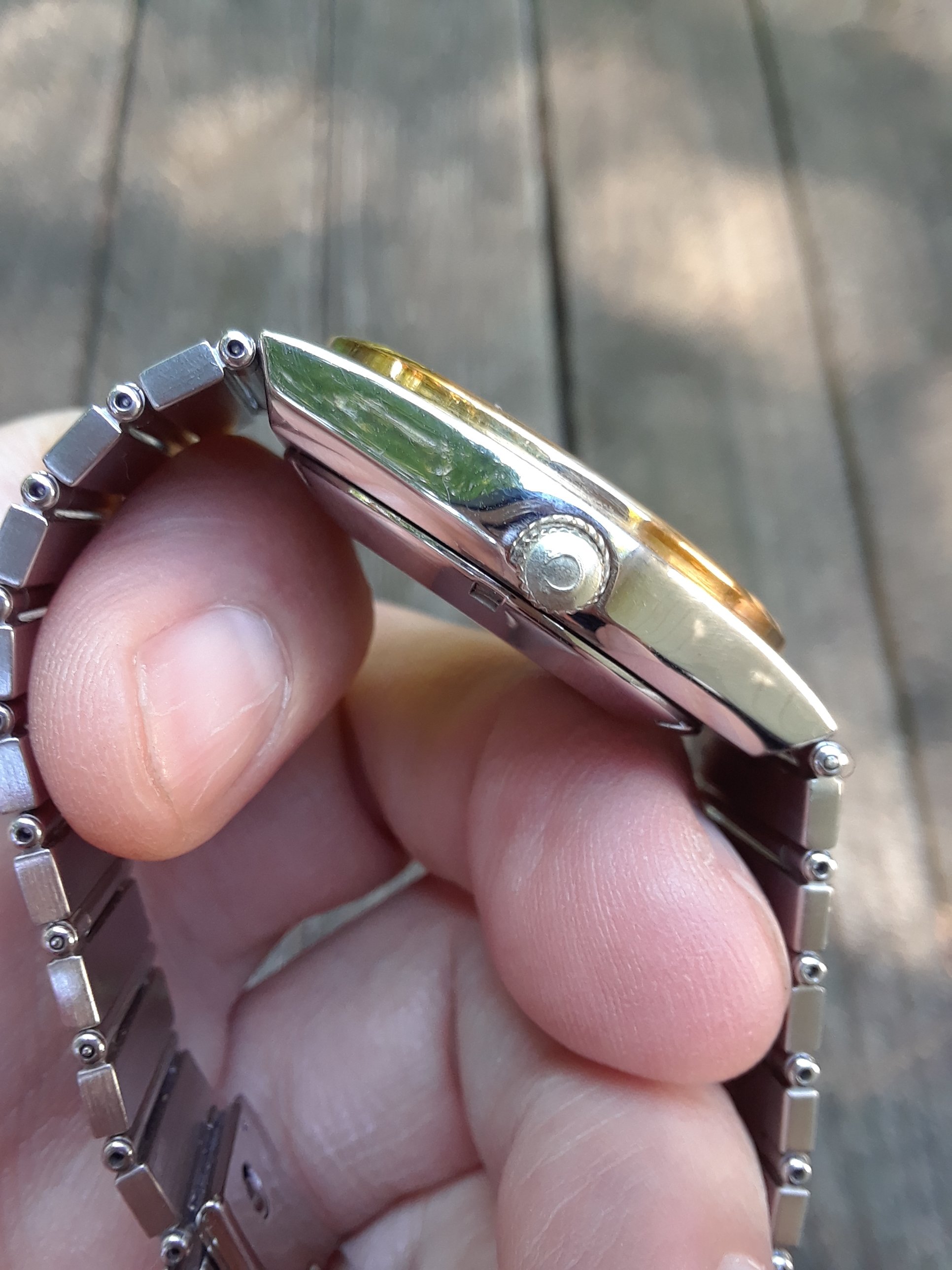 ·I'm here for a little help. I have a Seamaster Constellation 366.0884 on bracelet. The serial number starts with 5393 making it a 1991 model. The dial has a beautiful gold finish with the day/date in Japanese and English. The crystal has 2 chips and no Omega logo in the center, so I assume it is a replacement. Everything else is all original as far as I can tell. I found a photo of the same model online in really bad condition, but it had the same gold bezel. The bracelet fits my 6 1/2 inch wrist and I do have 2 additional links (but I only have 1 of the 4 endcaps for those links).