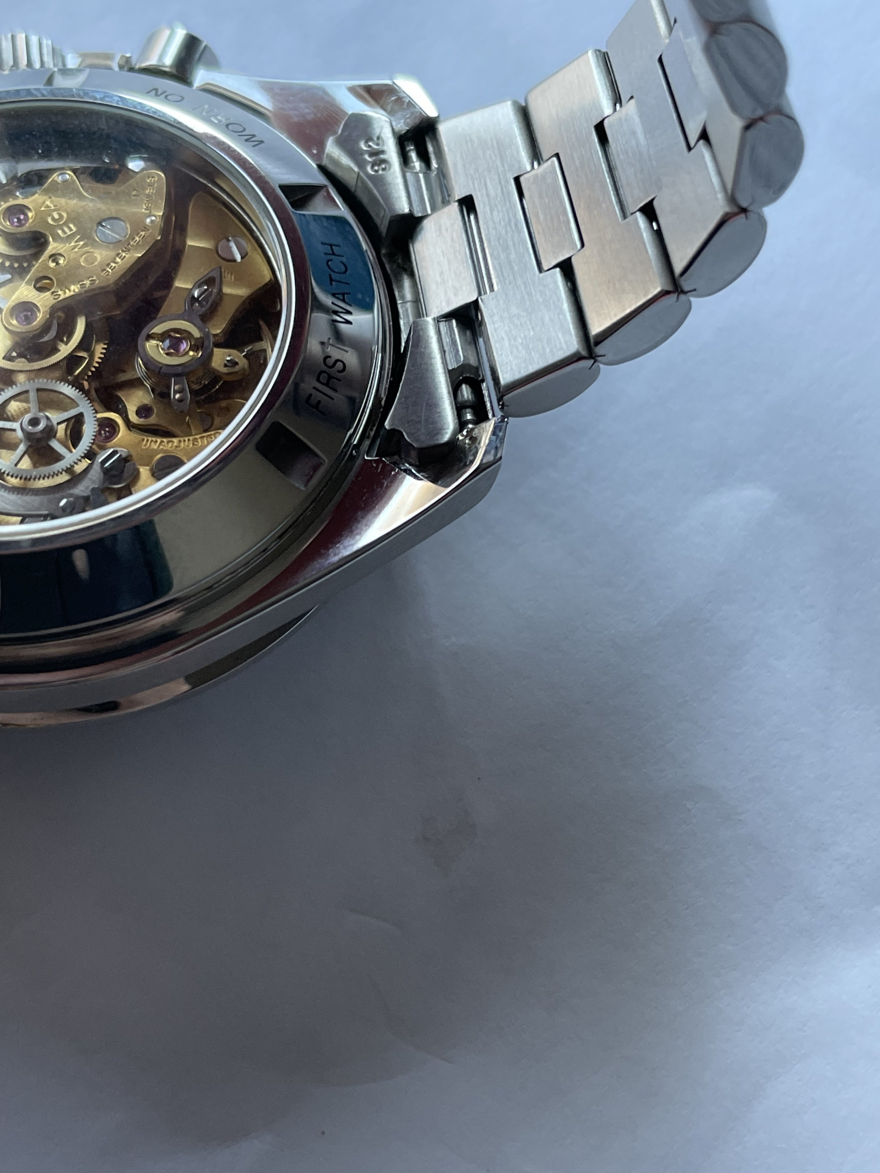 After wearing it for a week or two I noticed that one of the end links was slightly loose due to the spring bar not being fully fastened in the lug hole. I brought it in to an Omega AD to have the spring bar replaced. After trying to replace it for quite some time the AD explained that the spring bar did not properly line up with the lug hole. He assumed that this was perhaps not the appropriate bracelet reference for my watch.