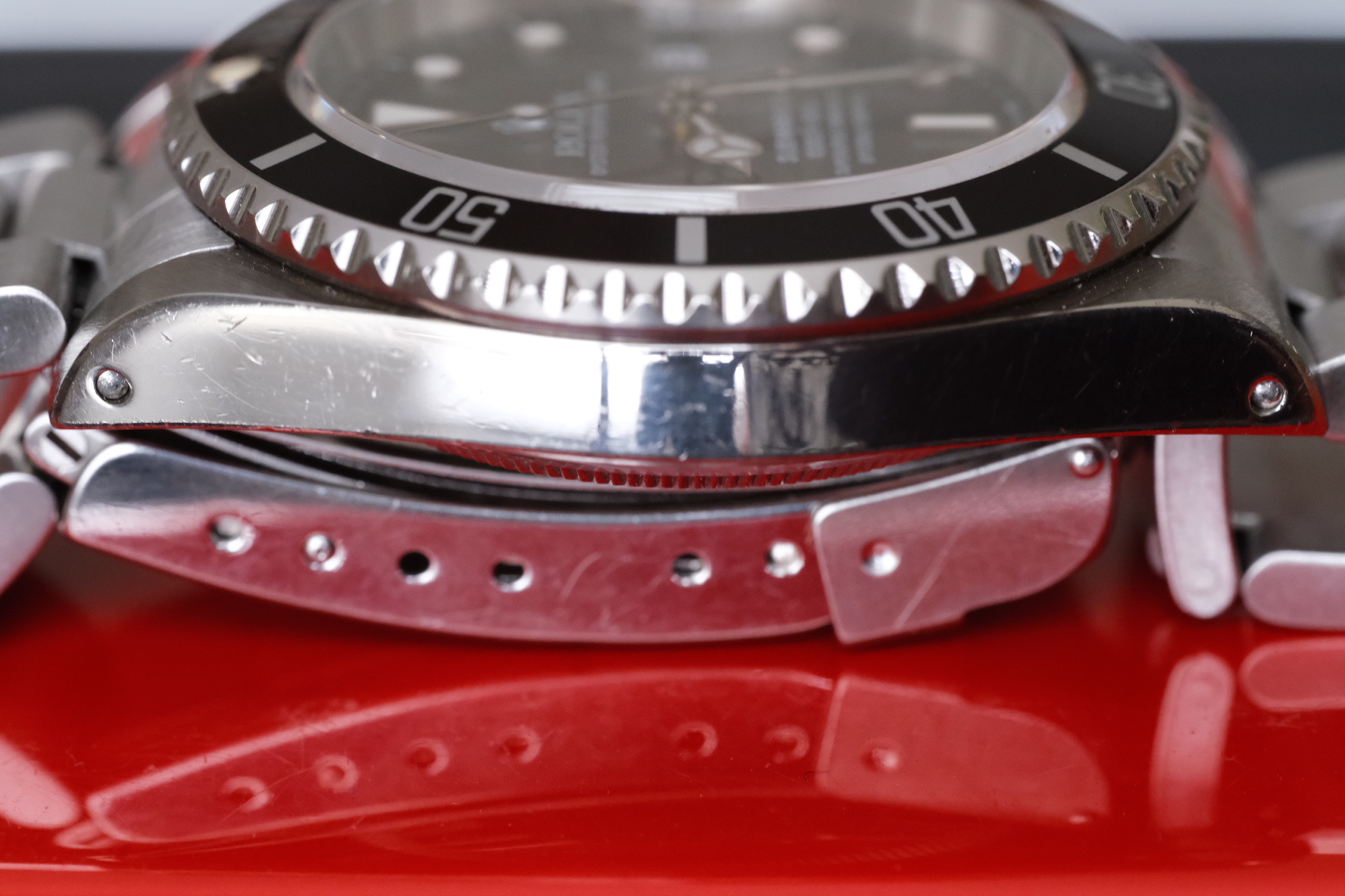 CASE: Crisp and clean 40mm case with great original lines, nice brushing on the thick lugs, with them beautiful chamfers! Wear throughout, as you would expect for a nearly 30 year old watch, mostly seen on the polished sides, which would clean up nicely with a light polish, but I always opt to leave original and untouched. (This under direct light through a high powered macro lens.) All in presents beautifully, including that perfectly aged tritium bezel pip and original caseback sticker!