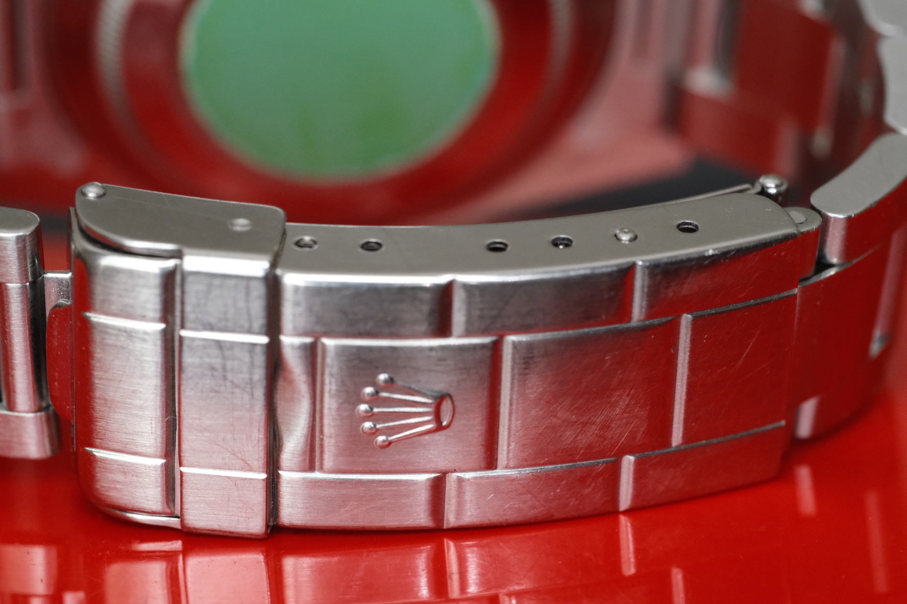 BRACELET: Comes on its original, correctly date stamped 93150 Rolex oyster bracelet. Has 10 links on it right now, sized for my 6.6 inch wrist, with room in the clasp and a spare link, so total of 11 links should go to about 7.25 inches. Also has light wear throughout, but also presents beautifully.