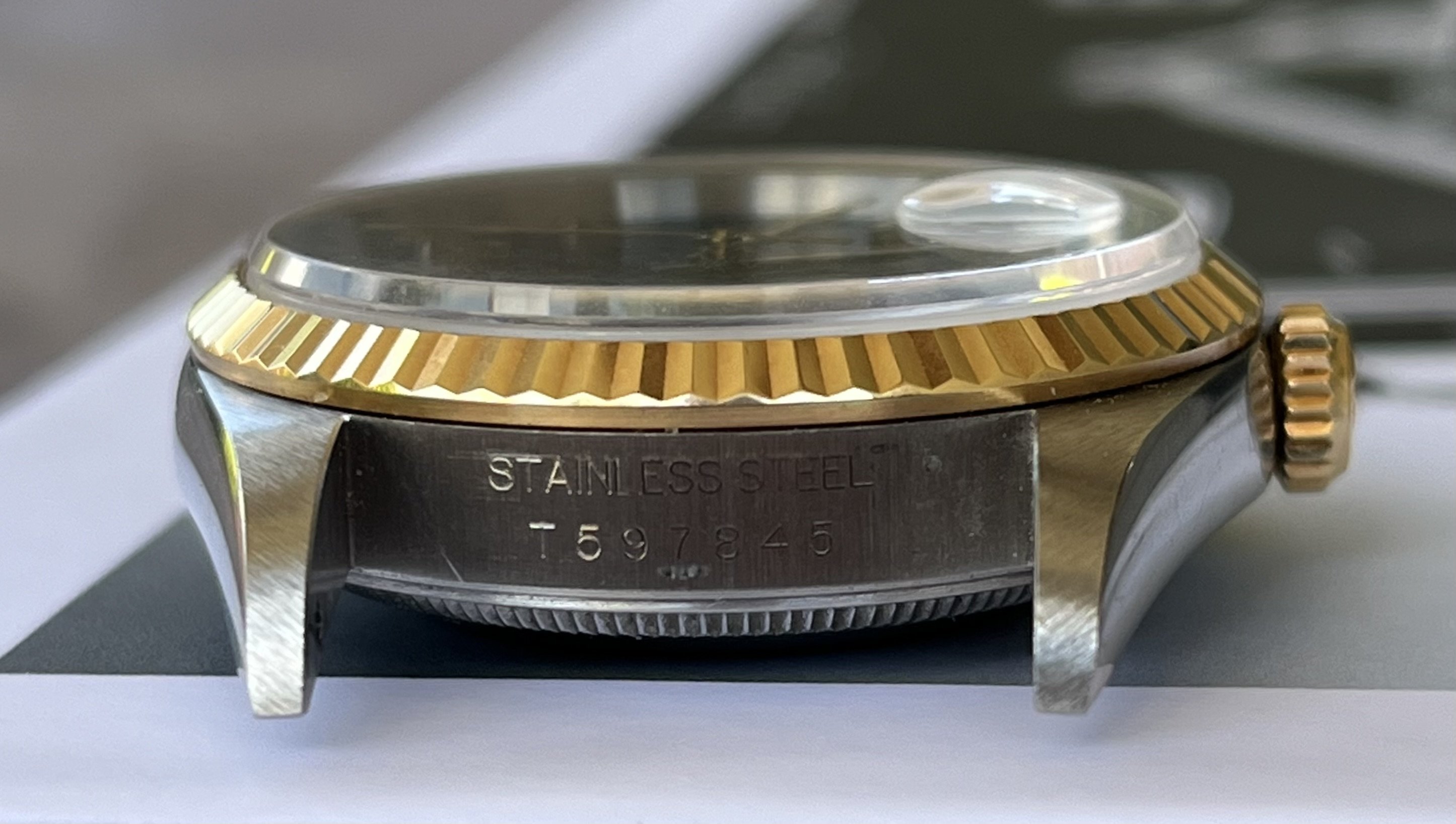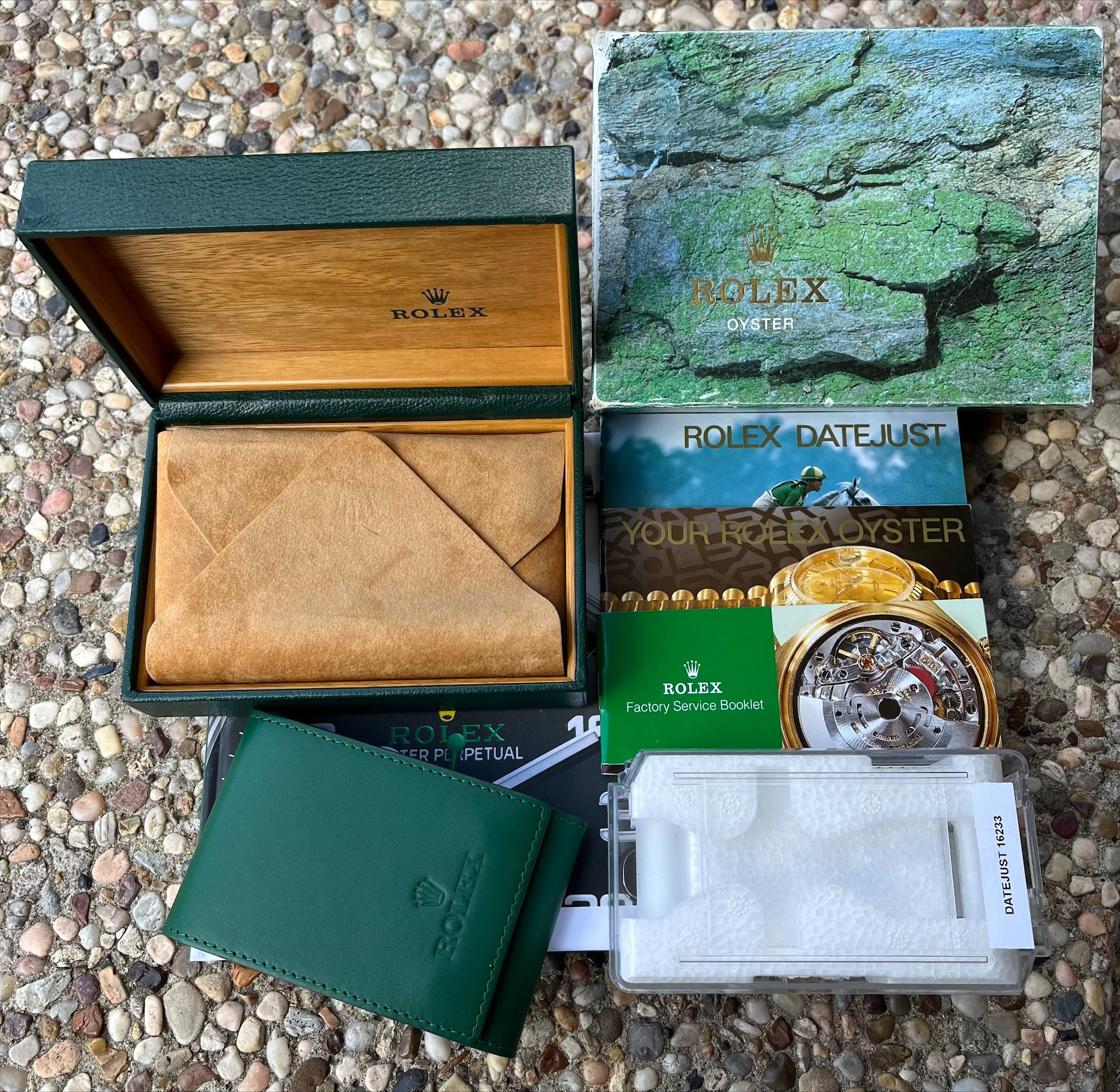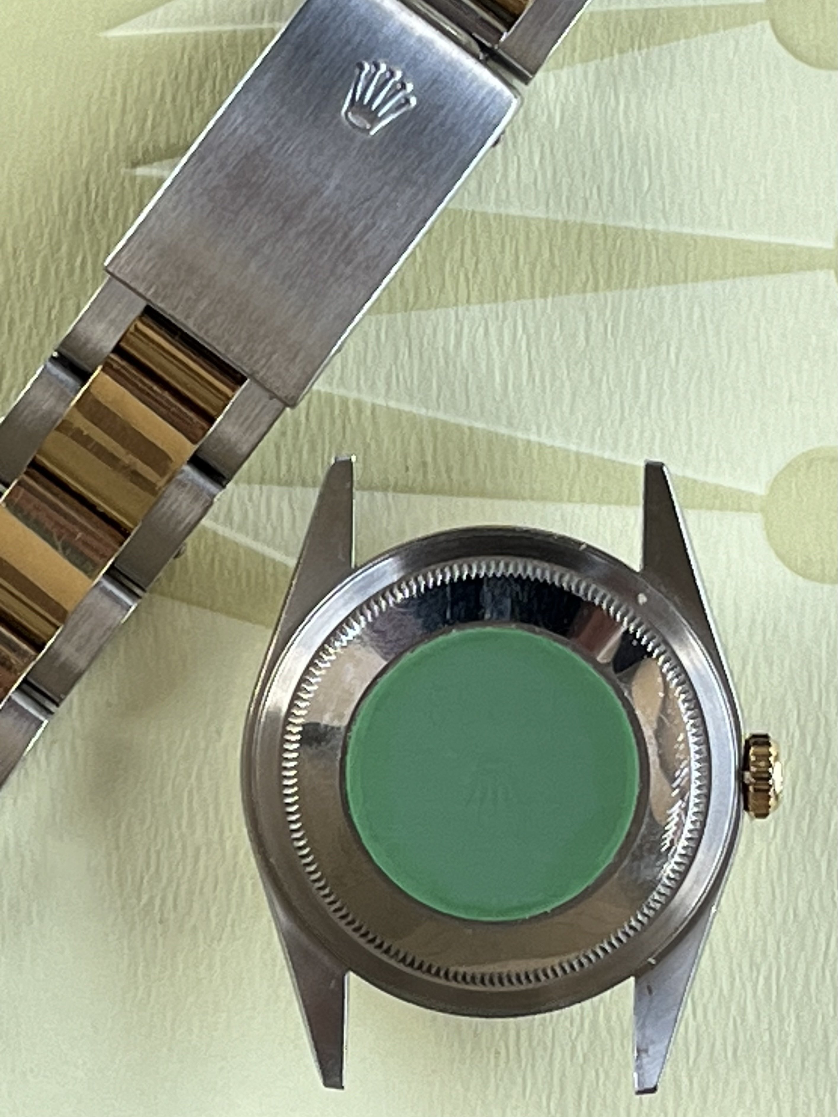 Overall Cosmetic Condition: Unpolished. No chips or scratches on the crystal. There are a few light hairline scratches on the case sides and consistent with very limited use. The fluted bezel is in excellent condition. This watch came from the original owner who bought it for himself to celebrate his retirement. Only worn on special occasions. It has spent a great deal of time in the safe. The Oyster Bracelet is less common than the Jubilee on 16233. The bracelet is original to the watch and in excellent condition.