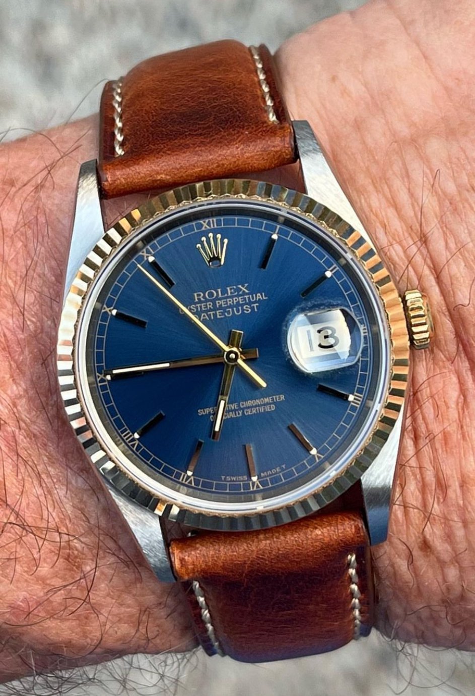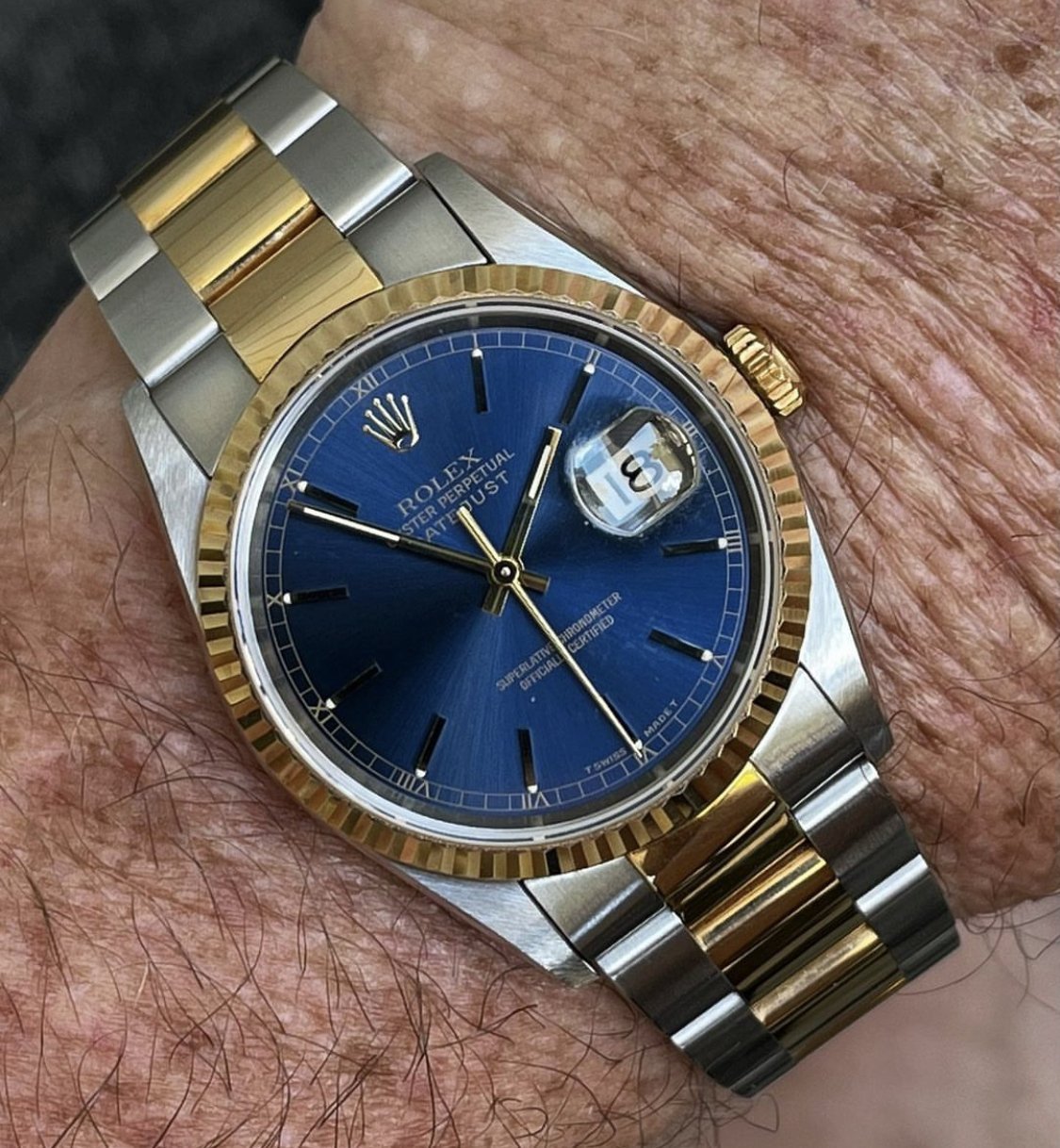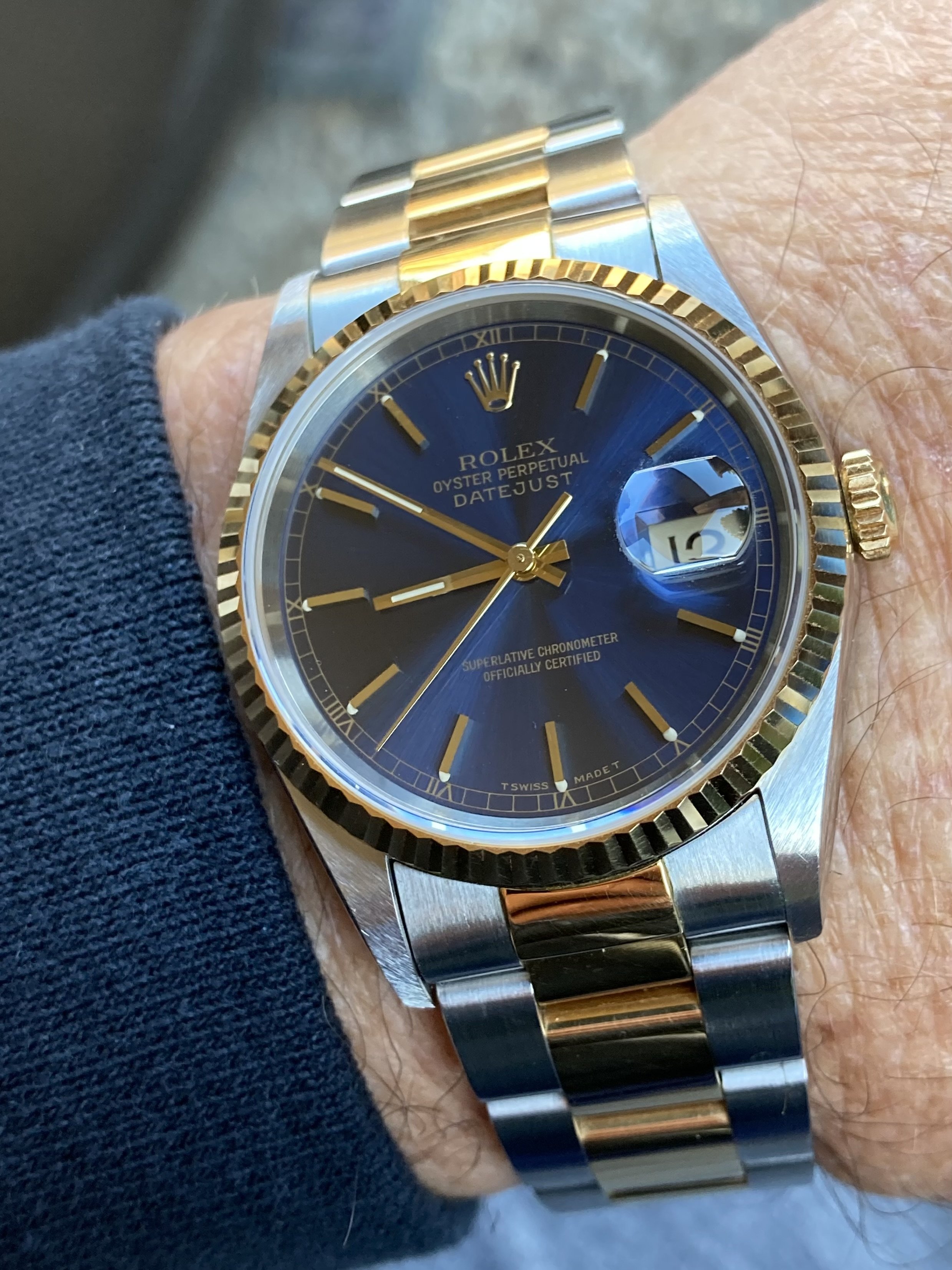 Overall Cosmetic Condition: Unpolished. No chips or scratches on the crystal. There are a few light hairline scratches on the case sides and consistent with very limited use. The fluted bezel is in excellent condition. This watch came from the original owner who bought it for himself to celebrate his retirement. Only worn on special occasions. It has spent a great deal of time in the safe. The Oyster Bracelet is less common than the Jubilee on 16233. The bracelet is original to the watch and in excellent condition.