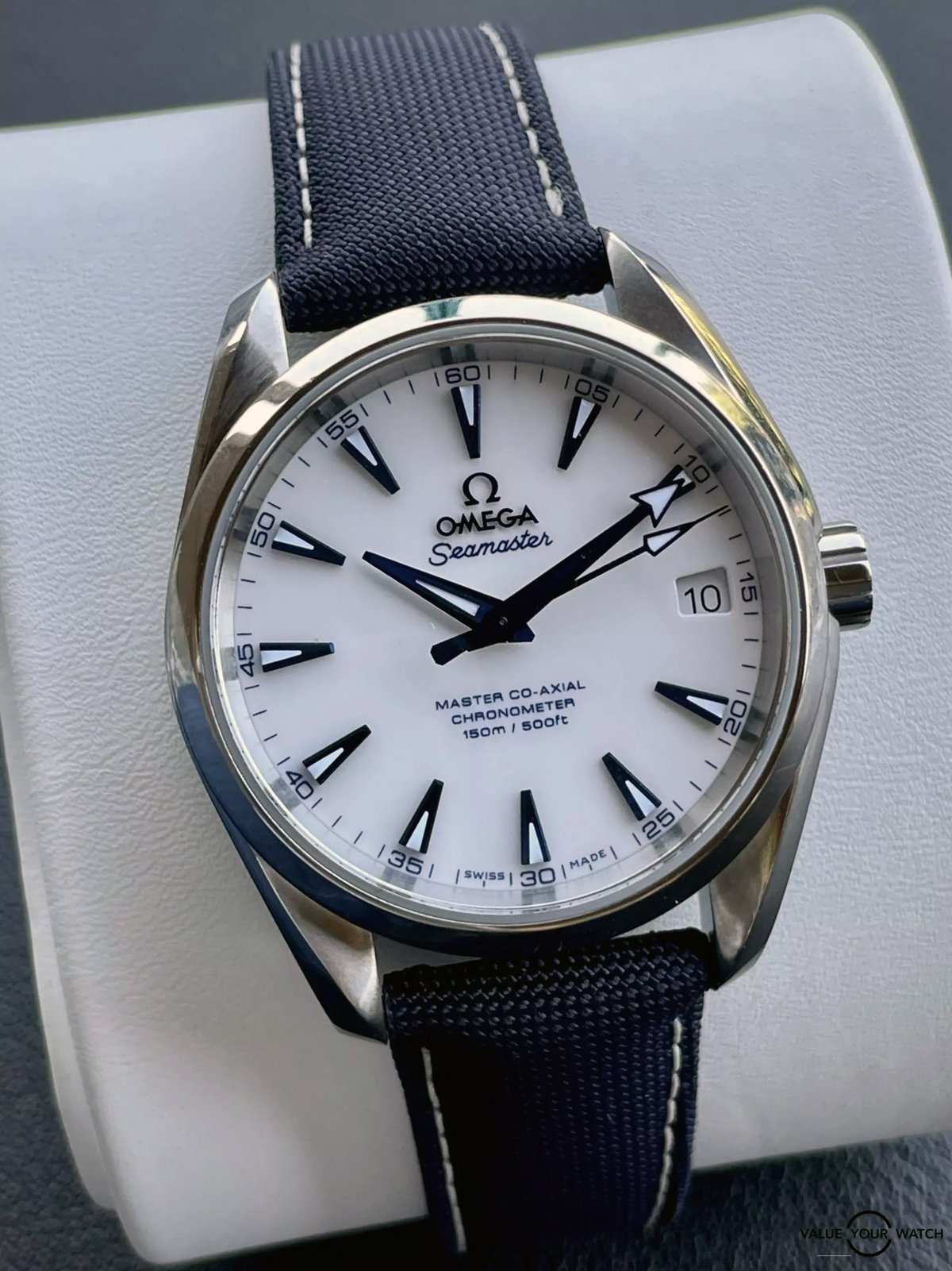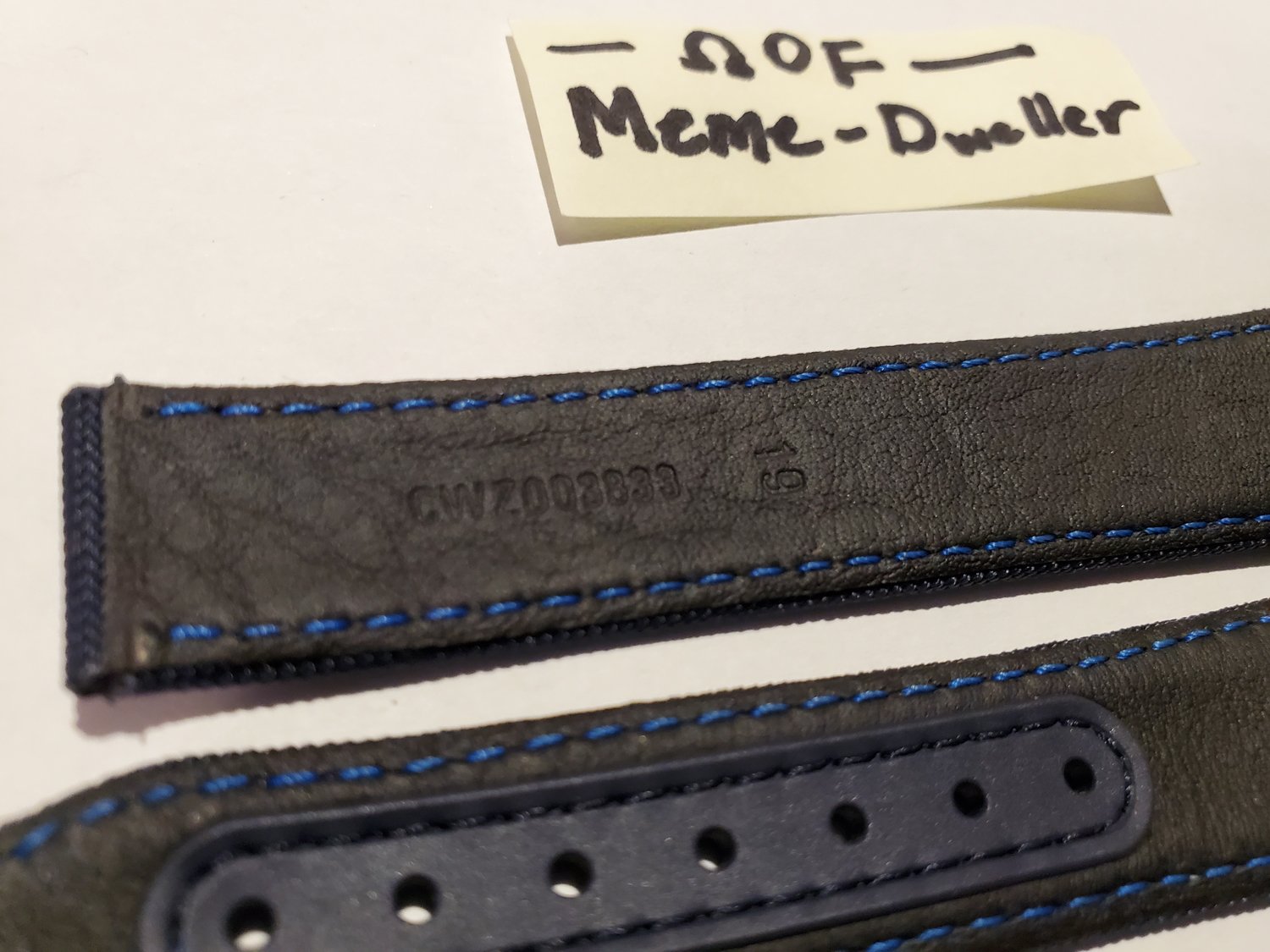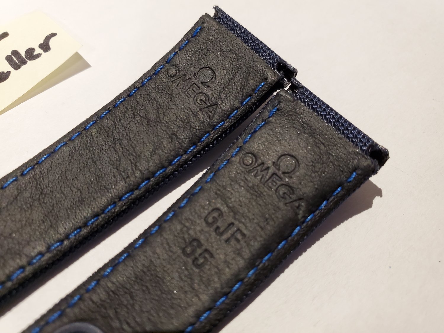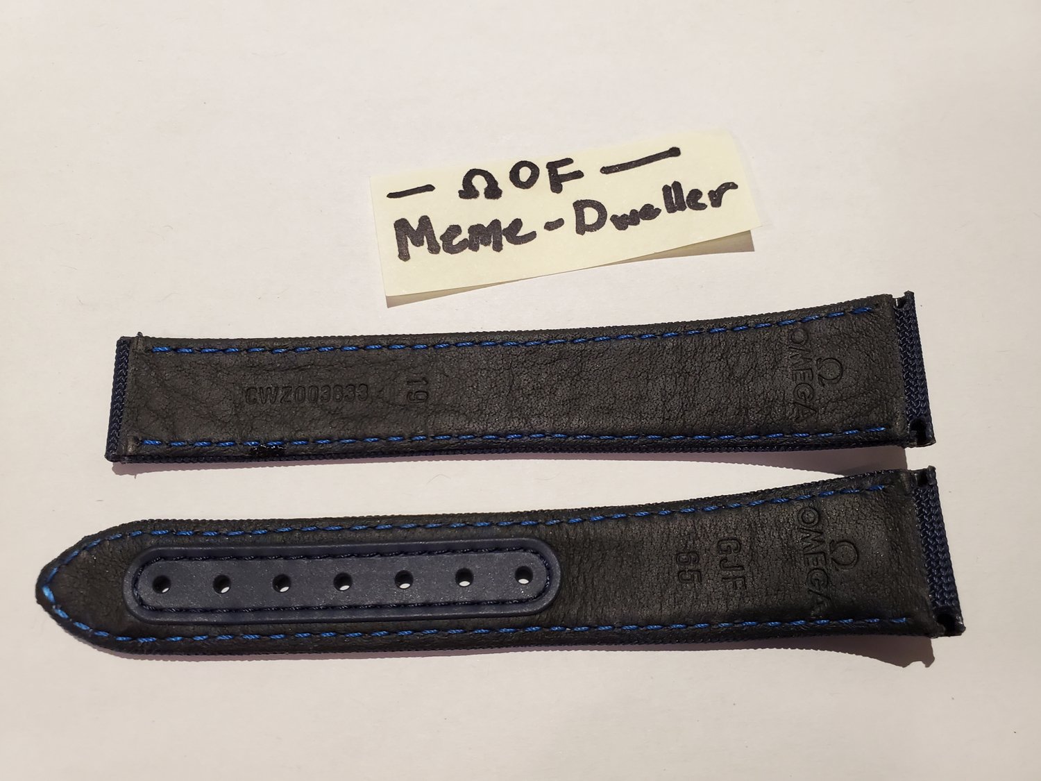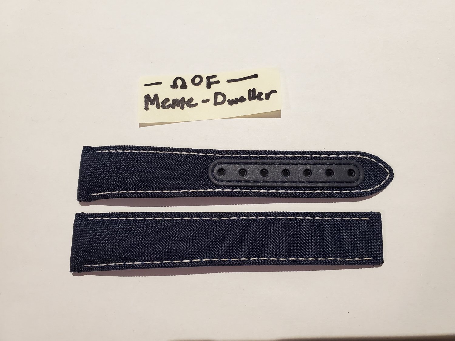 Up for sale is a new condition genuine Omega dark blue nylon/codura strap w/ white stitching. It has black cowhide leather w/ royal blue stitching underside. The lug width is 19mm and should fit most watches with that lug size like the 38.5mm Aqua Terra and 39.7mm FOIS Speedmaster. Regular/Standard length. Requires a 16mm clasp (not included). No spring bars included.