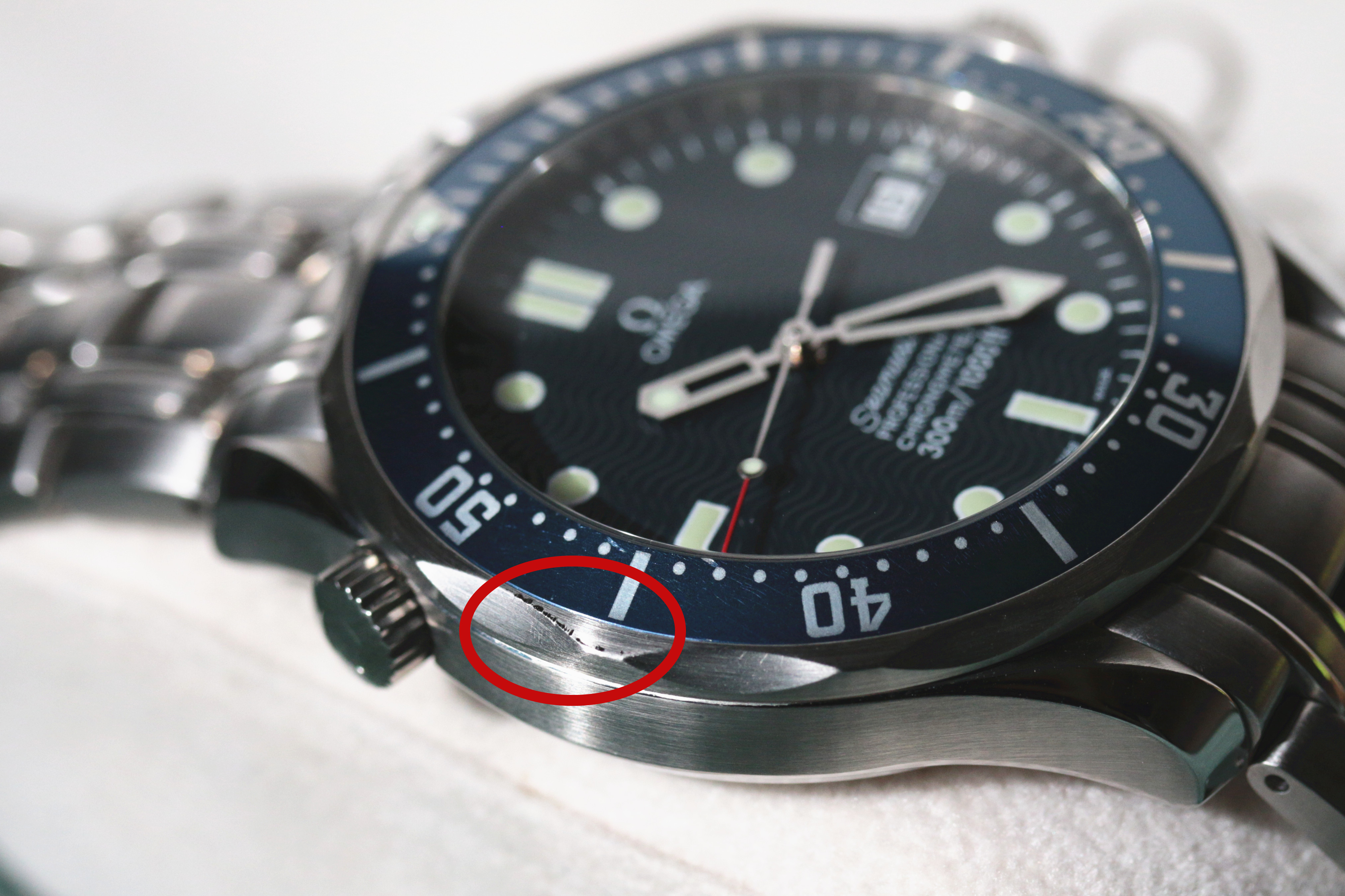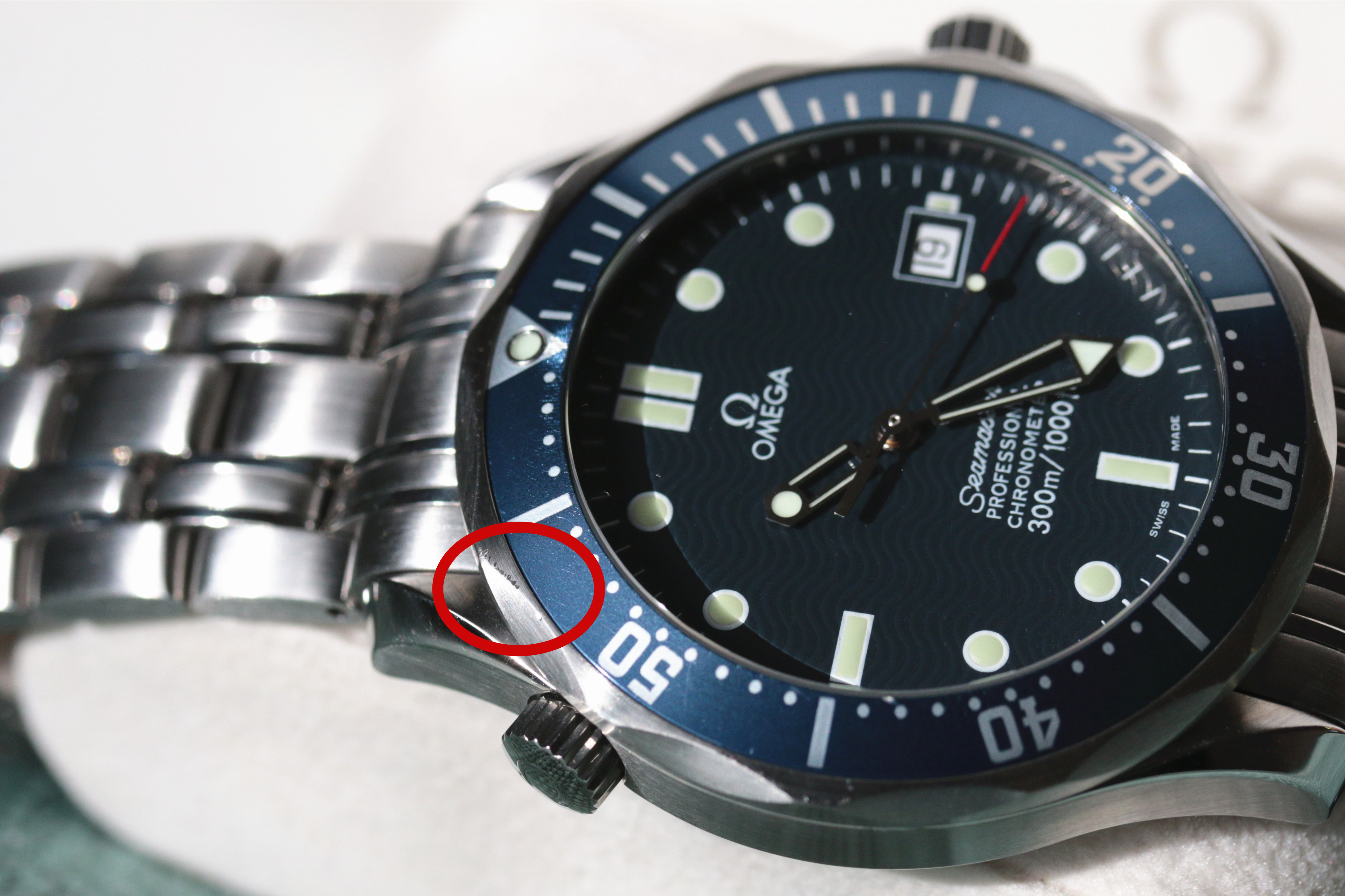 - Bezel: Good condition without much fading. There are 2 scratches at the edge near the 45 and 55 minute markers, see pictures.