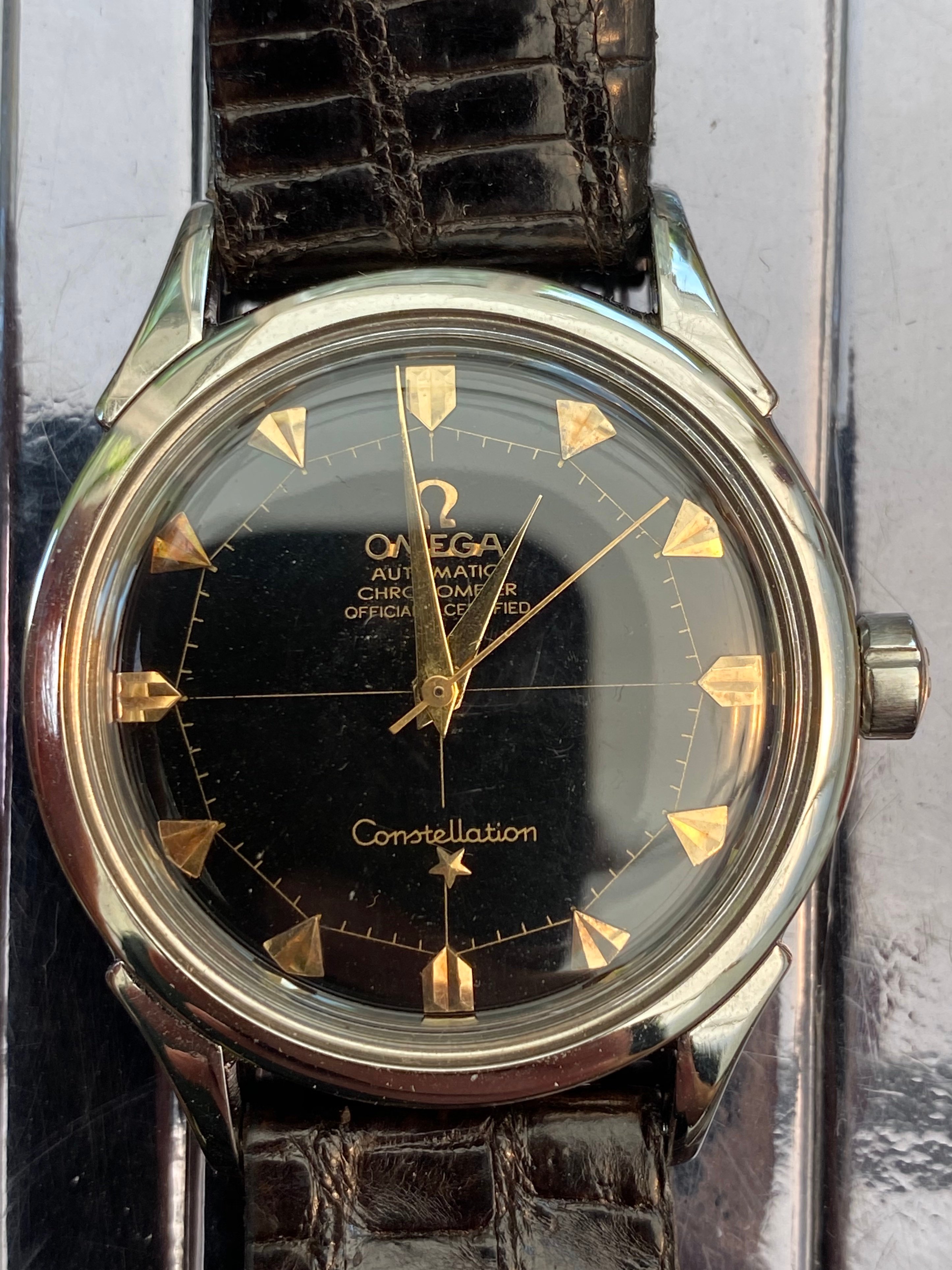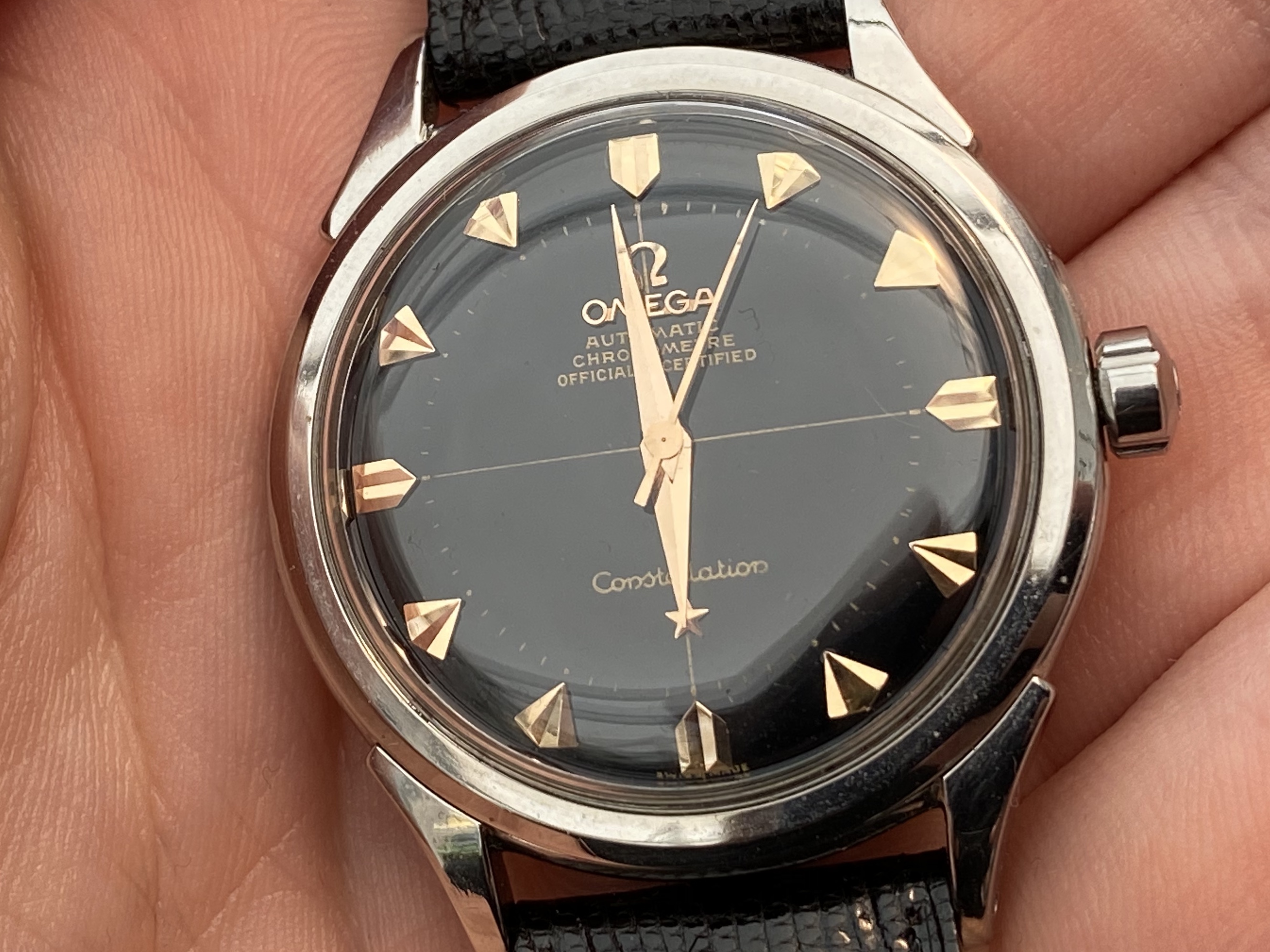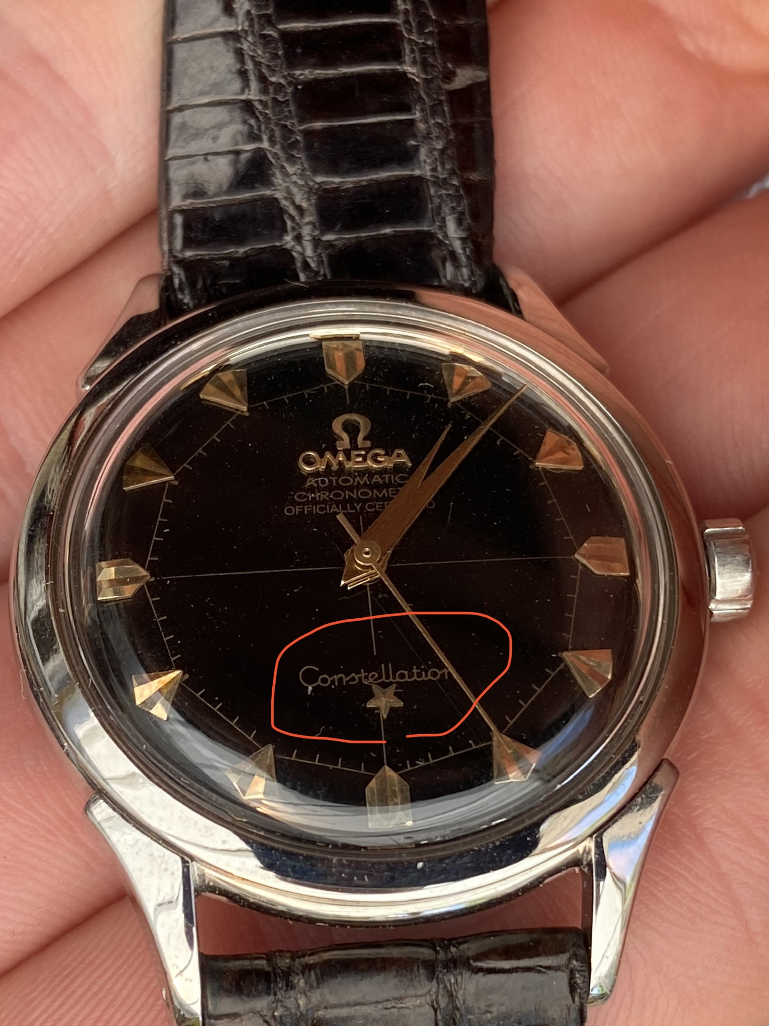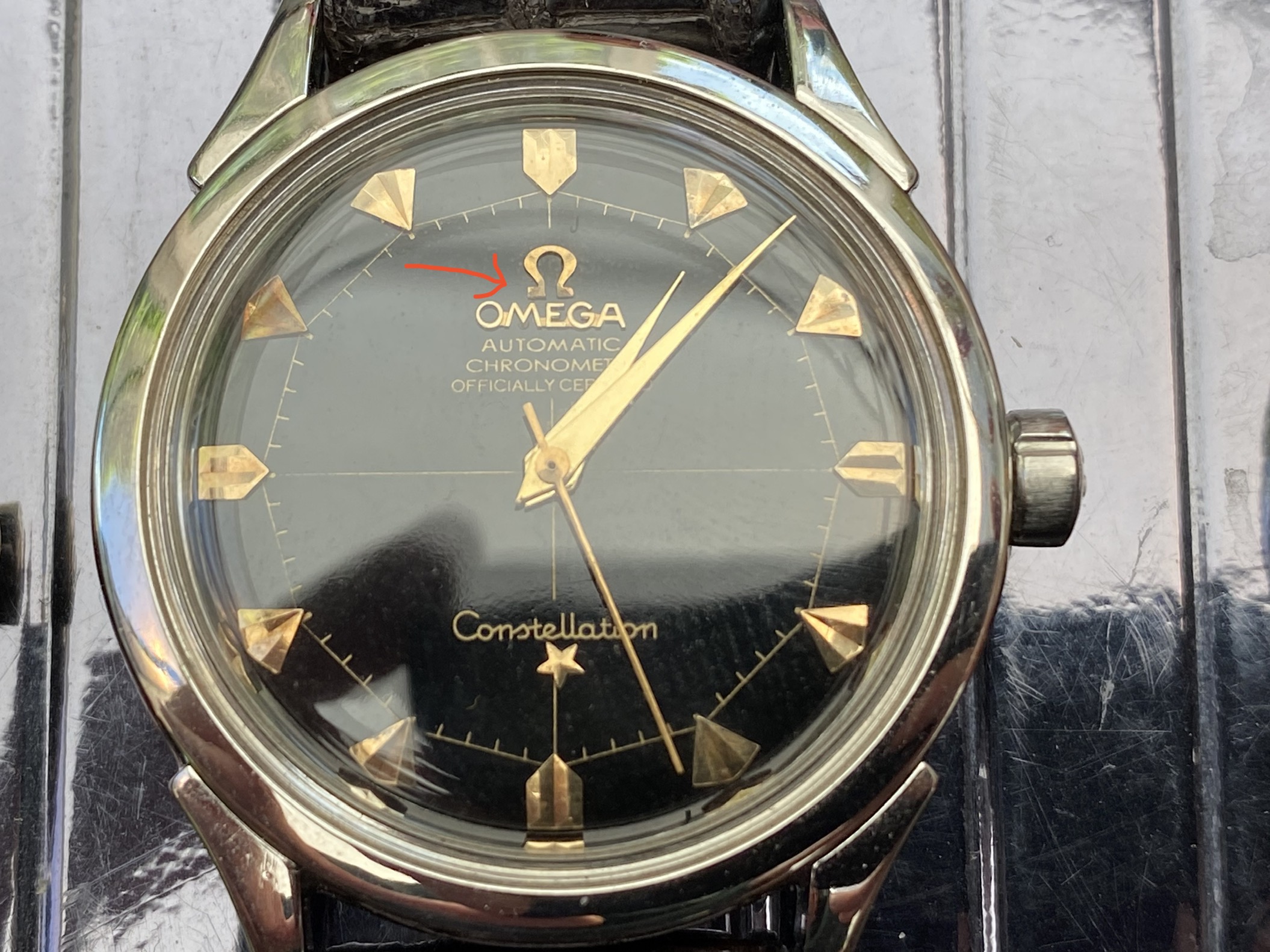 My issue here is that the line of the cross doesn’t go through the Omega Automatic Chronometer etc. at the top - scrolling through pictures of other Pie Pans, the only two I could find that didn’t have the line all the way through those words were ones even I could identify as redials. And if I look closely at the Omega logo the bottom left part seems to have a sharper corner than the bottom right part, it’s not symmetrical.