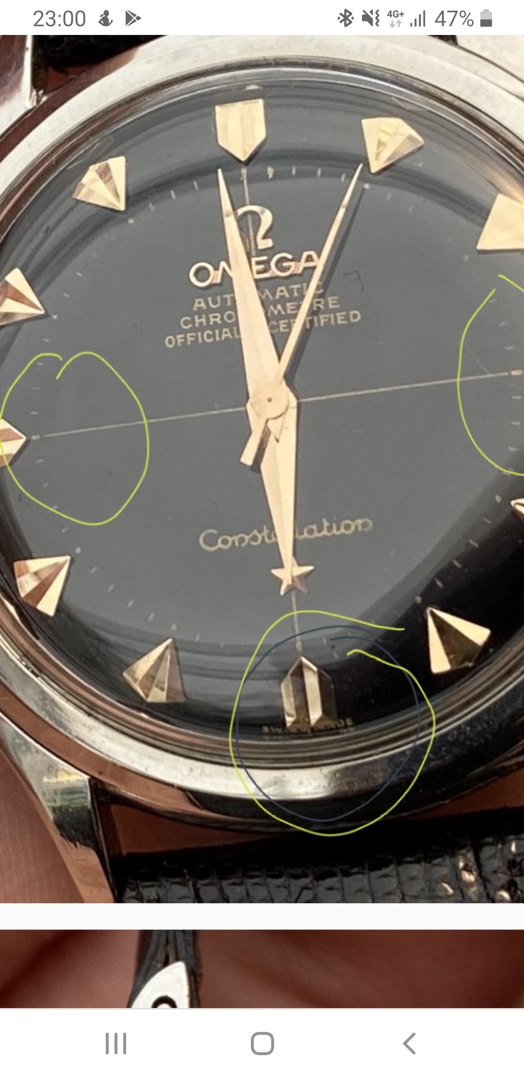 Positioning of the hands is a bit unfortunate here, I’ll add two more picture in a second. Bit of corrosion around the movement is probably not too uncommon, the dial itself looks very shiny - possibly too shiny. What puts me off is this:
