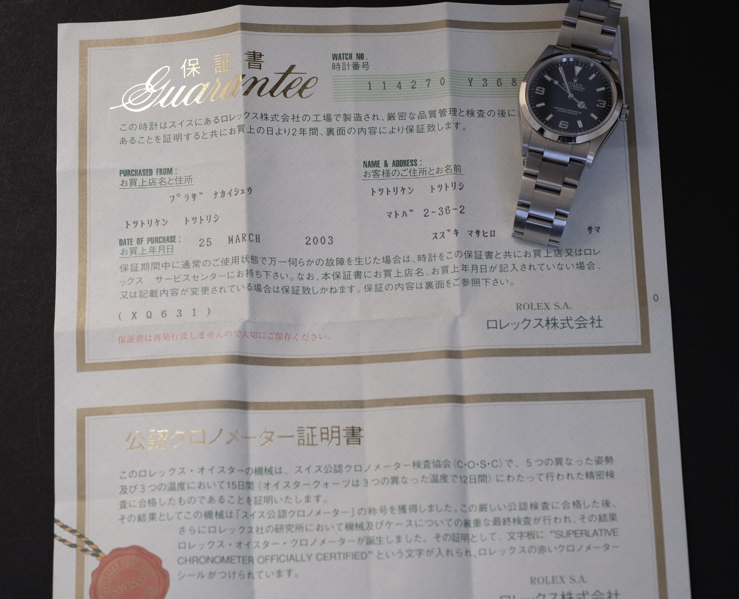ACCESSORIES: Comes with original Rolex papers (showing a 2003 sales date… ah yes, it used to take a year or more for ADs to sell a Rolex!)