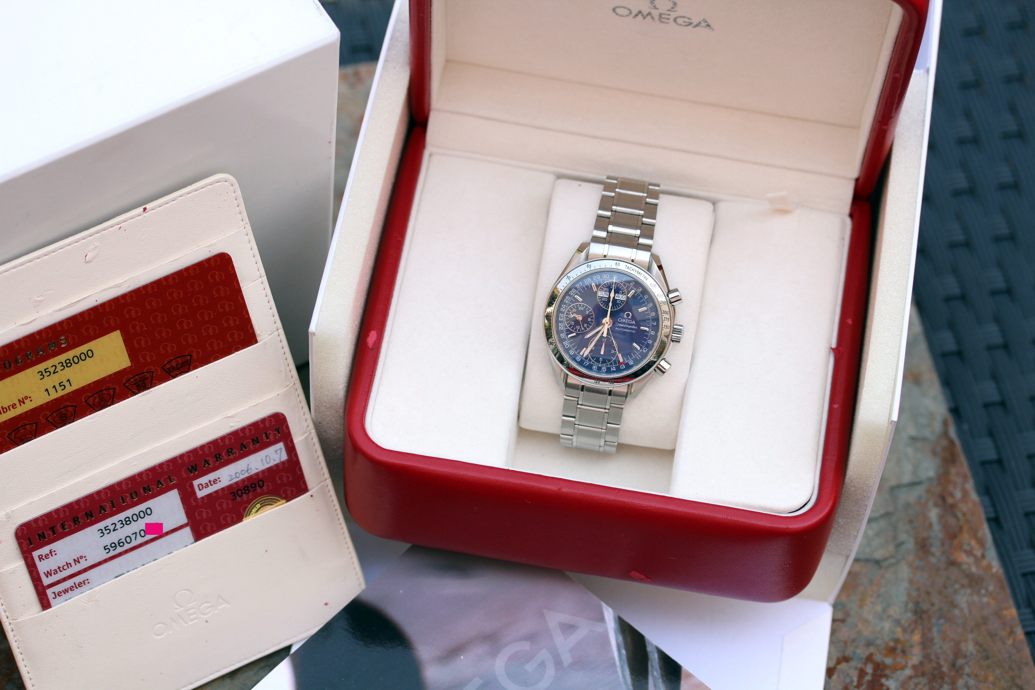 Watch comes with Omega boxes, manual book, pictograms and warranty cards. Warranty card is dated in 2006 and AD stamped.