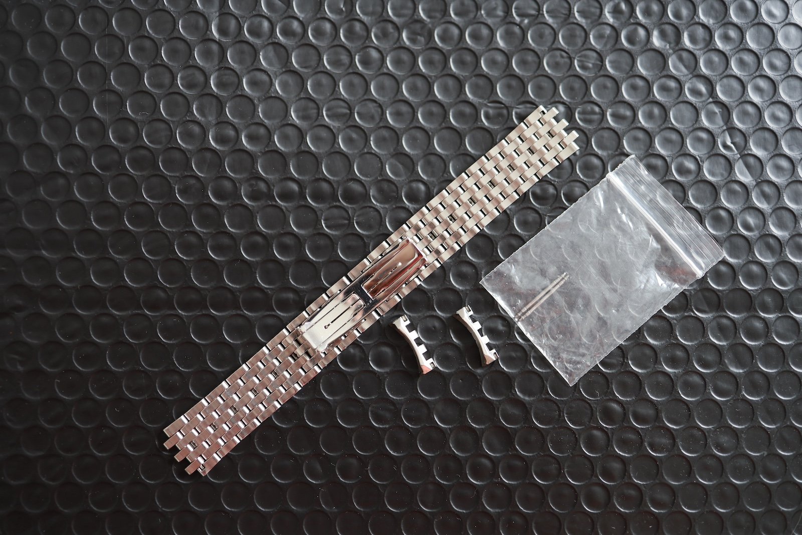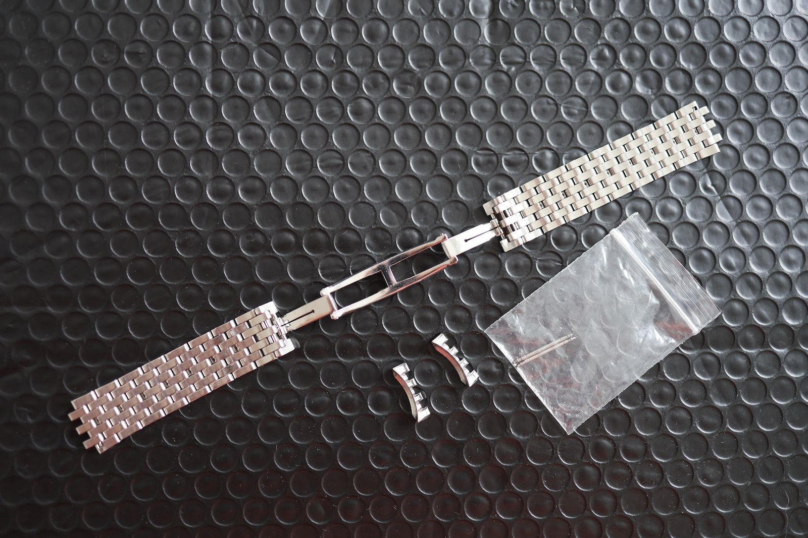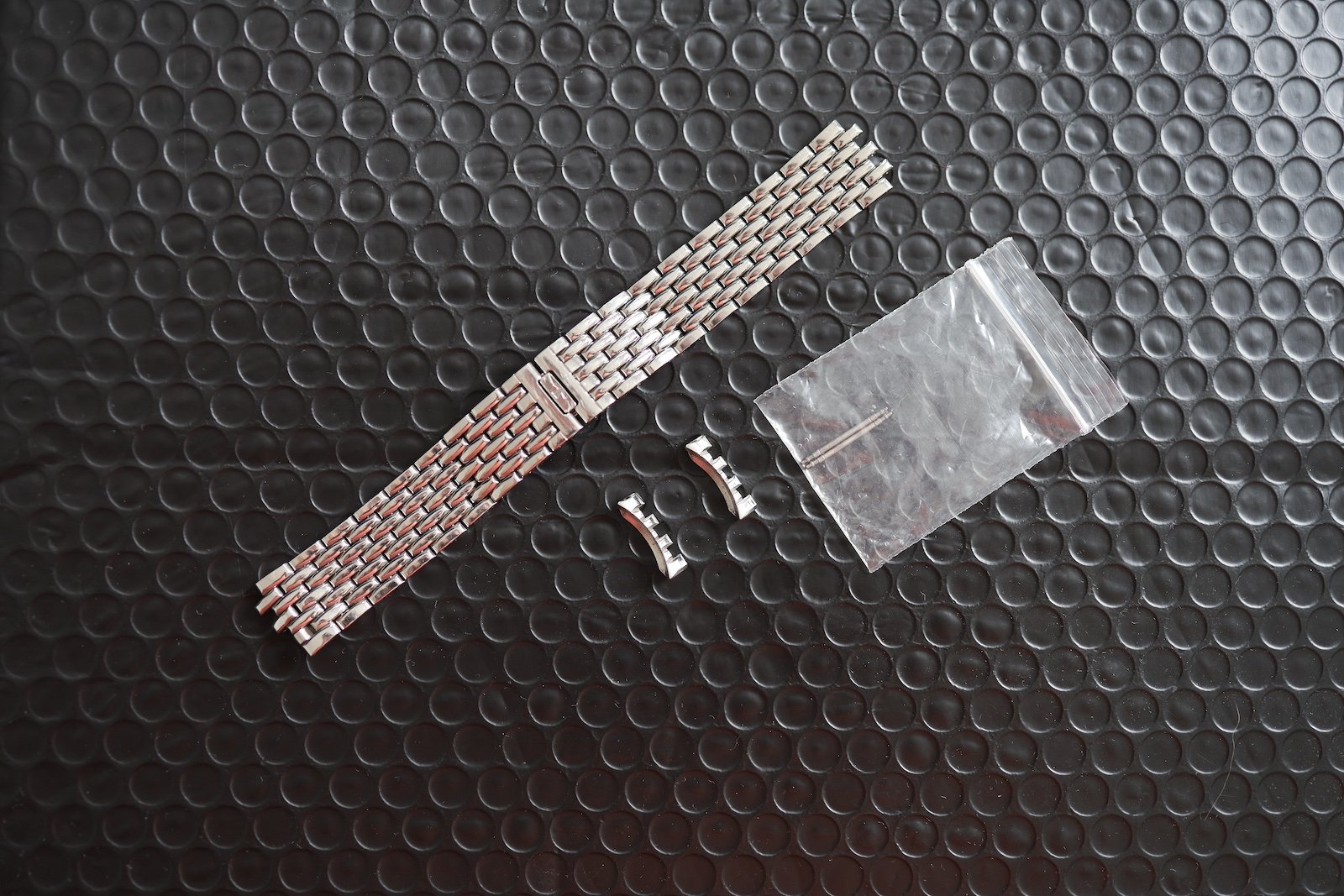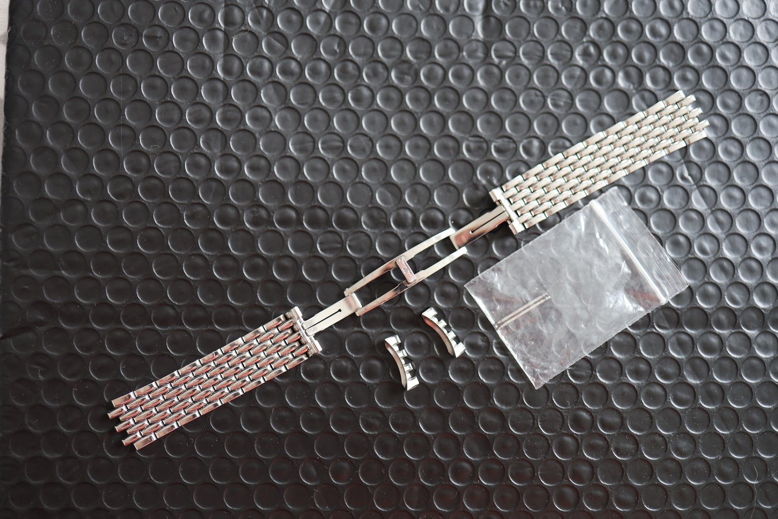 I have an 8" wrist, so rather than pay £230 per link for additional links, I bought a 16mm JLC buckle (£165) from the Bond Street Boutique, and a custom made 19mm XL strap in "hermes" calfskin leather from David at the Strap Tailor - both the strap and the buckle will come with the watch, they have had 5-10 wears in total.