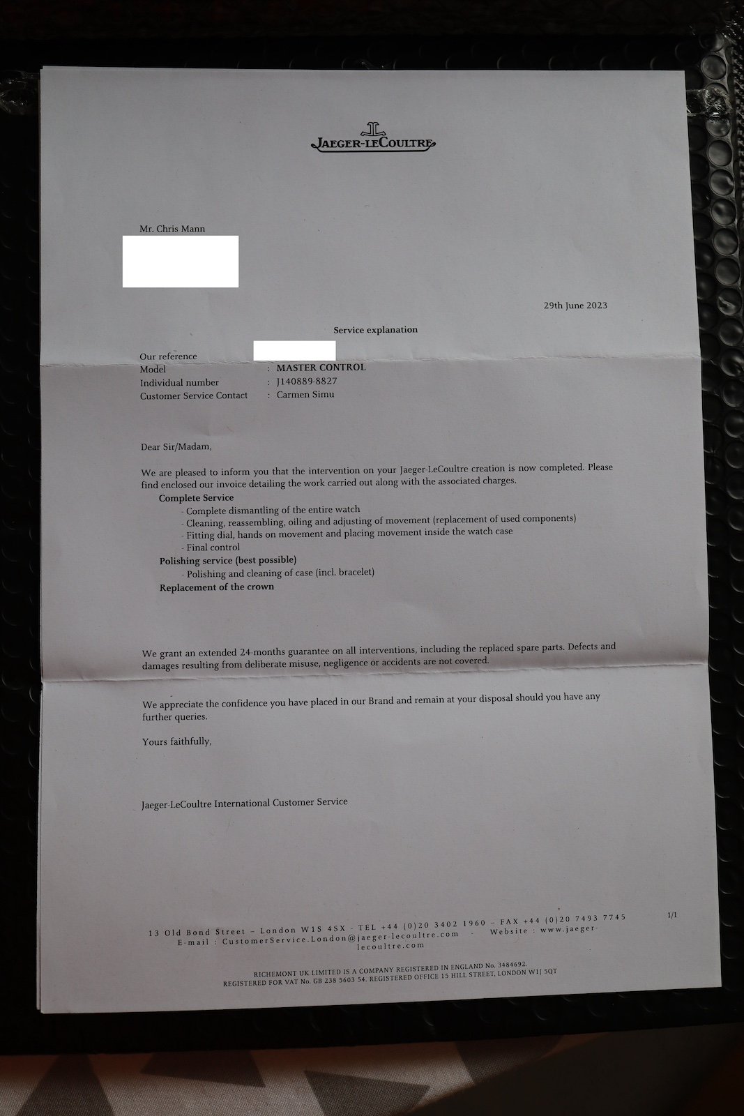 The June 2023 service includes a 24 month warranty, which runs until June 2025. At this service, the watch received a full mechanical service, a case clean and polish, and a new crown. The bracelet was ultrasonically cleaned, but not polished.
