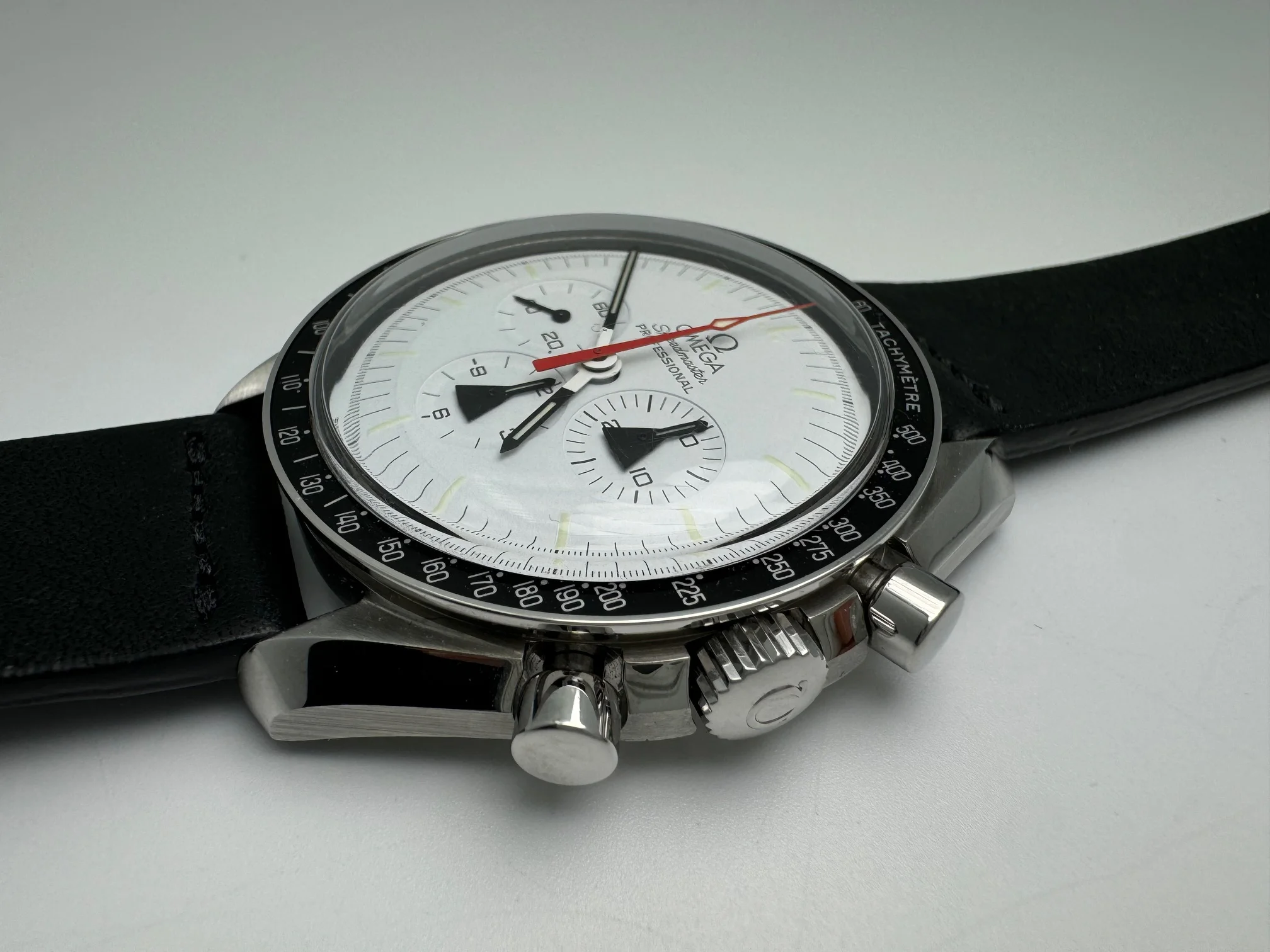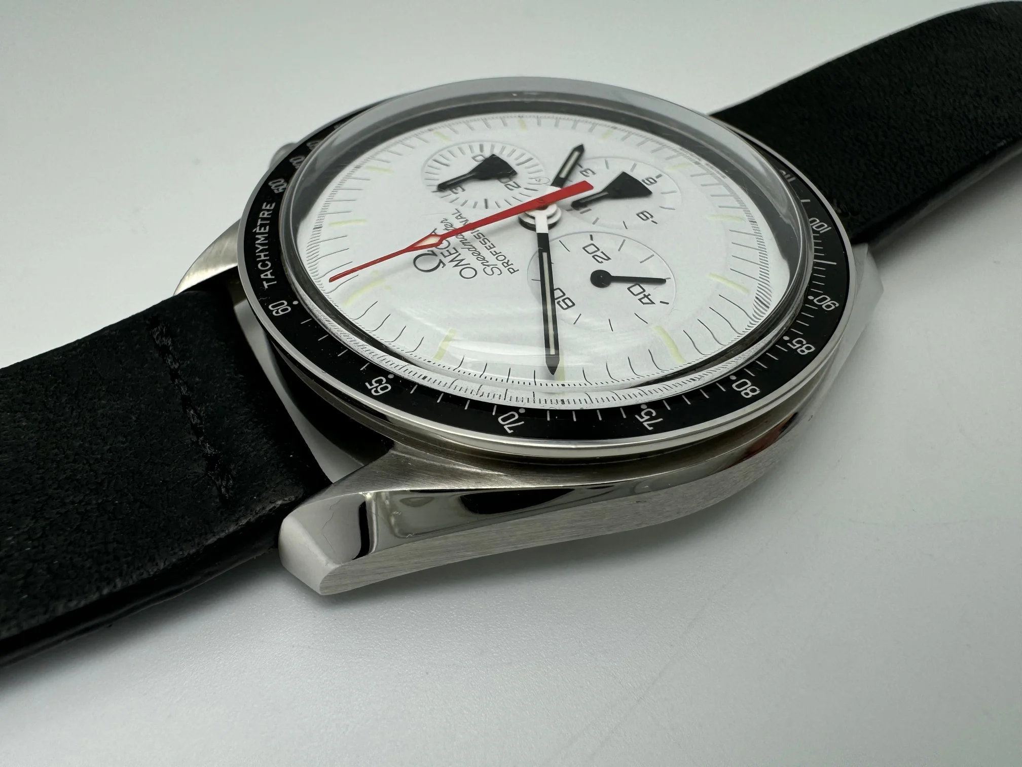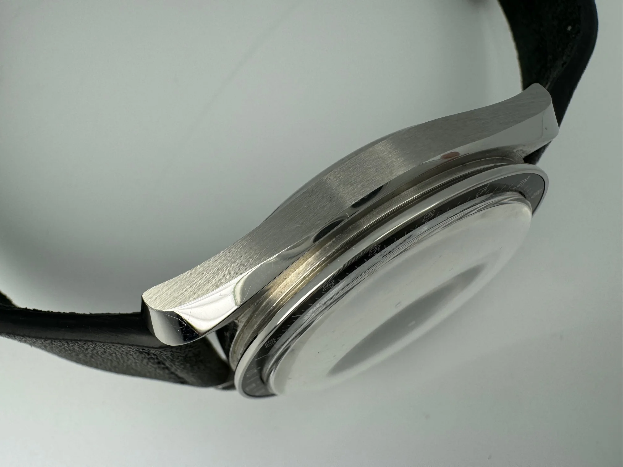- Premium Hodinkee black leather strap (currently mounted)