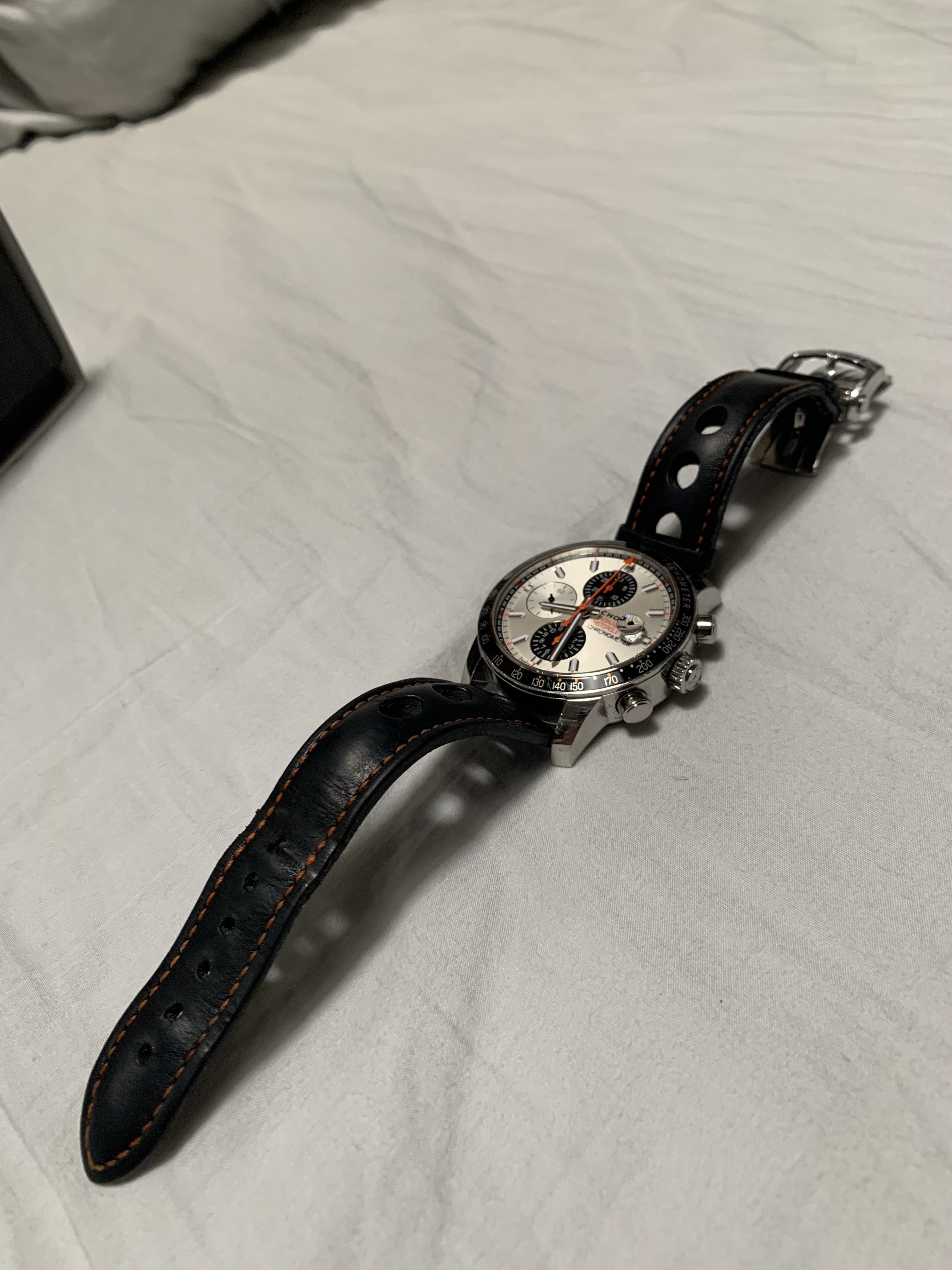 The watch is in fair condition with moderate wear. The watch was purchased brand new by myself and has not been serviced since it was purchased, however it keeps good time (about +3/+4 sec. a day). The price reflects the potential need for a service as well as a need for a light polish job to make it perfect again. The watch comes with all original paperwork and it's original box. If you would like any specific pictures, please let me know and I would be glad to grab them for you!