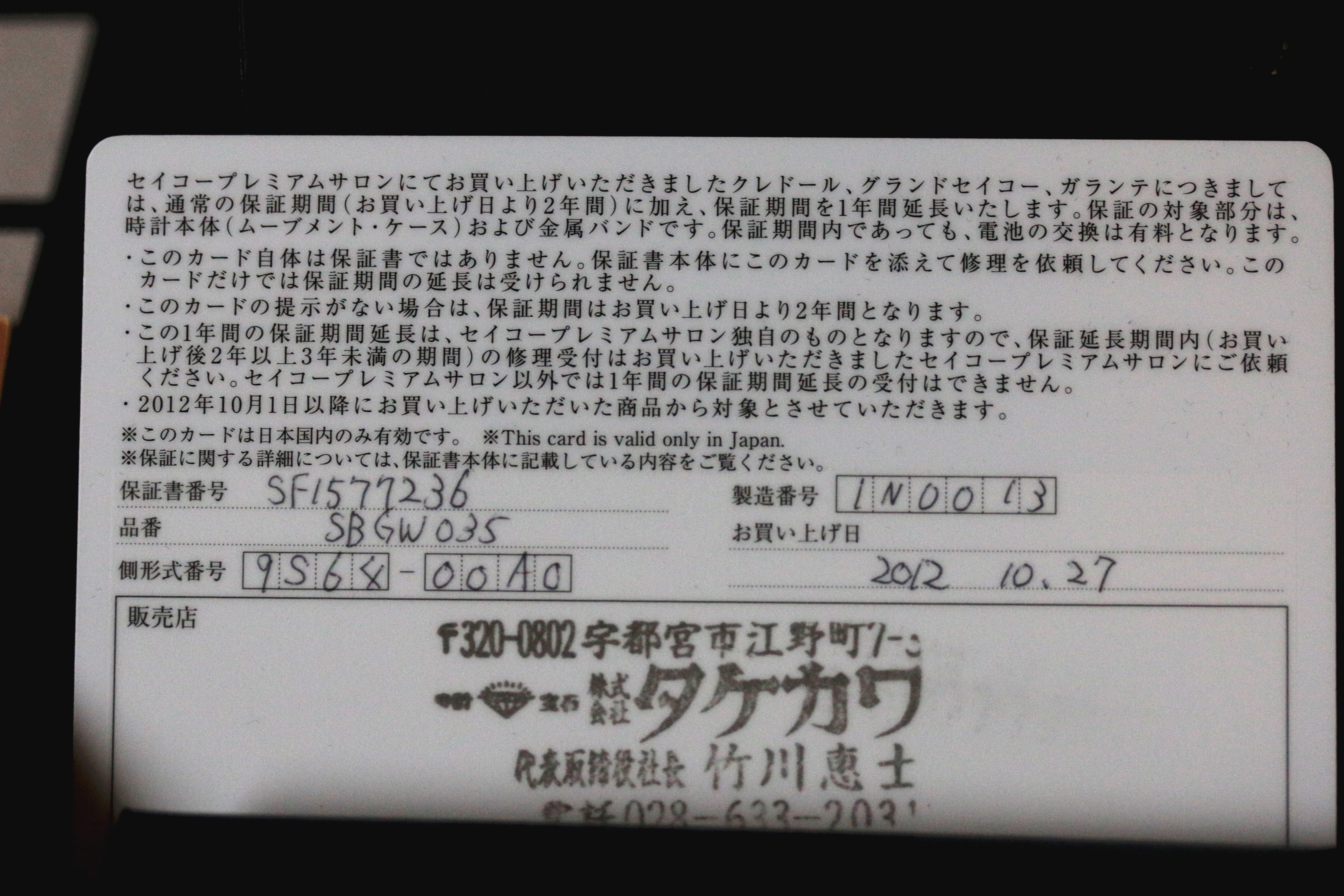 ·For sale here is a 2012 Grand Seiko SBGW035 in full set. This is the (arguably now more sought after) "double logo" version with the Seiko logo at 12 and GS logo at 6, which looks more balanced IMO on this minimalism dial than the newer GS-only version (SBGW235) as its successor. The watch has a beautiful domed creamy dial and a heat treated blue second hand. The 9S64A movement inside has a 72 hours power reserve, and is the same movement used in their limited editions (See here and here) with way higher price tags, which makes this watch a great value IMO.