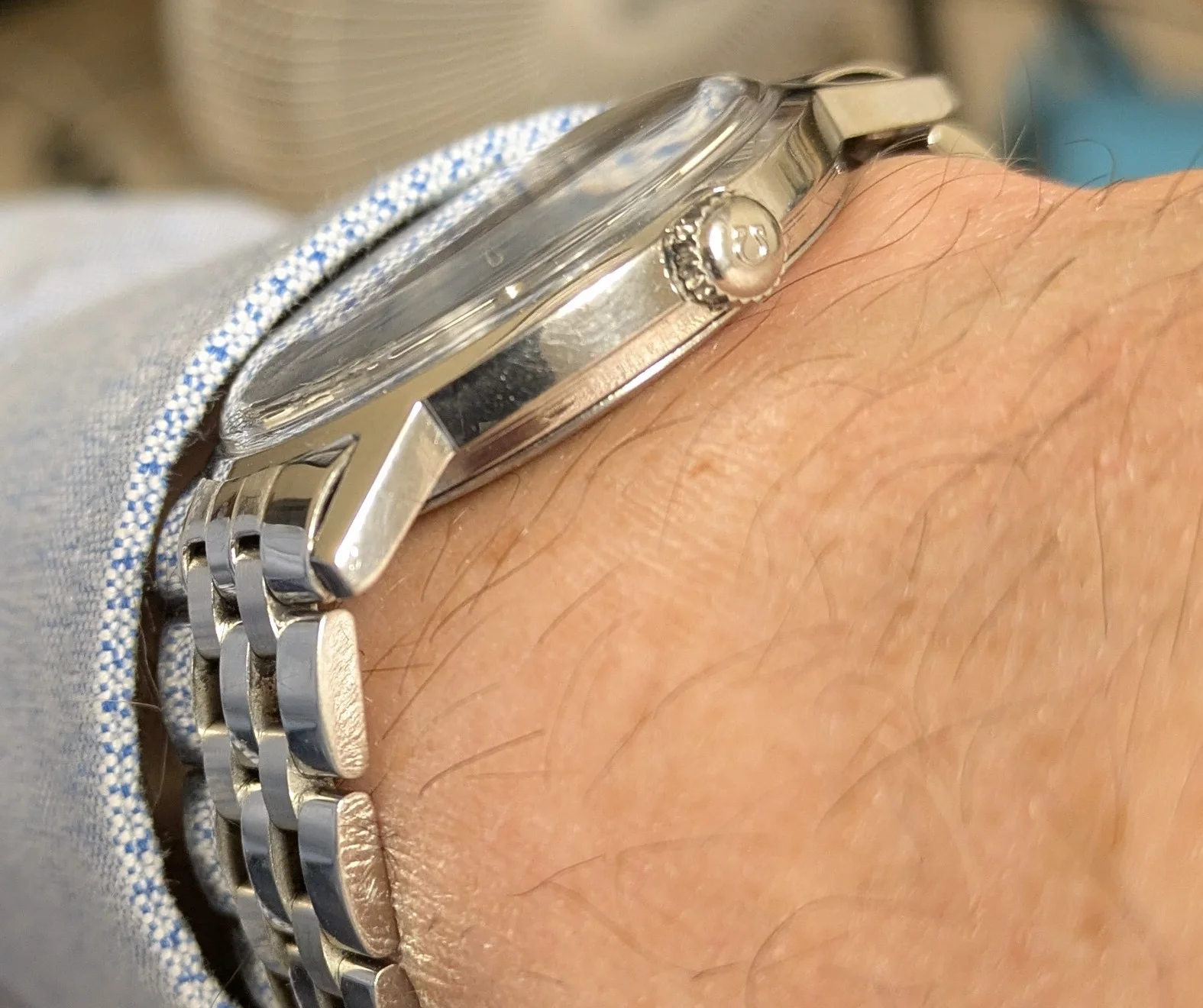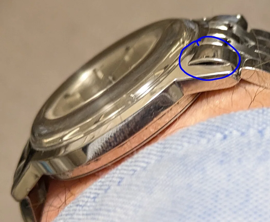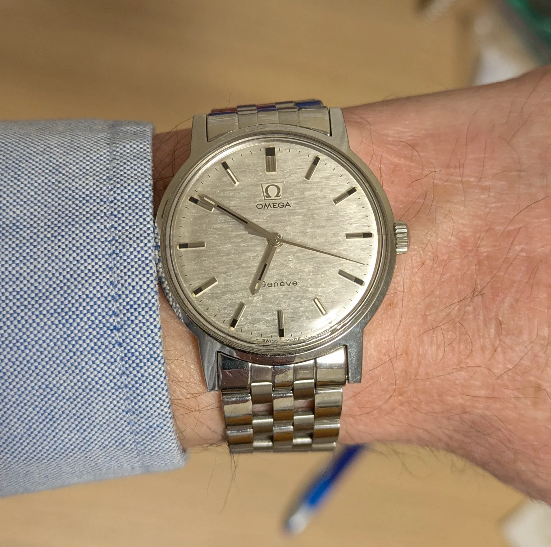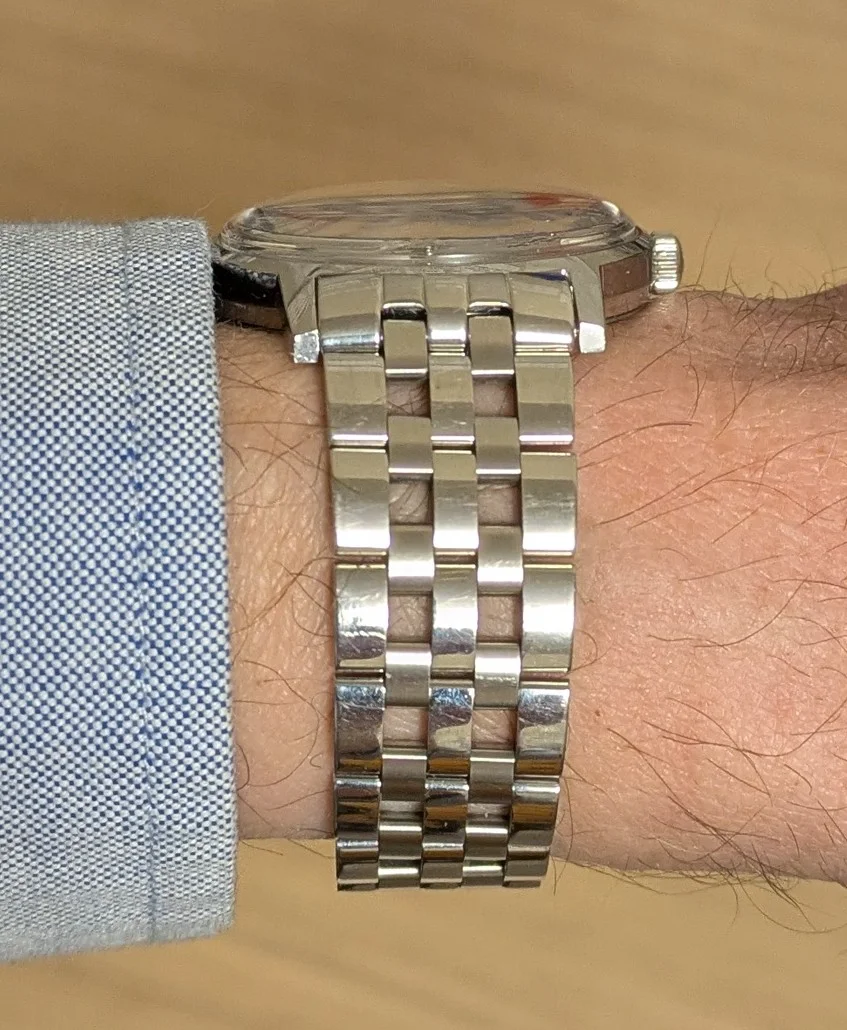·I just thought I'd share this surprise. I just acquired a 2012 Tissot Carson 35mm watch via a trade for two 1970s Seiko 7009 automatics. The trader also gave me a vintage Tissot bracelet which he said fits his 1970 Omega Seamaster. So I thought I'd try it on my only silver Omega, a 1970 Geneve. The end links were brushed instead of polished though so I instead tried the 2012 Tissot bracelet on my Geneve and...to my surprise, the end links fit it very well, other than a slight hump on one side.