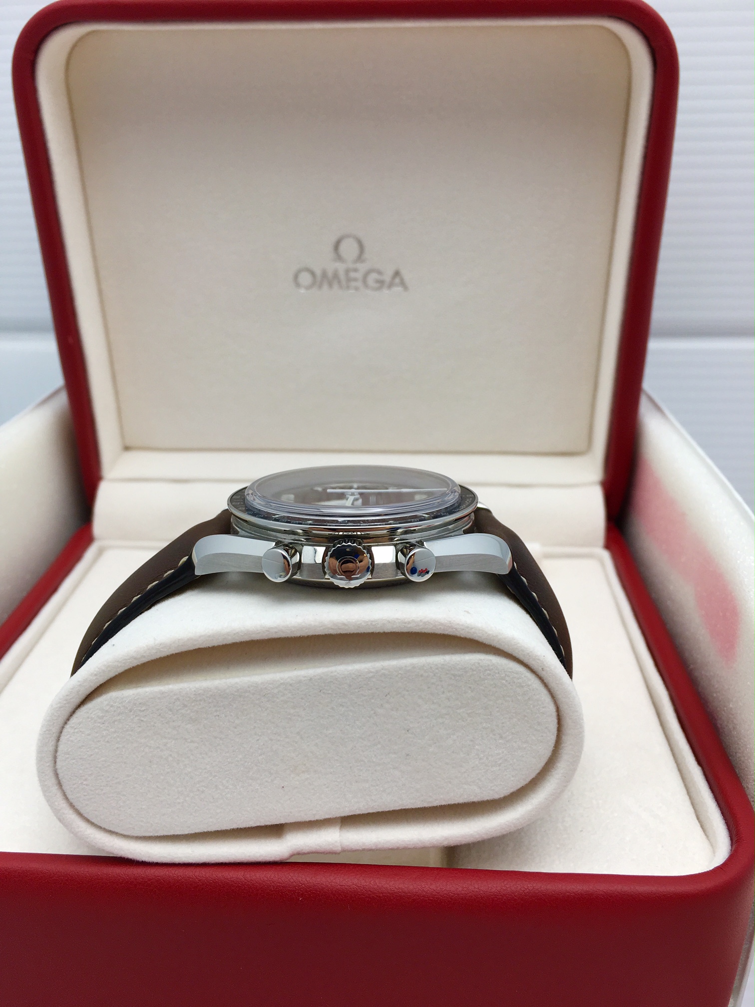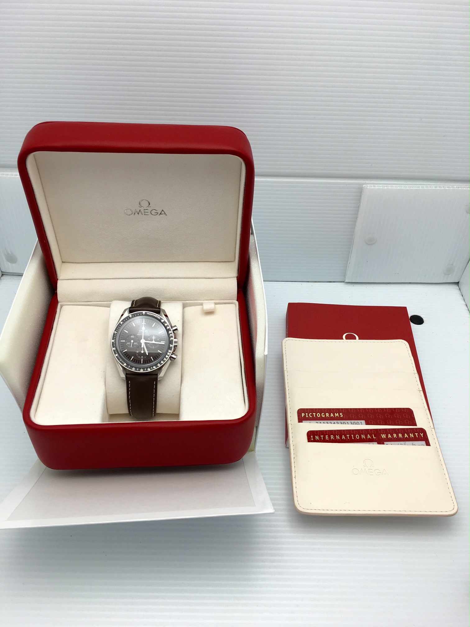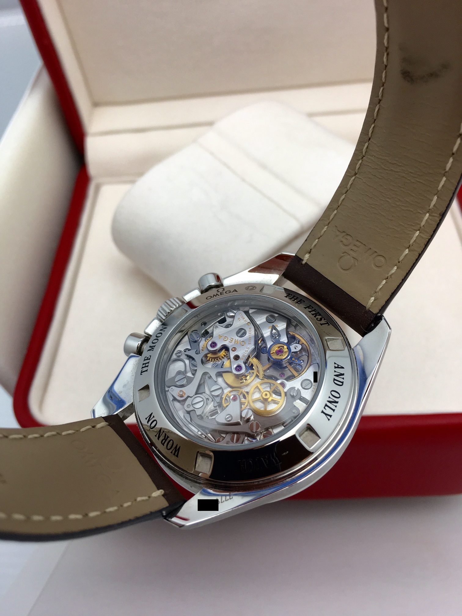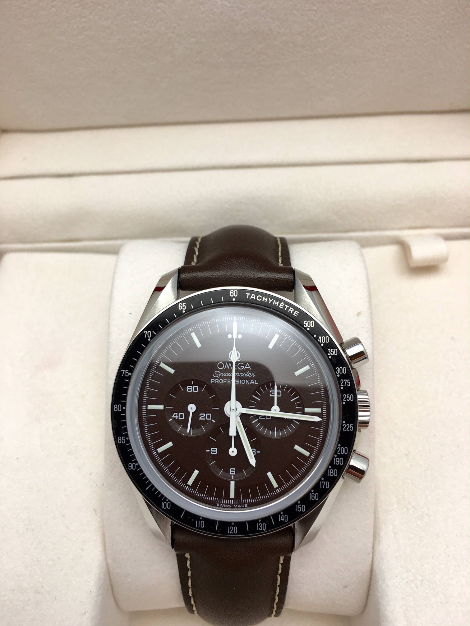 I have a 2013 model Omega Speedmaster Professional 311.30.42.30.13.001 for sale. It comes with only what is stated or shown in photos. It runs well and has plenty of amplitude. This is the “Chocolate Sapphire Sandwich”. Please view pictures for any wear marks but looked to be barely even worn.