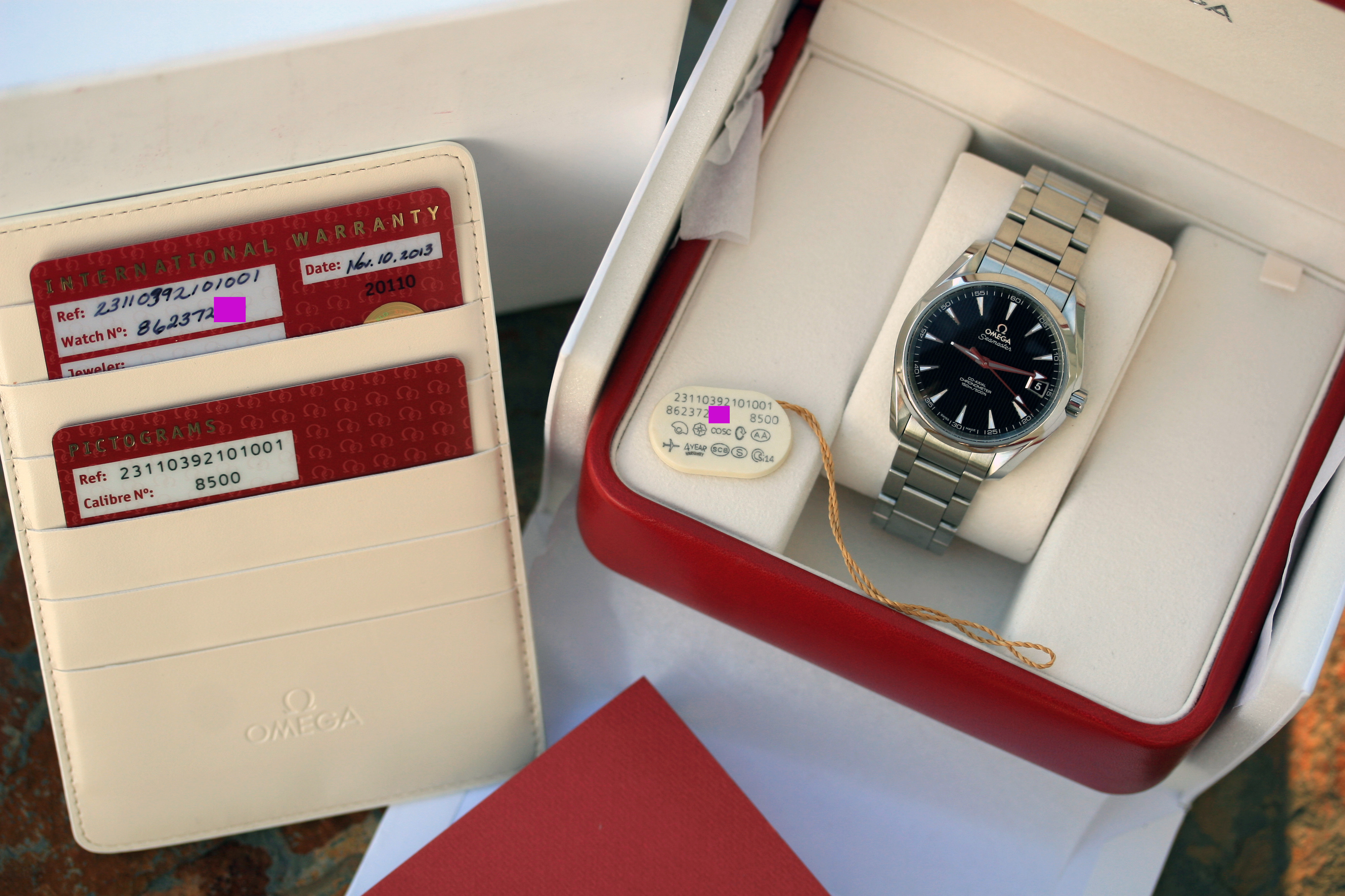 Comes with Omega boxes, manual, cards, warranty dated November 2013 with plenty of factory warranty left over, and hang tag.