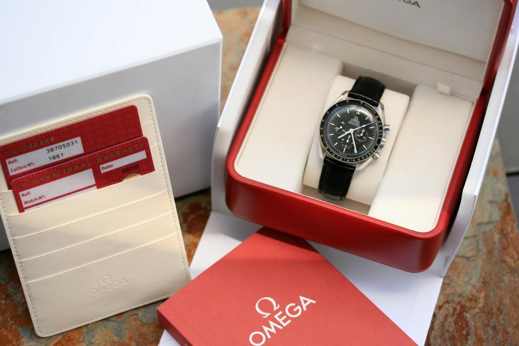 Watch comes with Omega boxes, manual, both cards. Warranty card is AD stamped, but was never dated. You can date and fill out for factory Omega warranty to kick in.