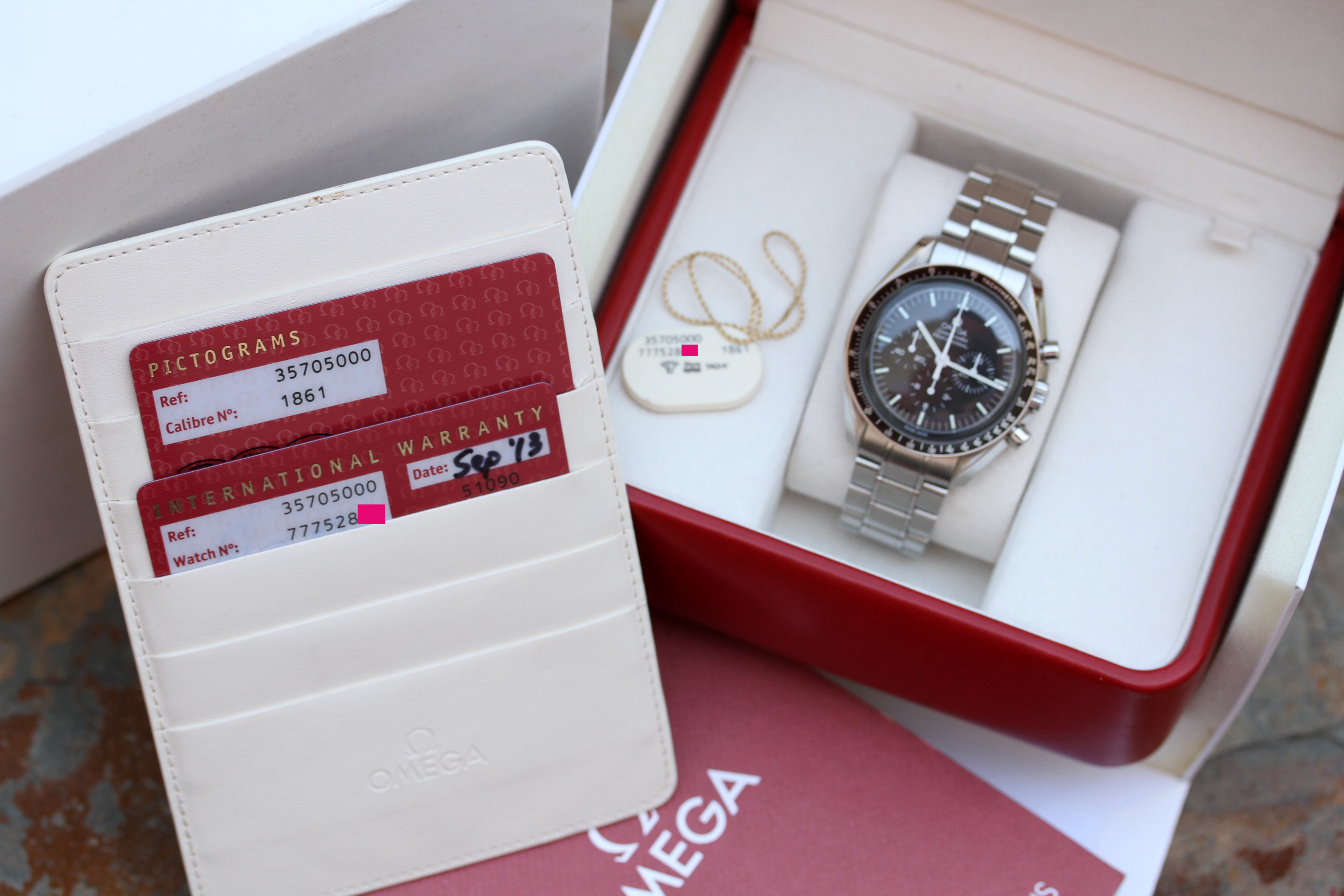 Comes with Omega boxes, manual, warranty and pictograms card. Warranty card is dated, AD stamped, and printed with serial number.