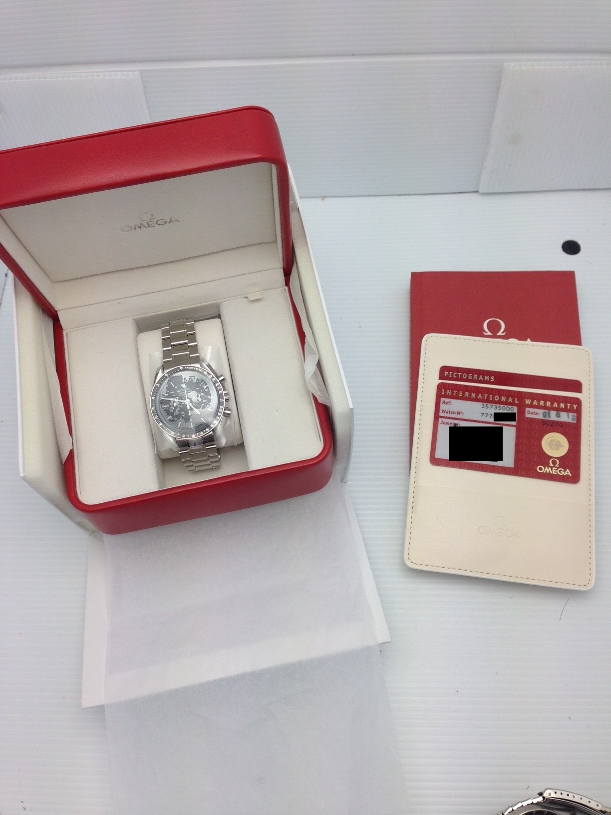Accessories: Both Omega boxes, manuals, card holder, pictogram card, warranty card, serial tag