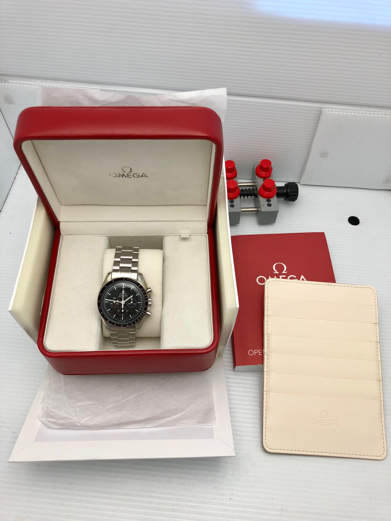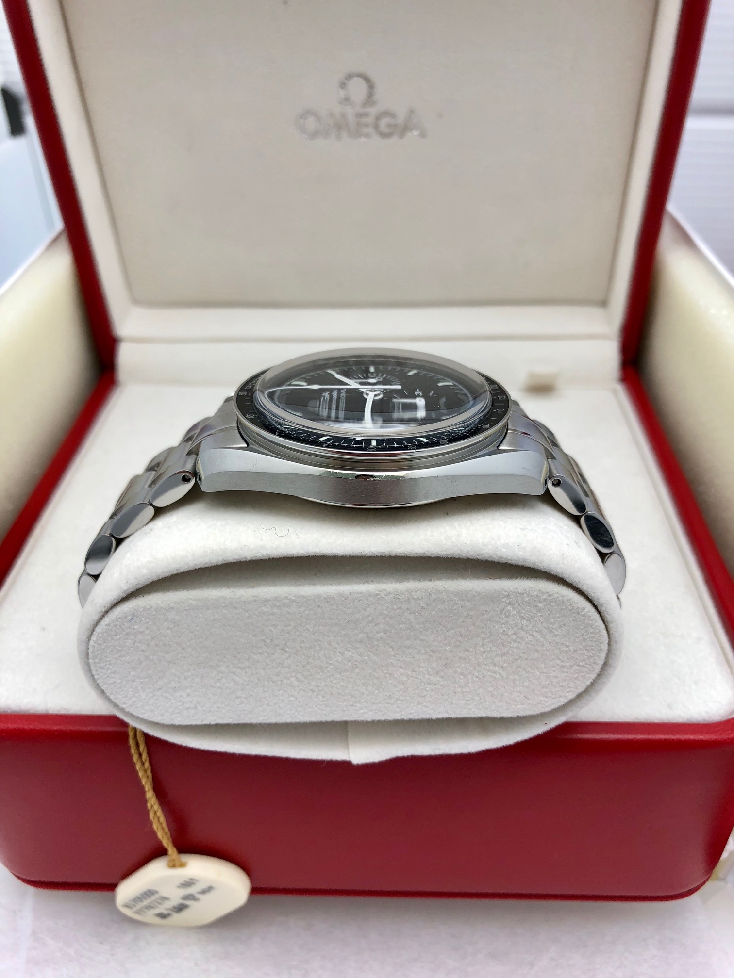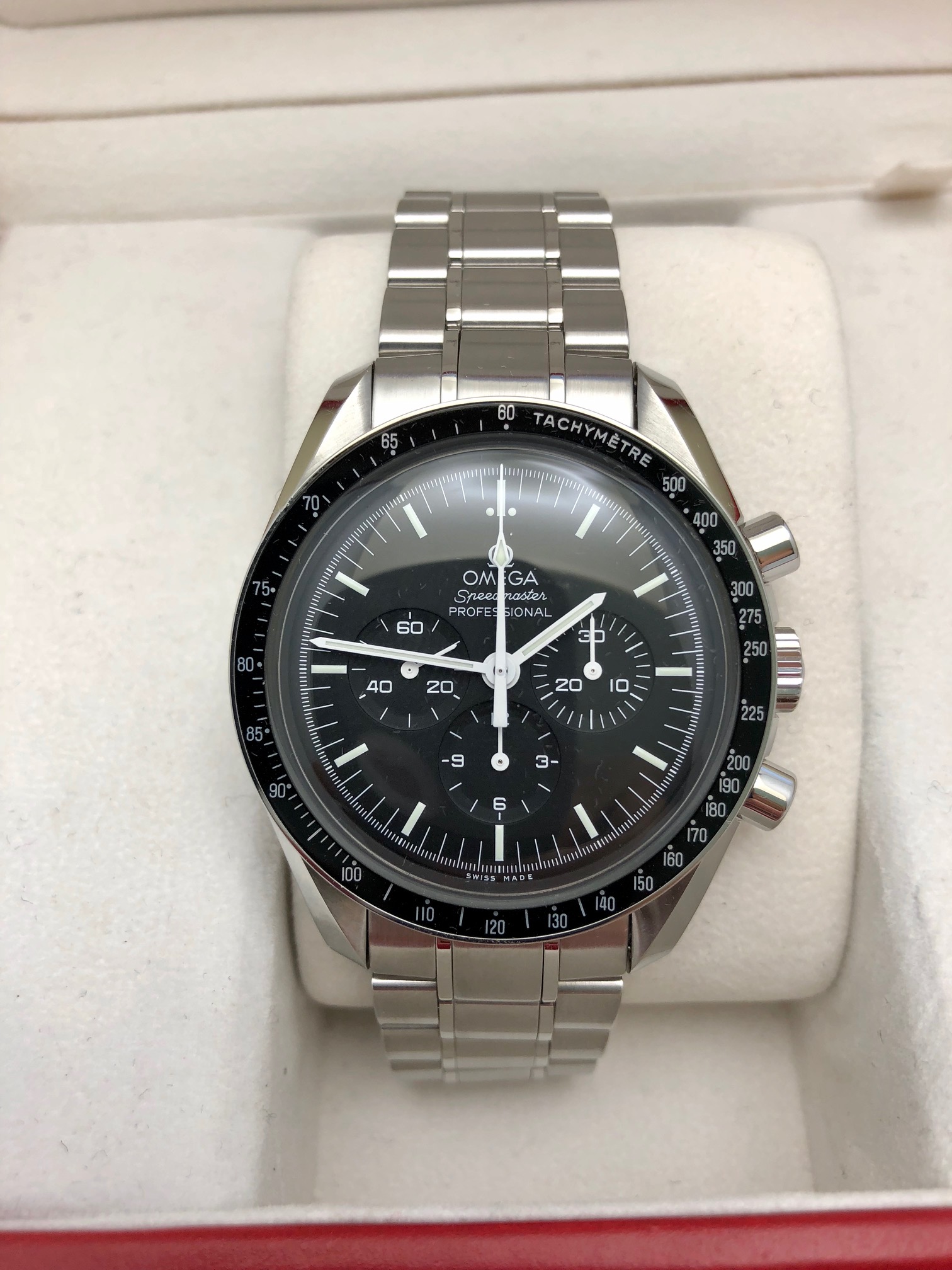 I have an Omega Speedmaster Professional 3570.50 for sale. Please take a look at photos for condition. Appromixately 2014-2015 display watch with very faint handling wear but super light.
