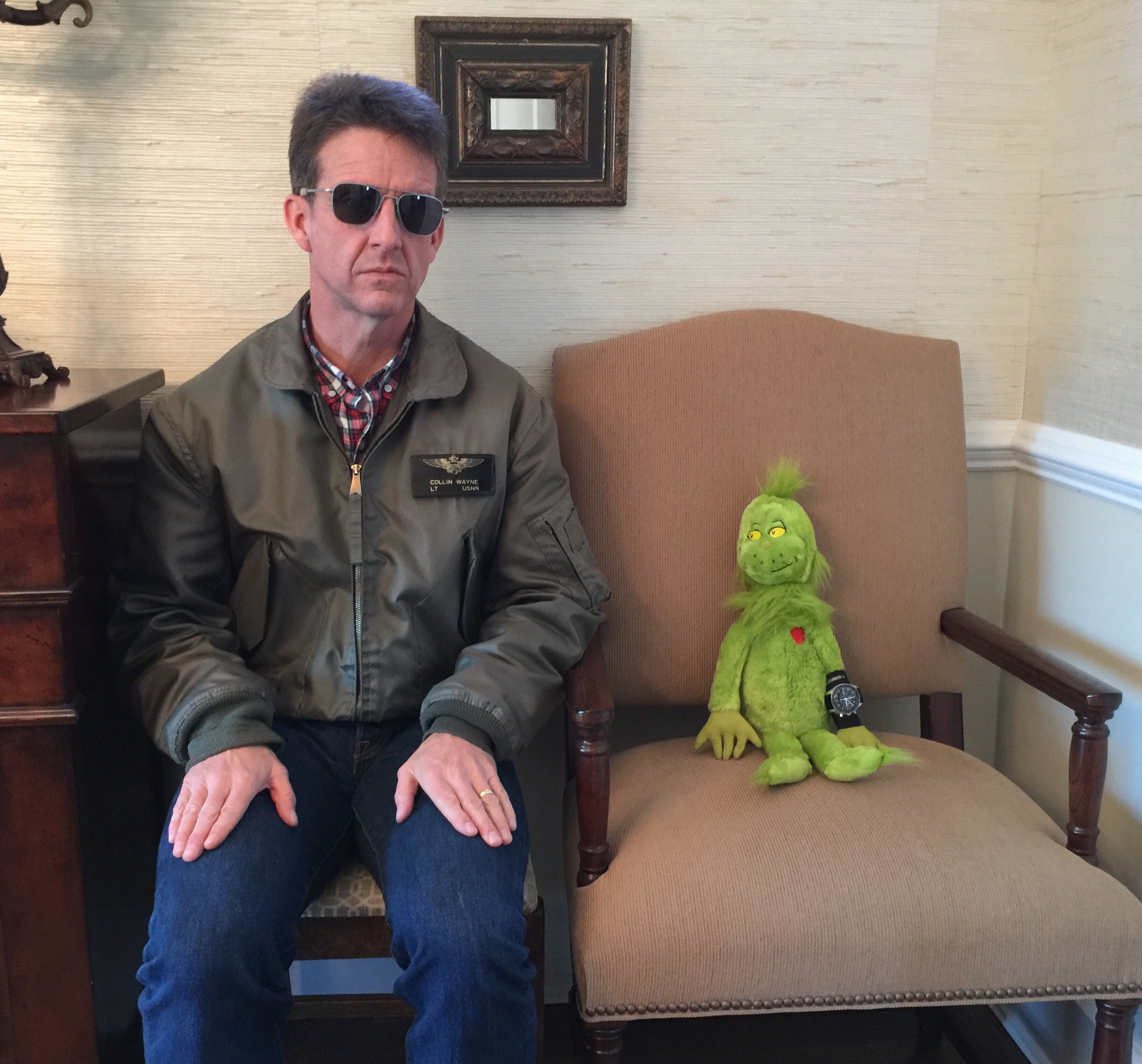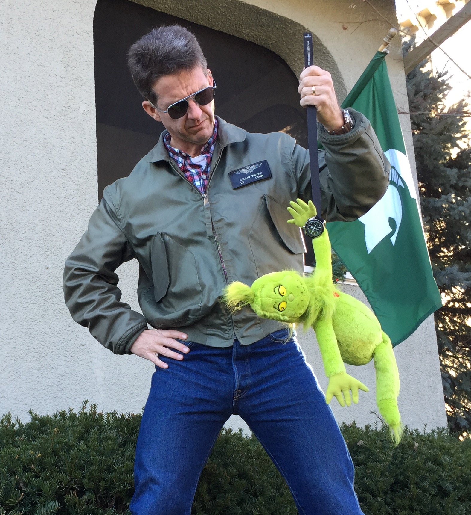 Well, dang...the family members catch me catching Dude Grinch and they explain to me that this is a season of love and sharing...so I'm instructed to invite Dude Grinch inside our house, offer him a chair...AND allow him wear my Speedy Gonzales for 5 minutes.