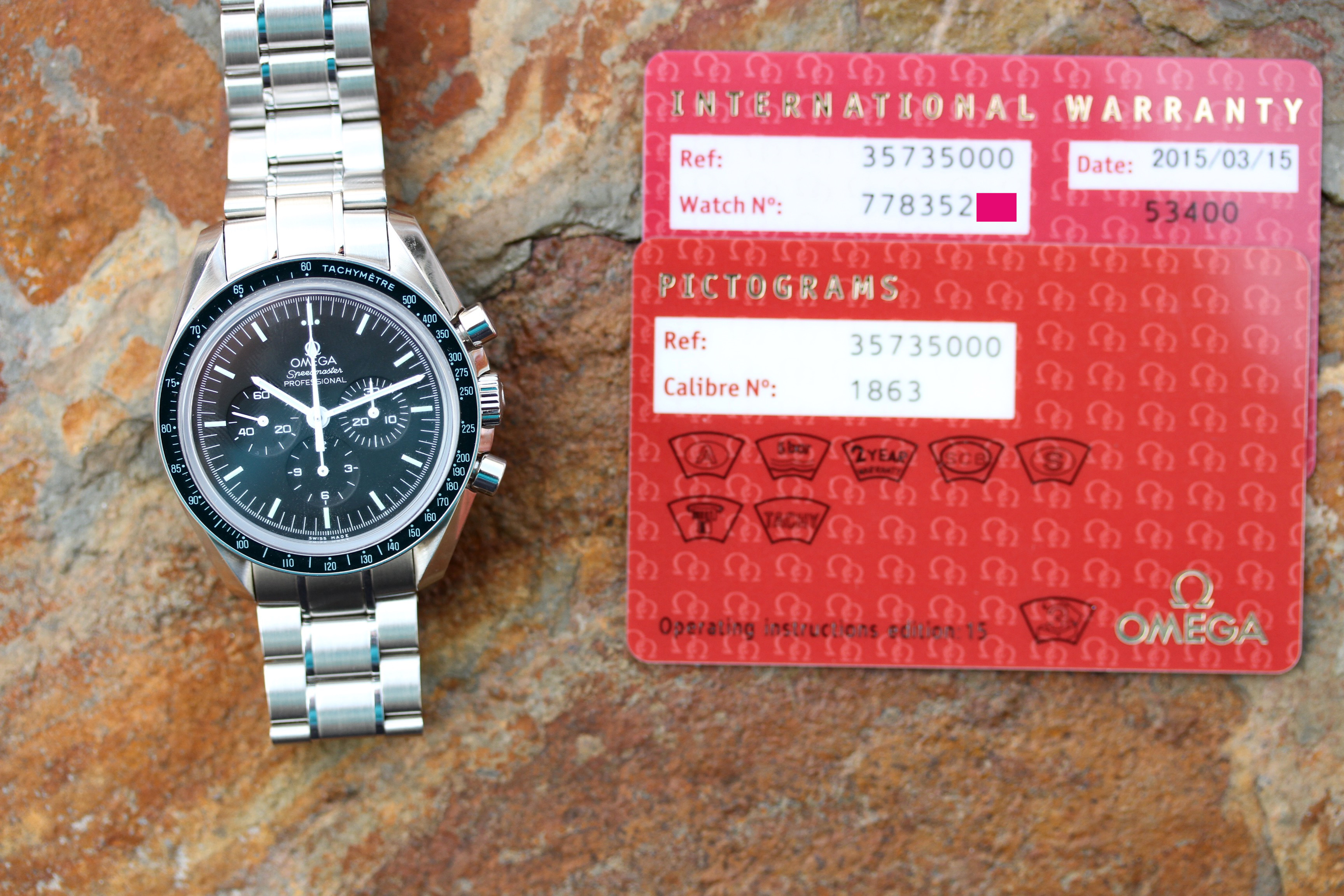 Watch comes with Omega warranty card dated in March 2015 and AD stamped, Pictograms card. No boxes or other accessories.