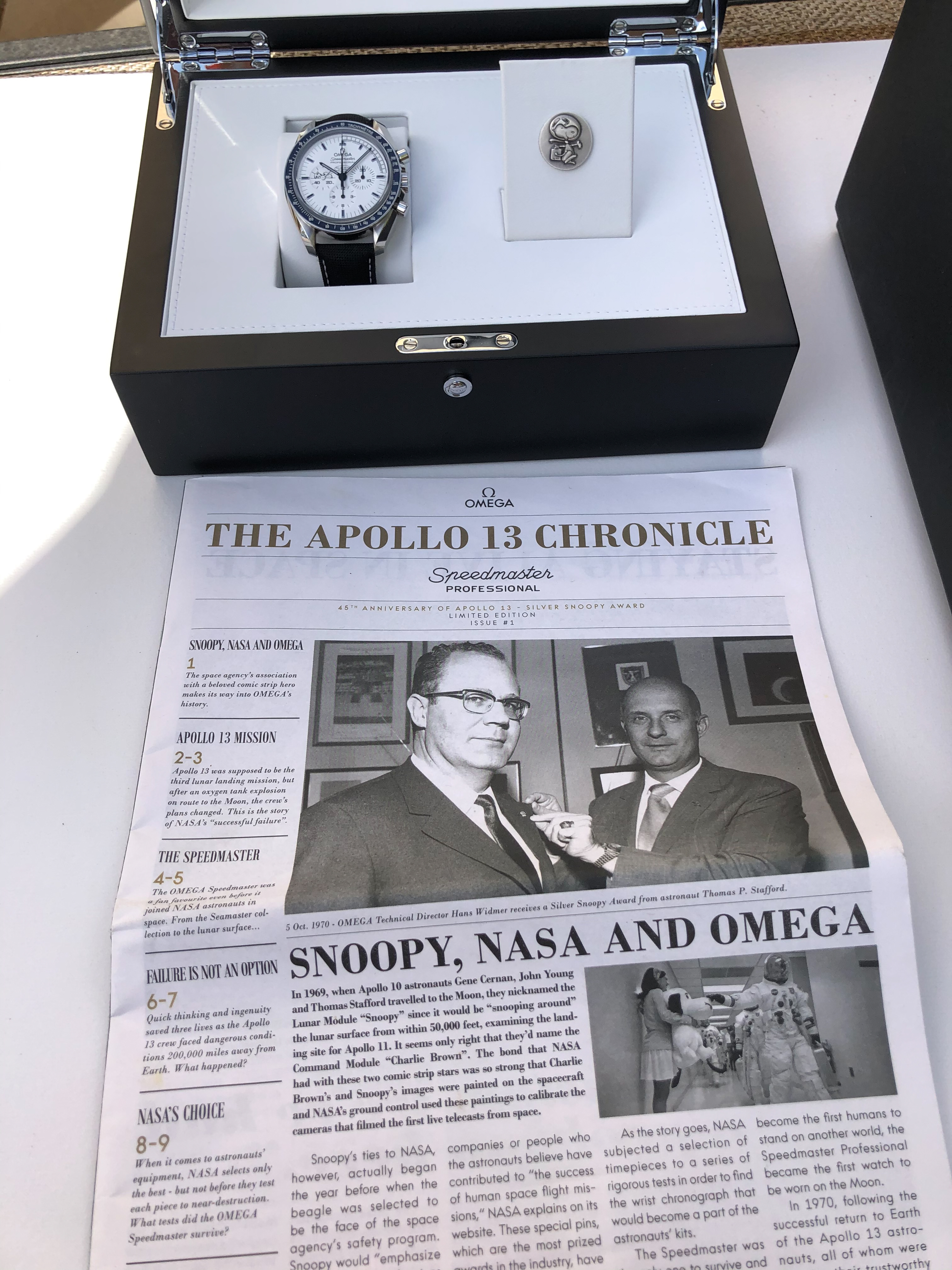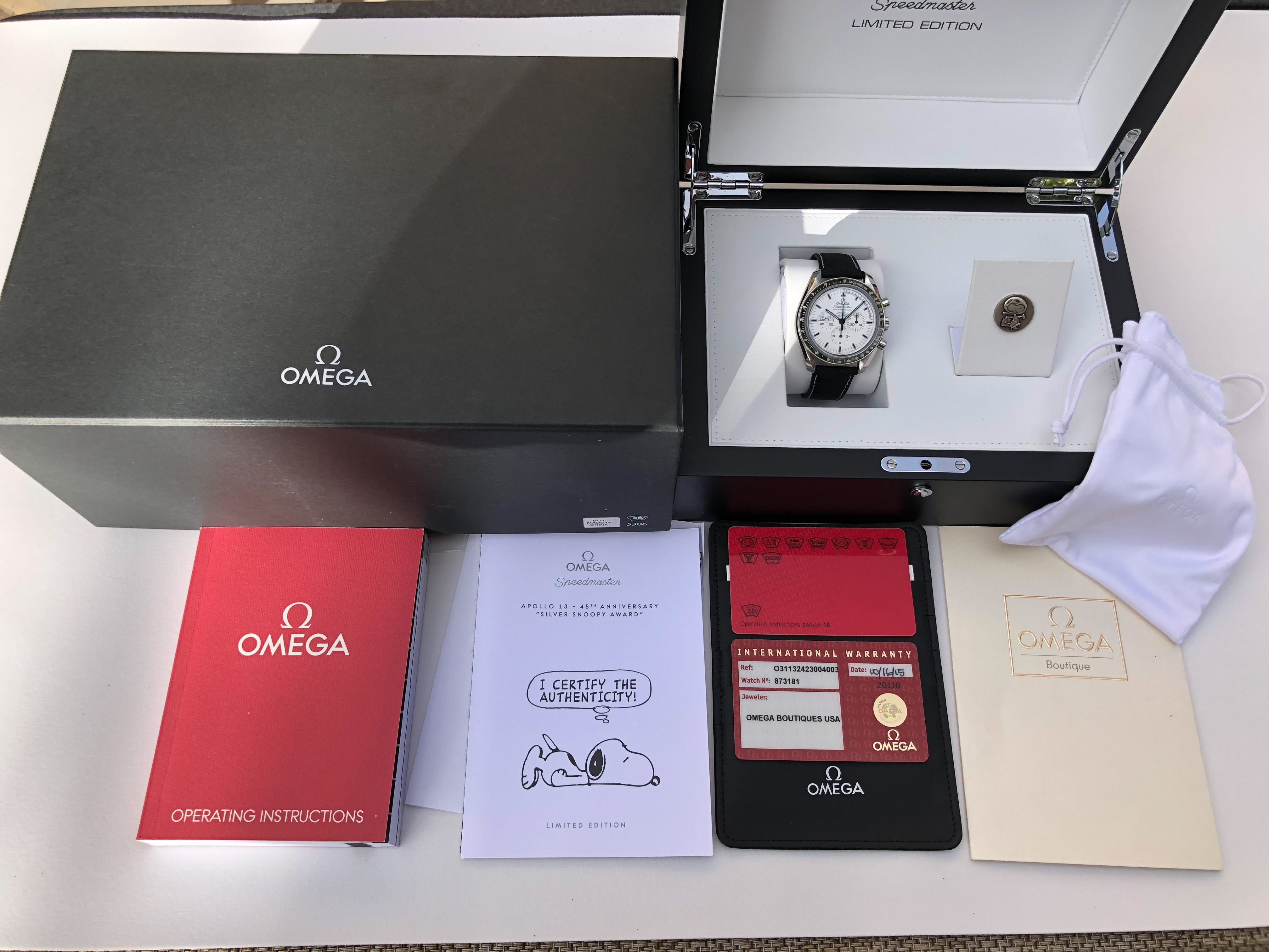 路From my personal collection, I am offering for sale a limited edition 45th Anniversary Apollo 13 Silver Snoopy Speedmaster, one of 1970 limited edition pieces offered in 2015. I purchased this watch new from the Omega Boutique in San Diego CA and it has been in my personal collection since new. It has been worn infrequently since that time.