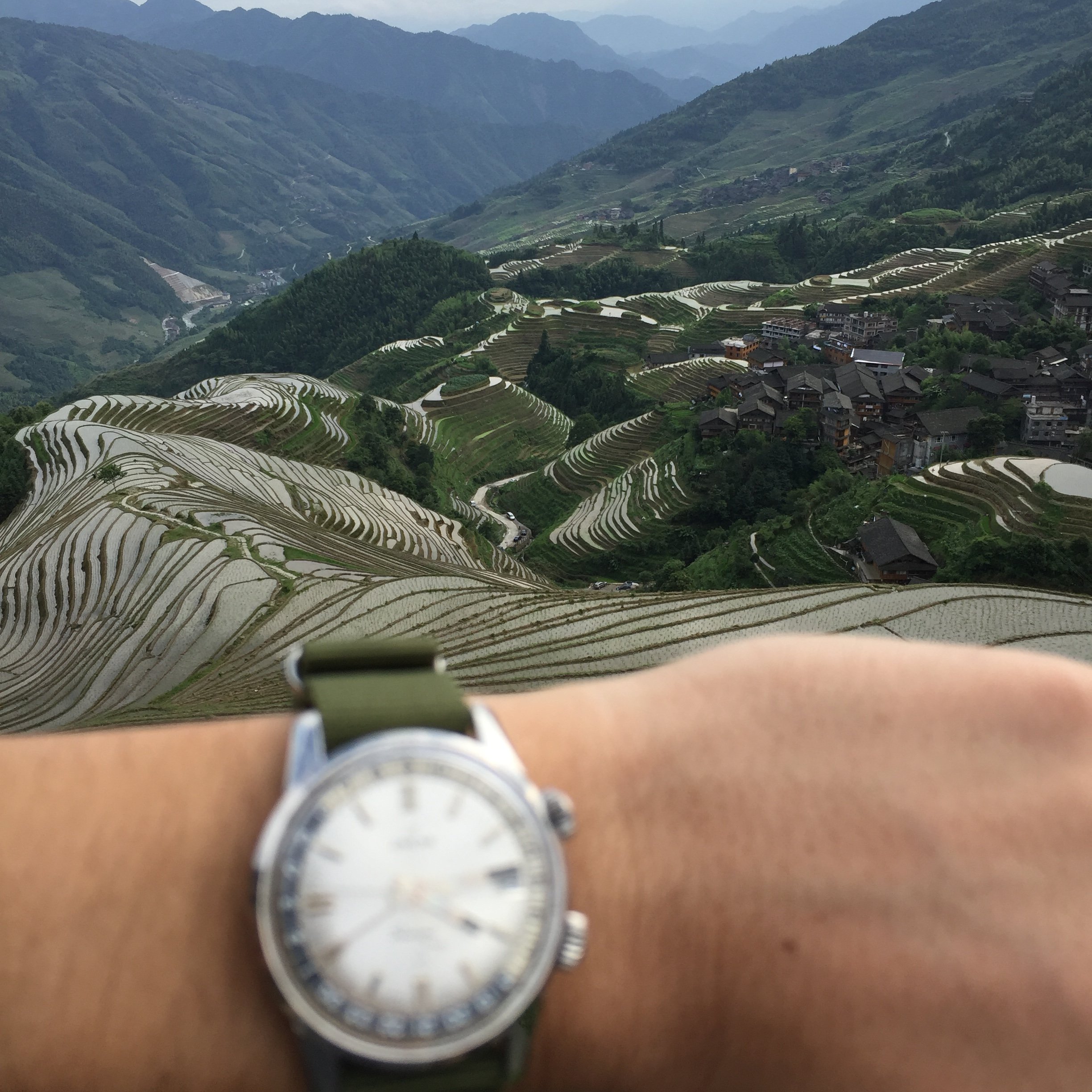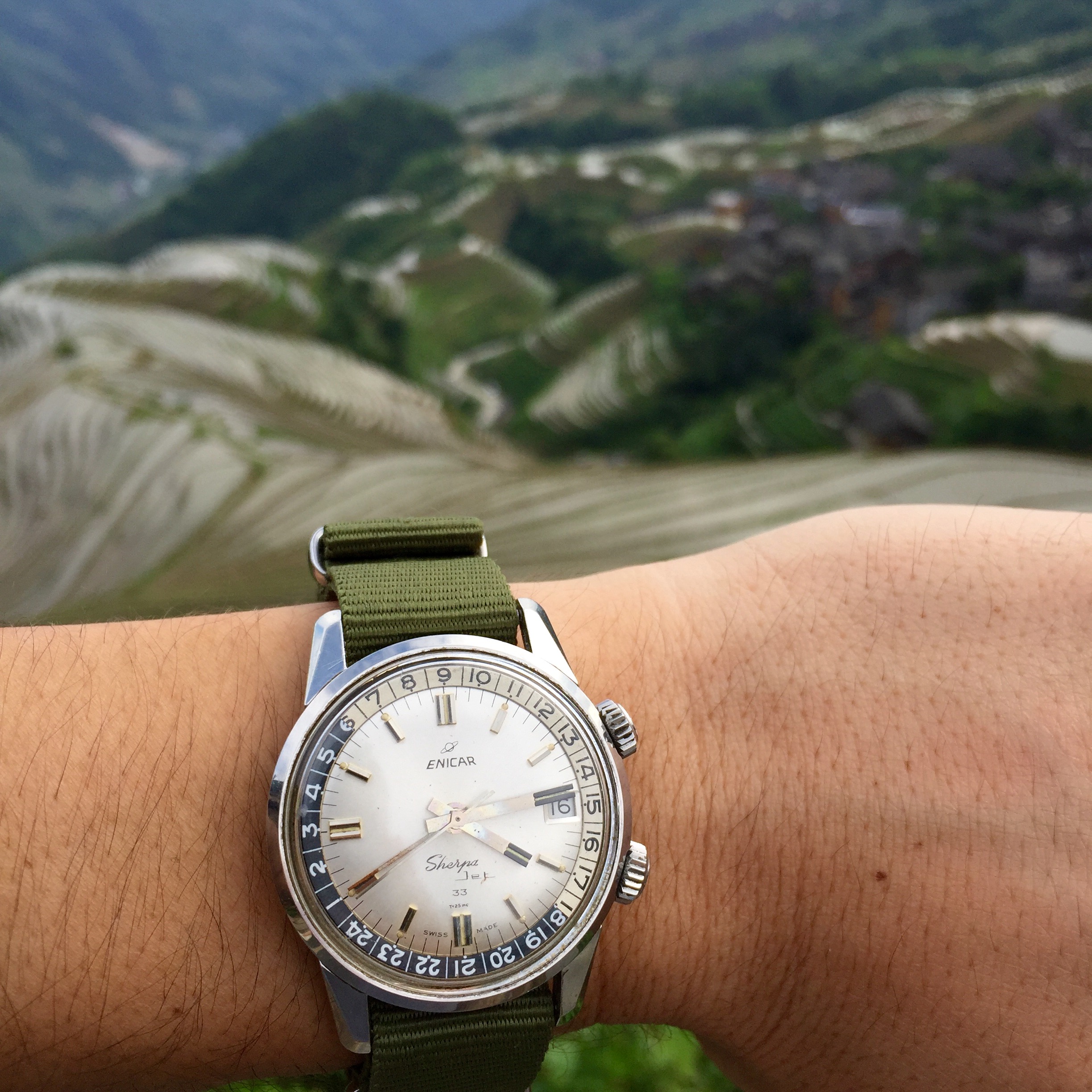 On vacation in China and just saw this thread (and got reliable wifi), so here are my two contributions from the Great Wall and the Longji rice terraces going 2 weeks straight with the Enicar Sherpa Jet on the wrist. And a few bonus with the landscape in focus.