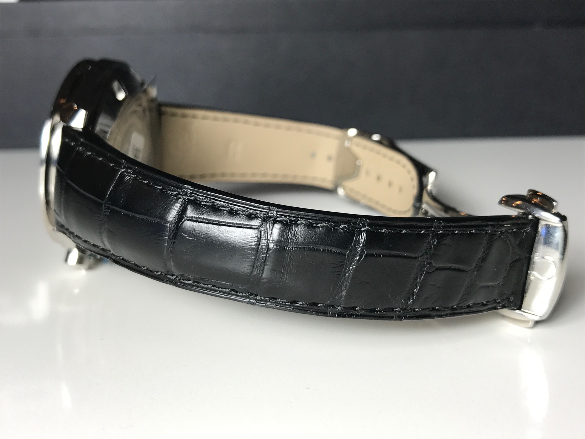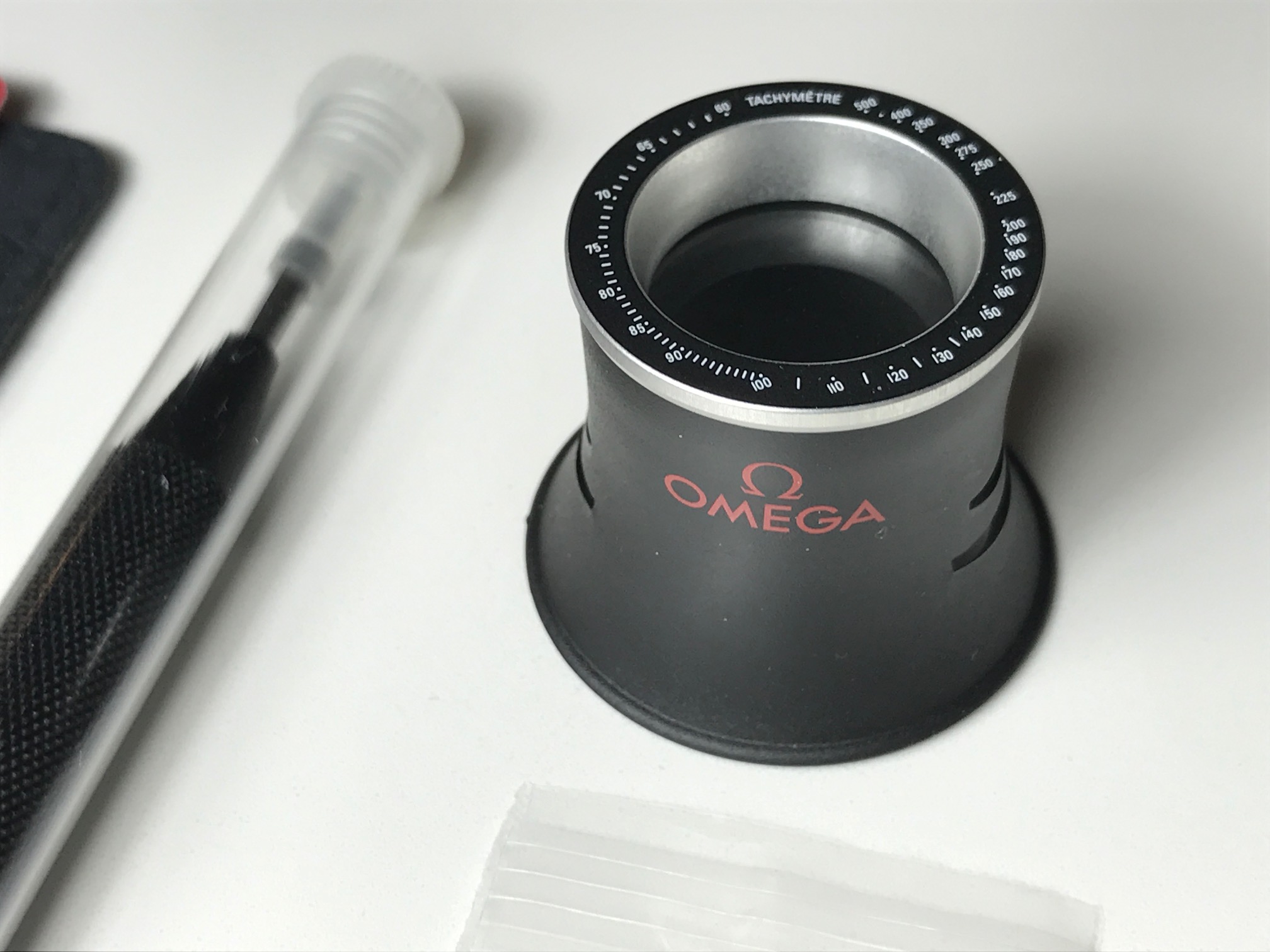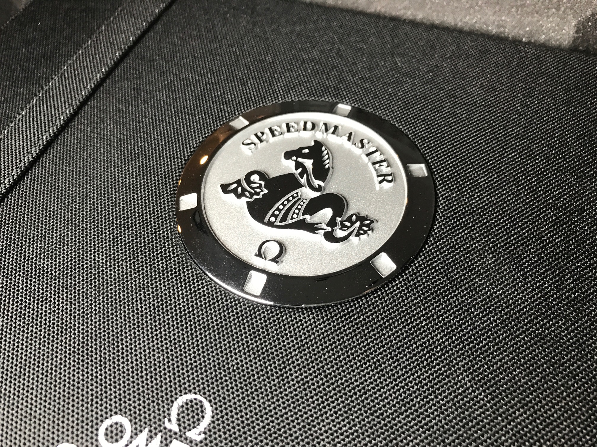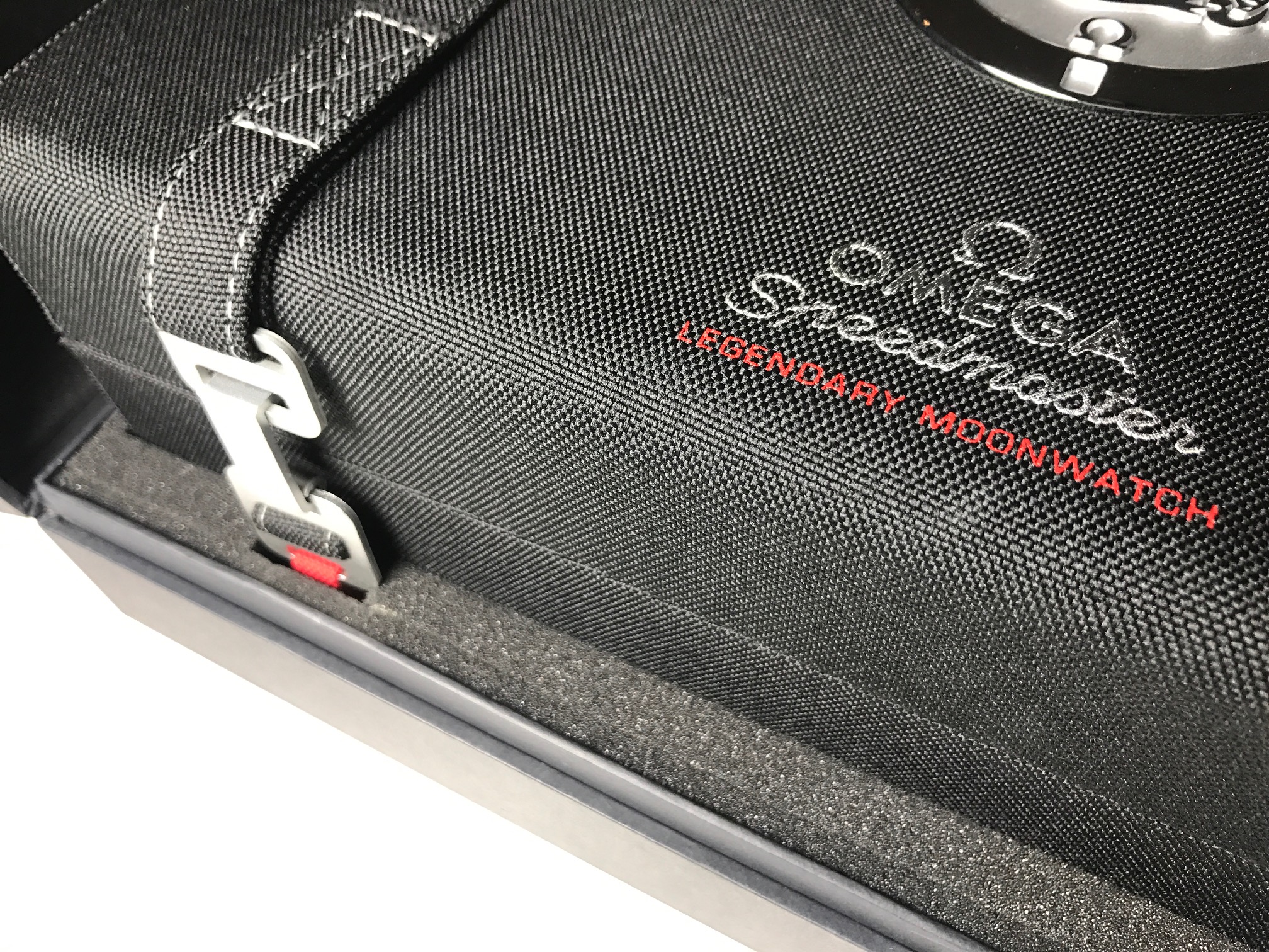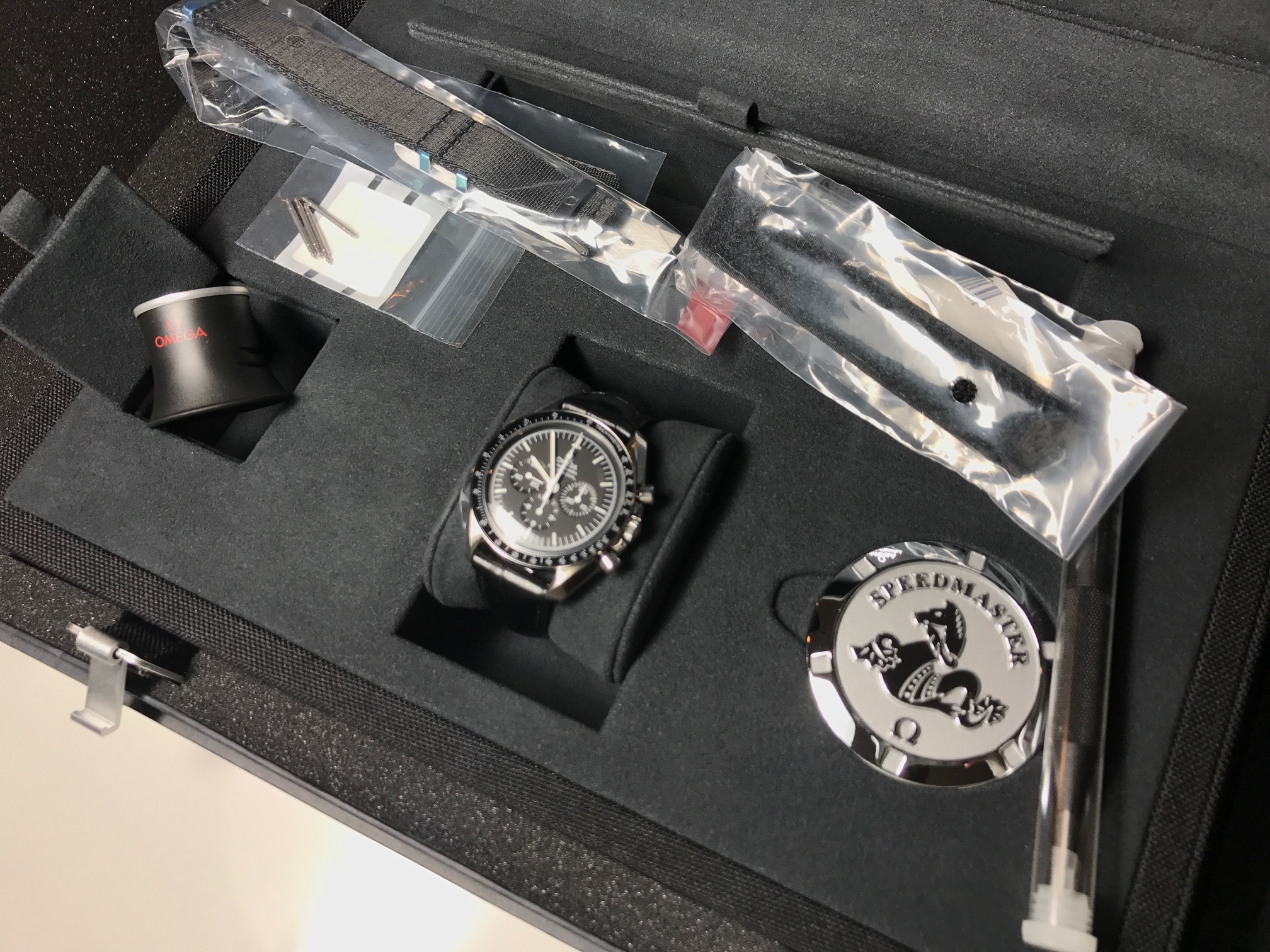 This is the version that comes with the over-sized box / large "suitcase" and tons of goodies. Features the Omega Calibre 1861 hand wind movement with a 48-hour power reserve and scratch resistant hesalite crystal.
