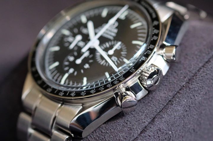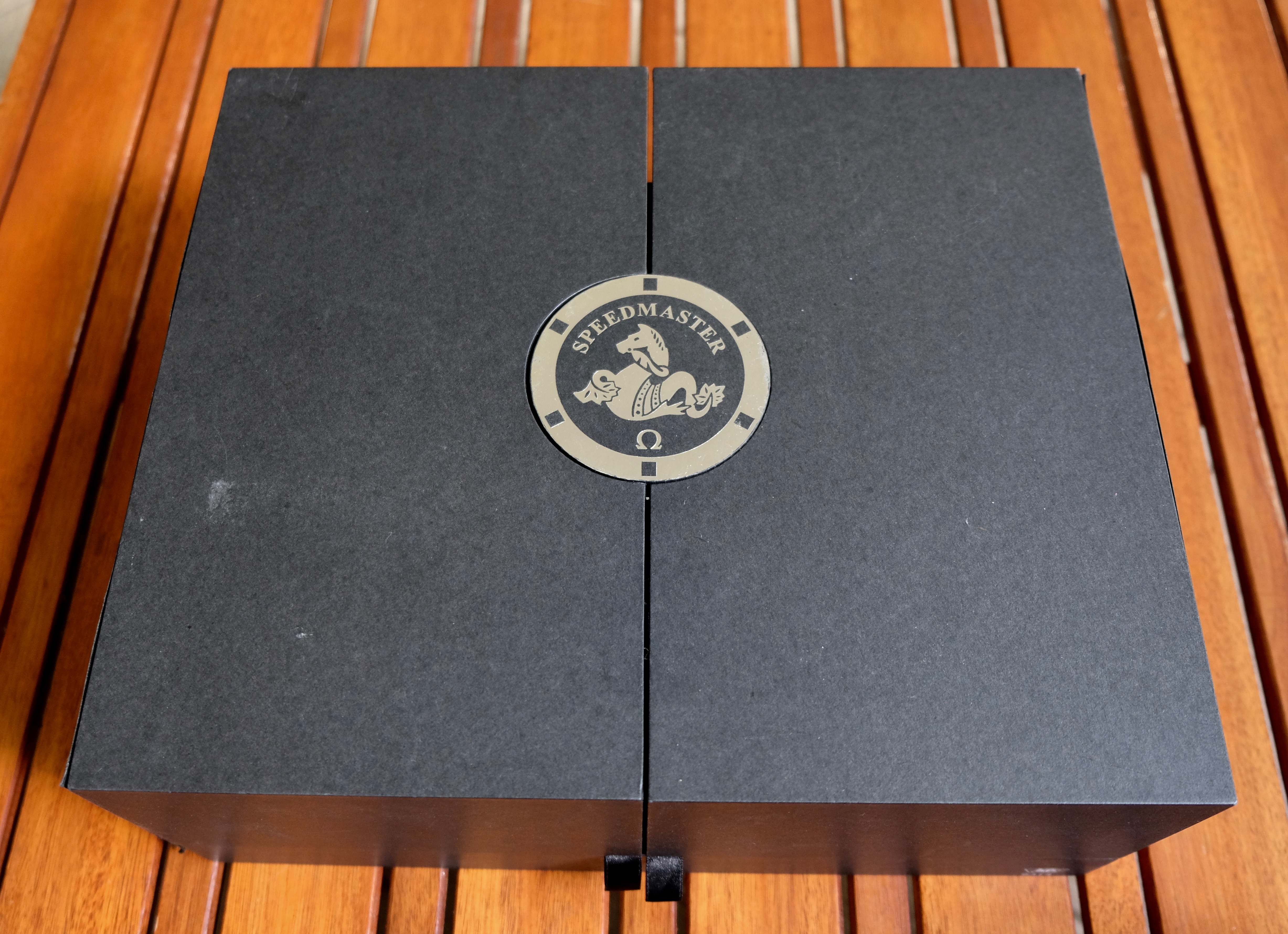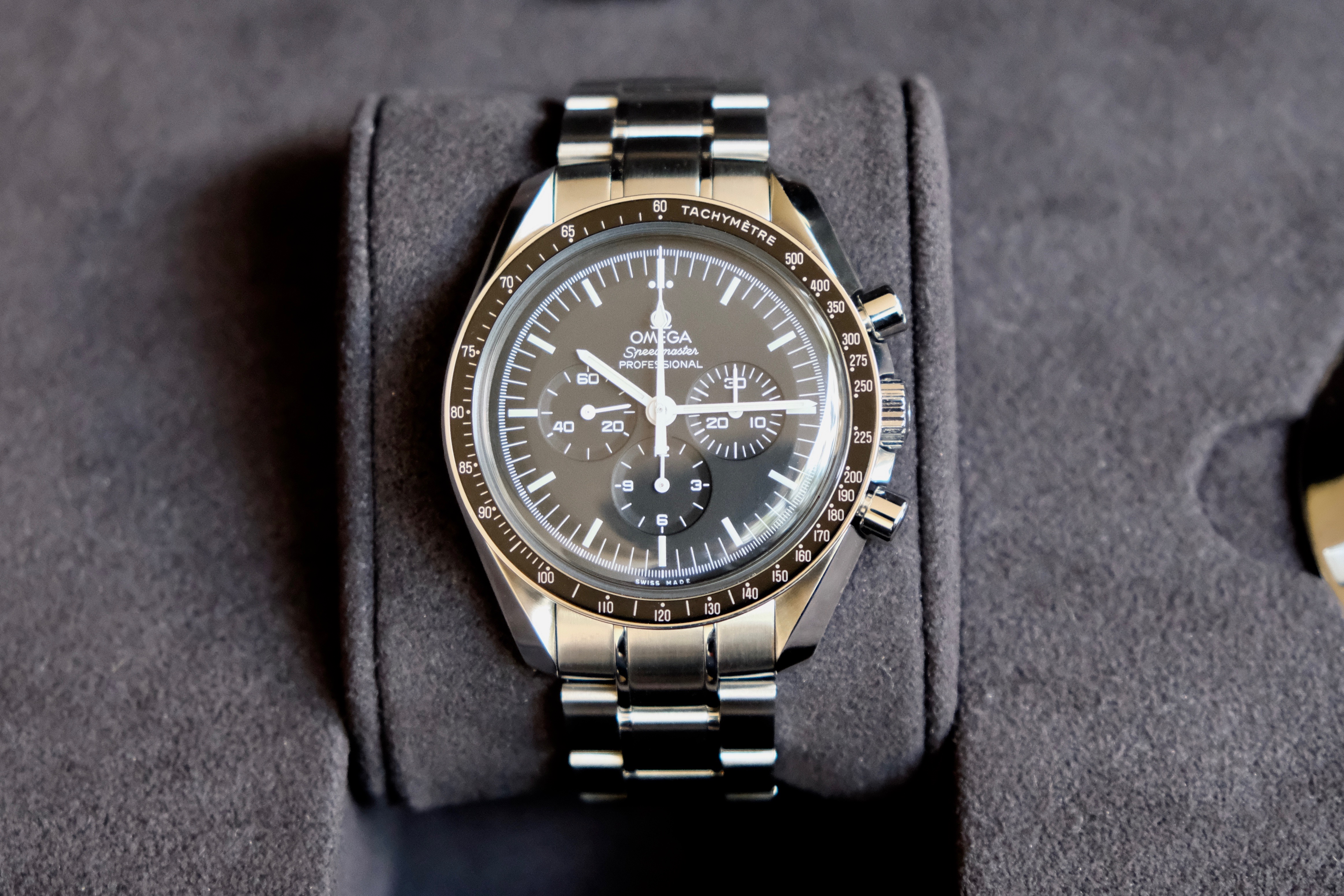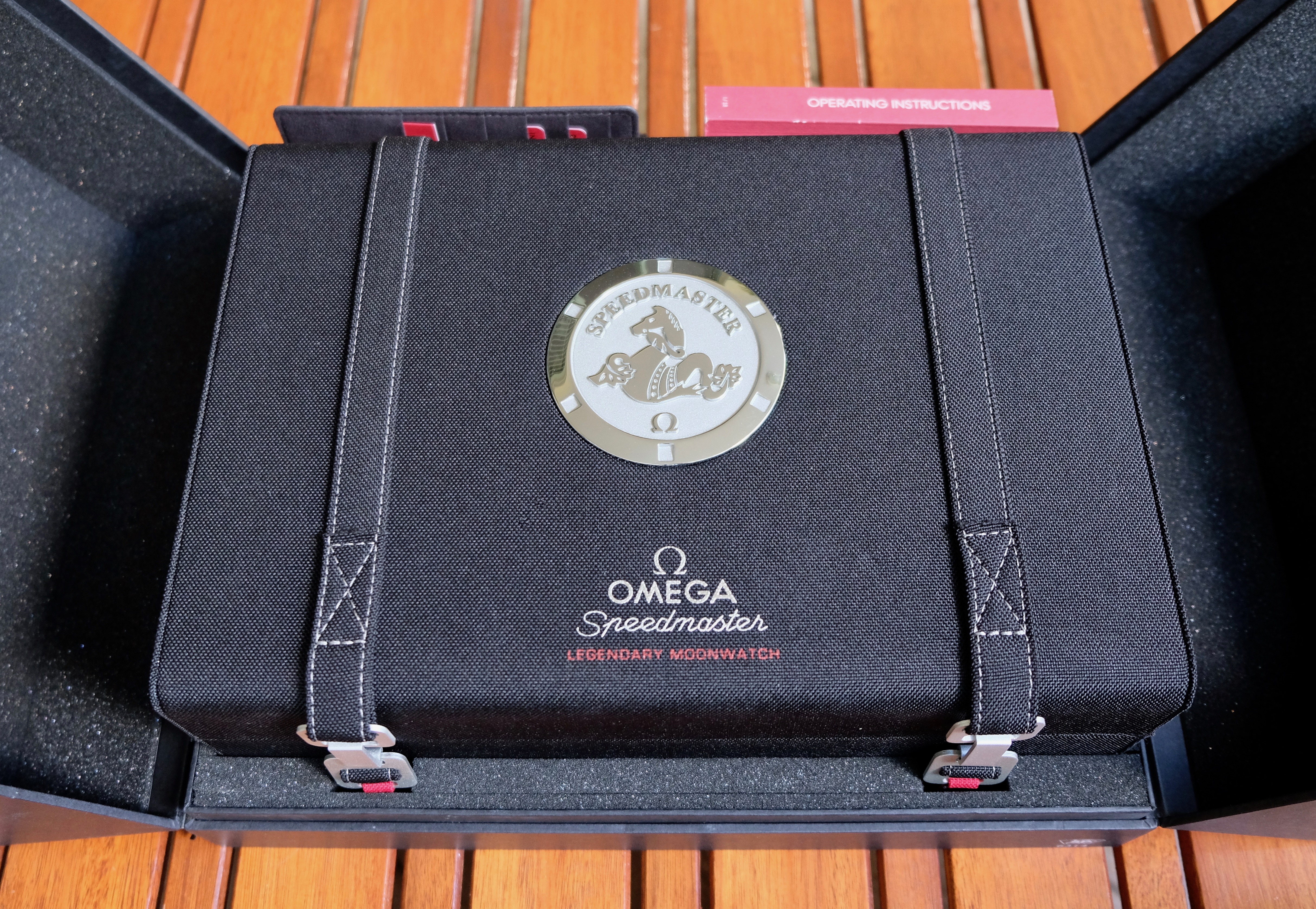 It comes with the large black Speedmaster box full of goodies such as a NATO strap, NASA velcro strap, Speedmaster medallion, Omega loupe, spring bars, and spring bar tool. Of course it also comes with papers, instructions, and spare links too.