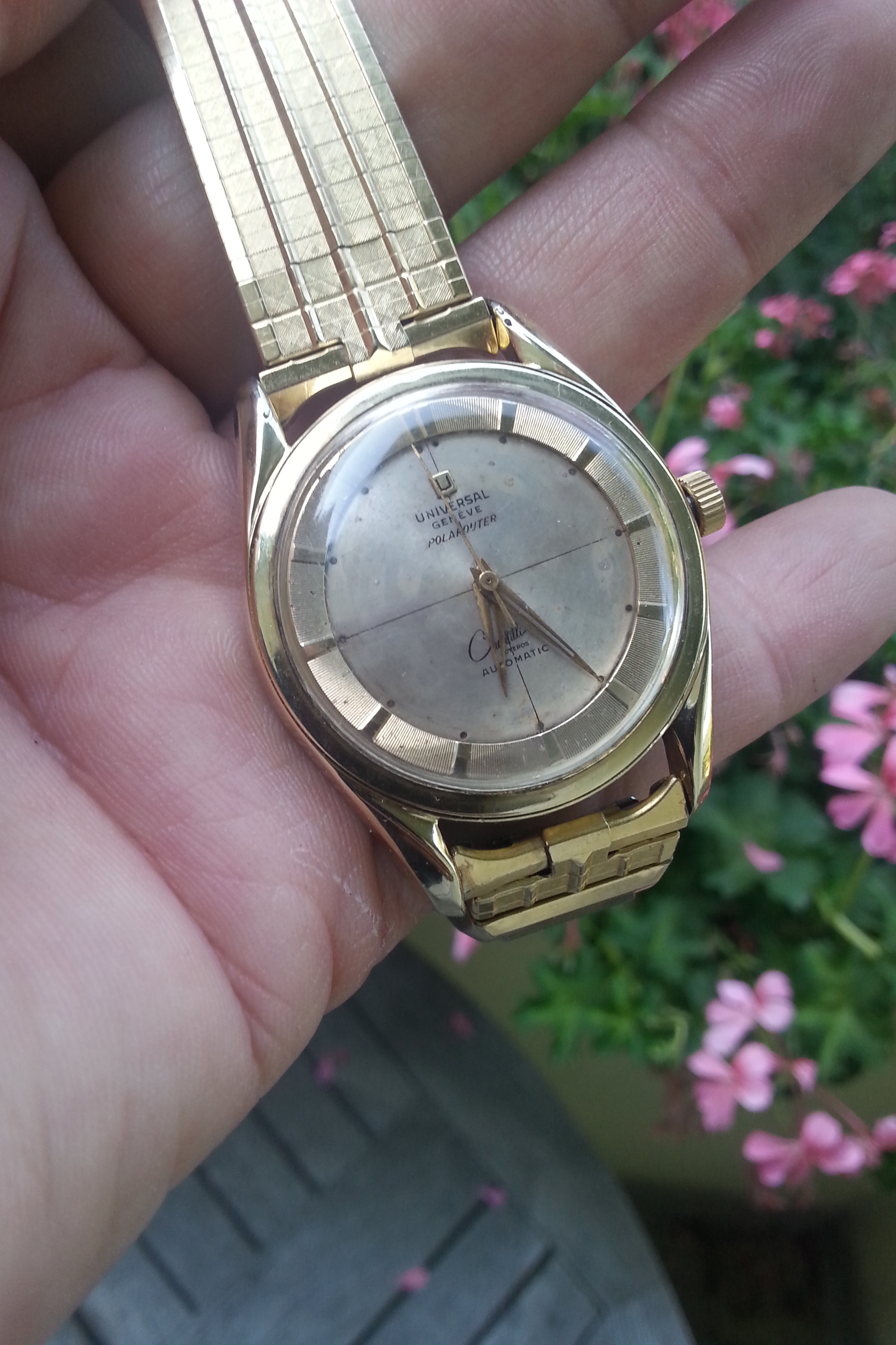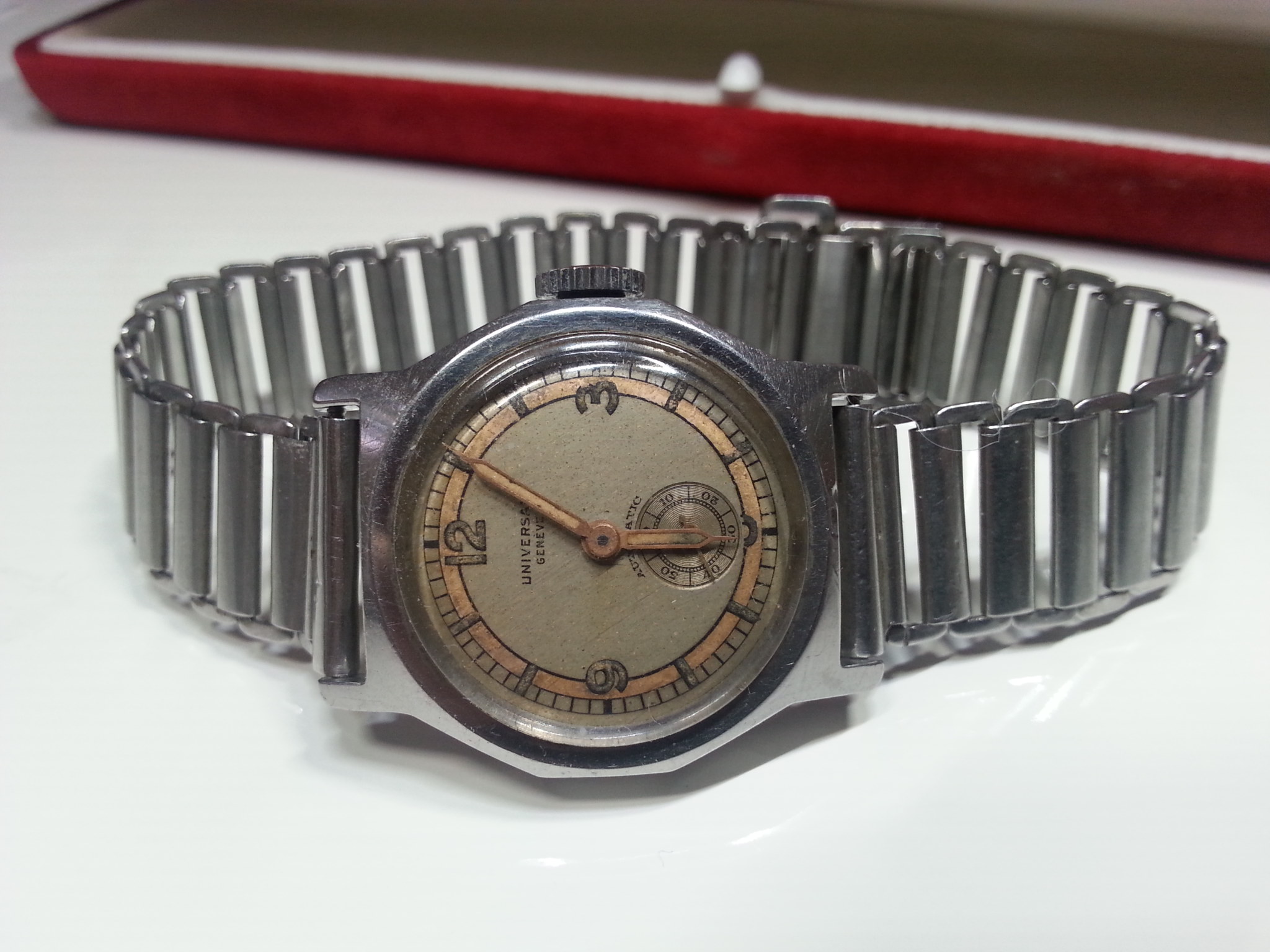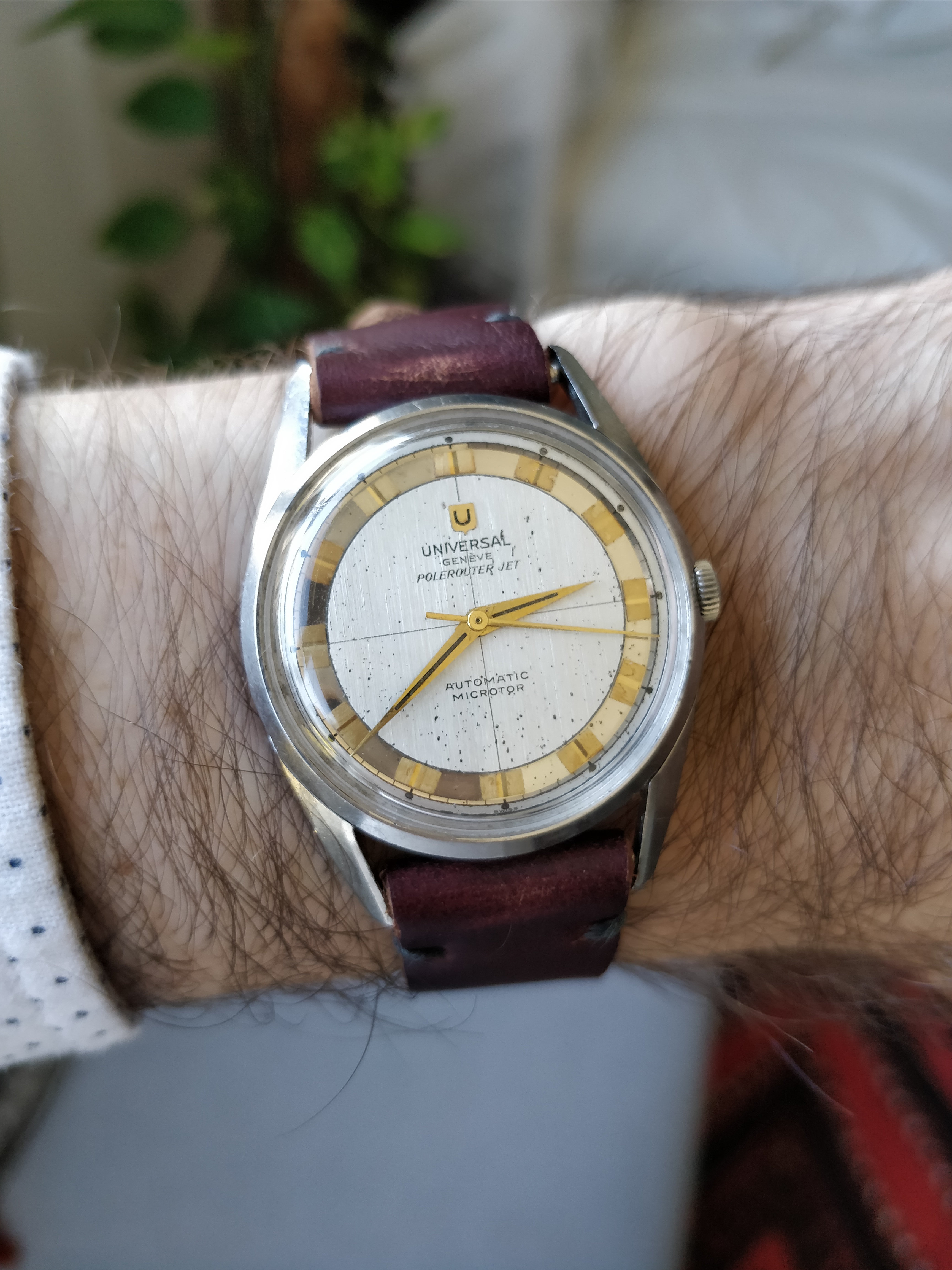 Then I got interested in Universal Gen猫ve and their many Polerouters. After months of research, I bought a Jet, with a dial I find magnificent. The watch is so beautiful to my eyes that I find it too dressy for me. I almost prefer to look at it than to wear it, and that's a shame. So I'm selling it for this reason, and the fact that in the meantime, I got the Speedmaster virus.