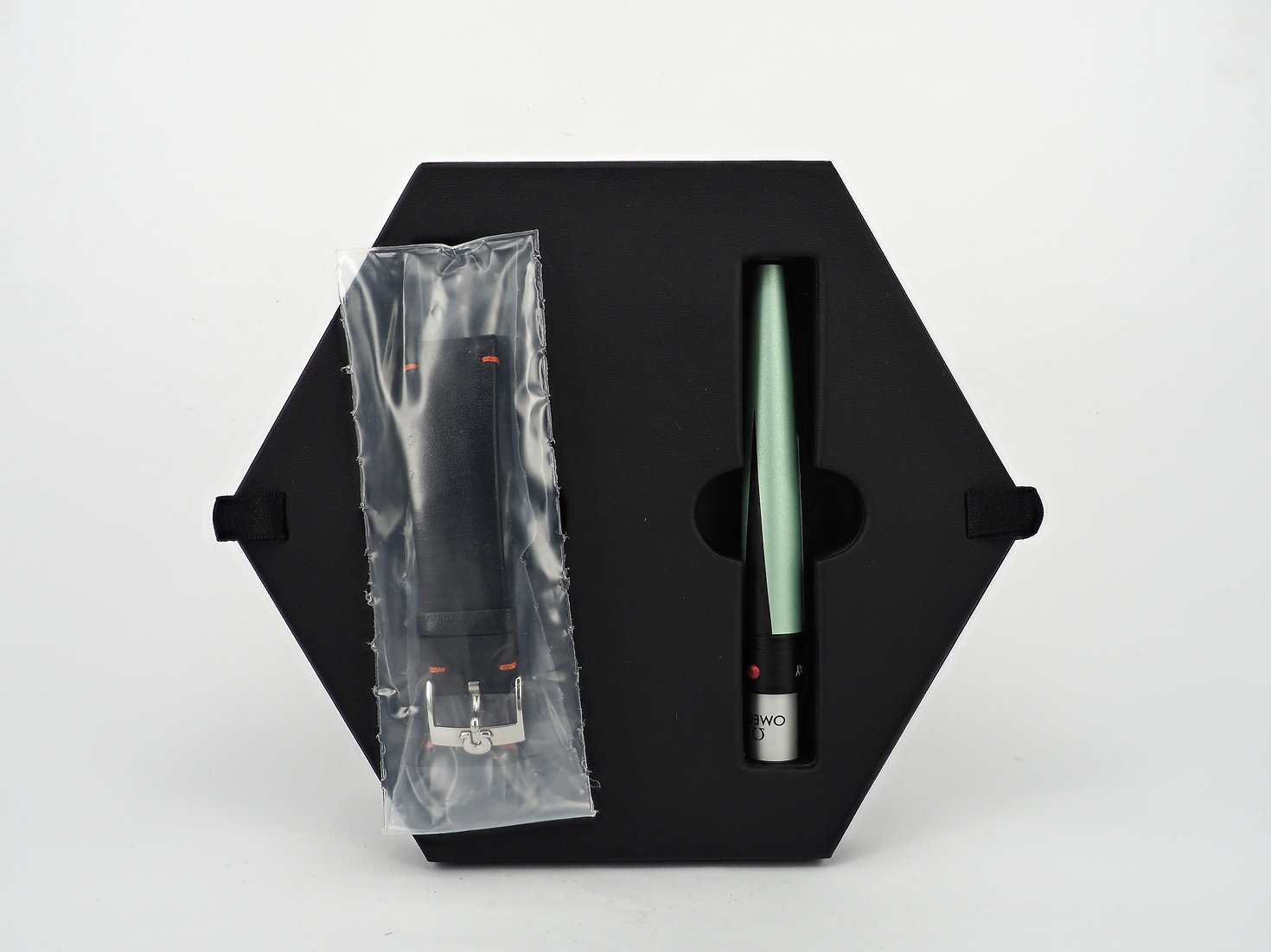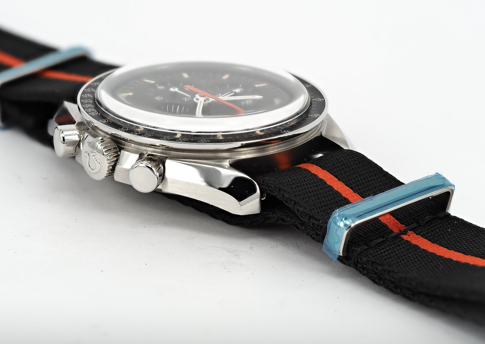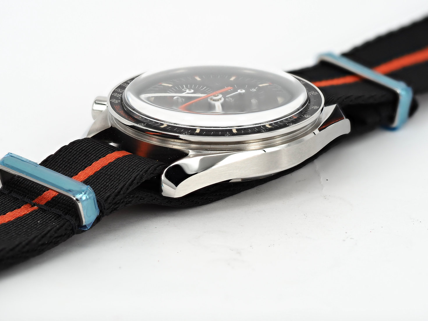 Bracelet: Omega black & orange NATO strap with additional black leather strap.