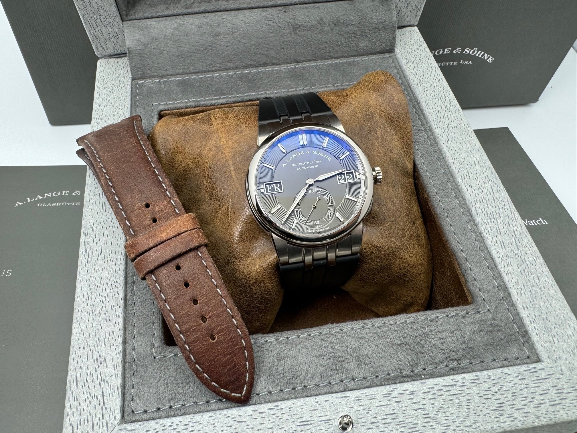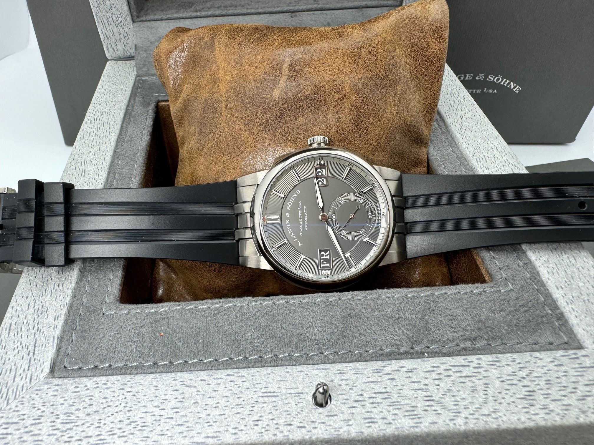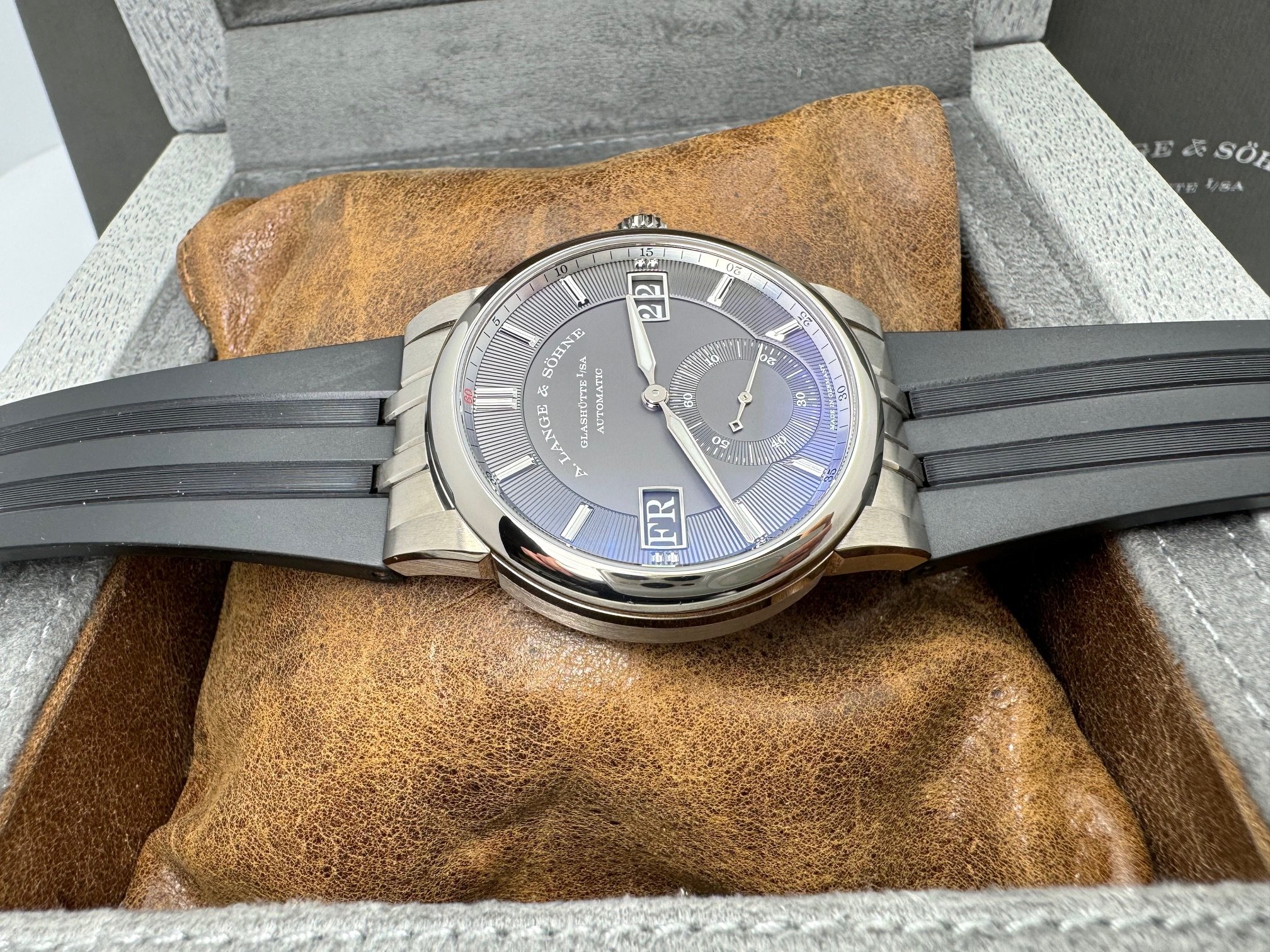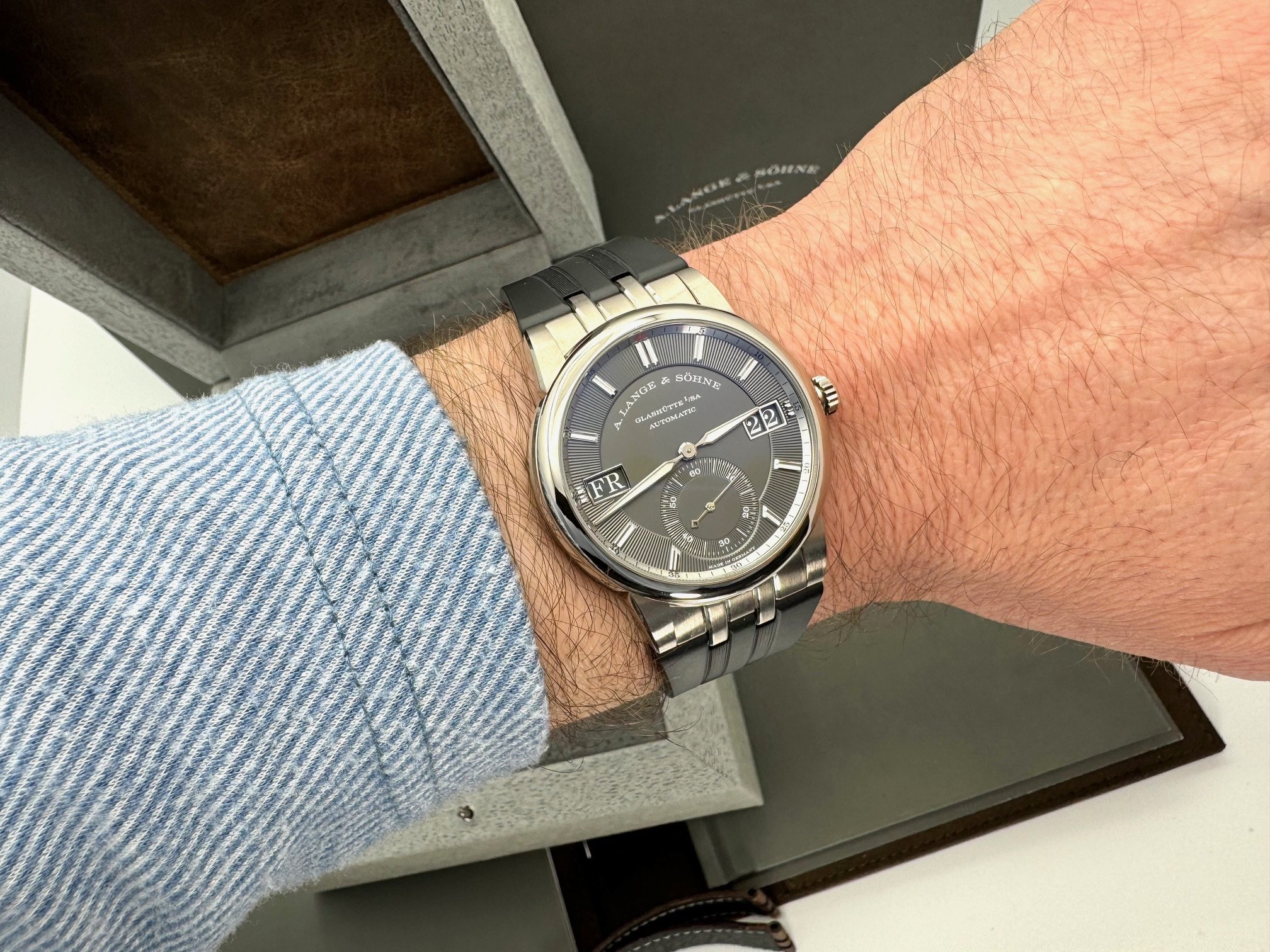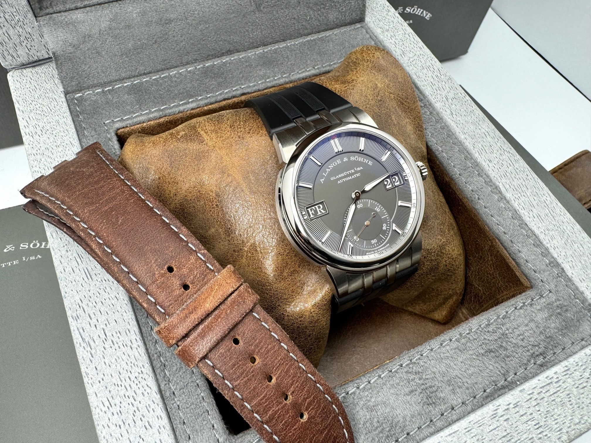 The case measures 40.5mm (11.1mm thickness) and the watch features include outsize date, day-of-week display, and a grey dial made of brass. It is powered by the L155.1 movement (312 unique parts) with an approximate 50 hour power reserve. This model is available exclusively in Lange boutiques.