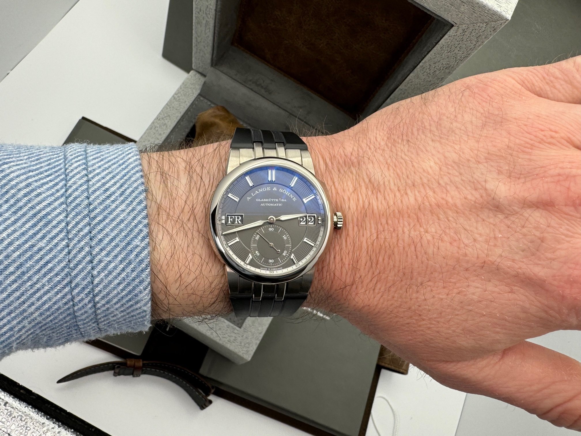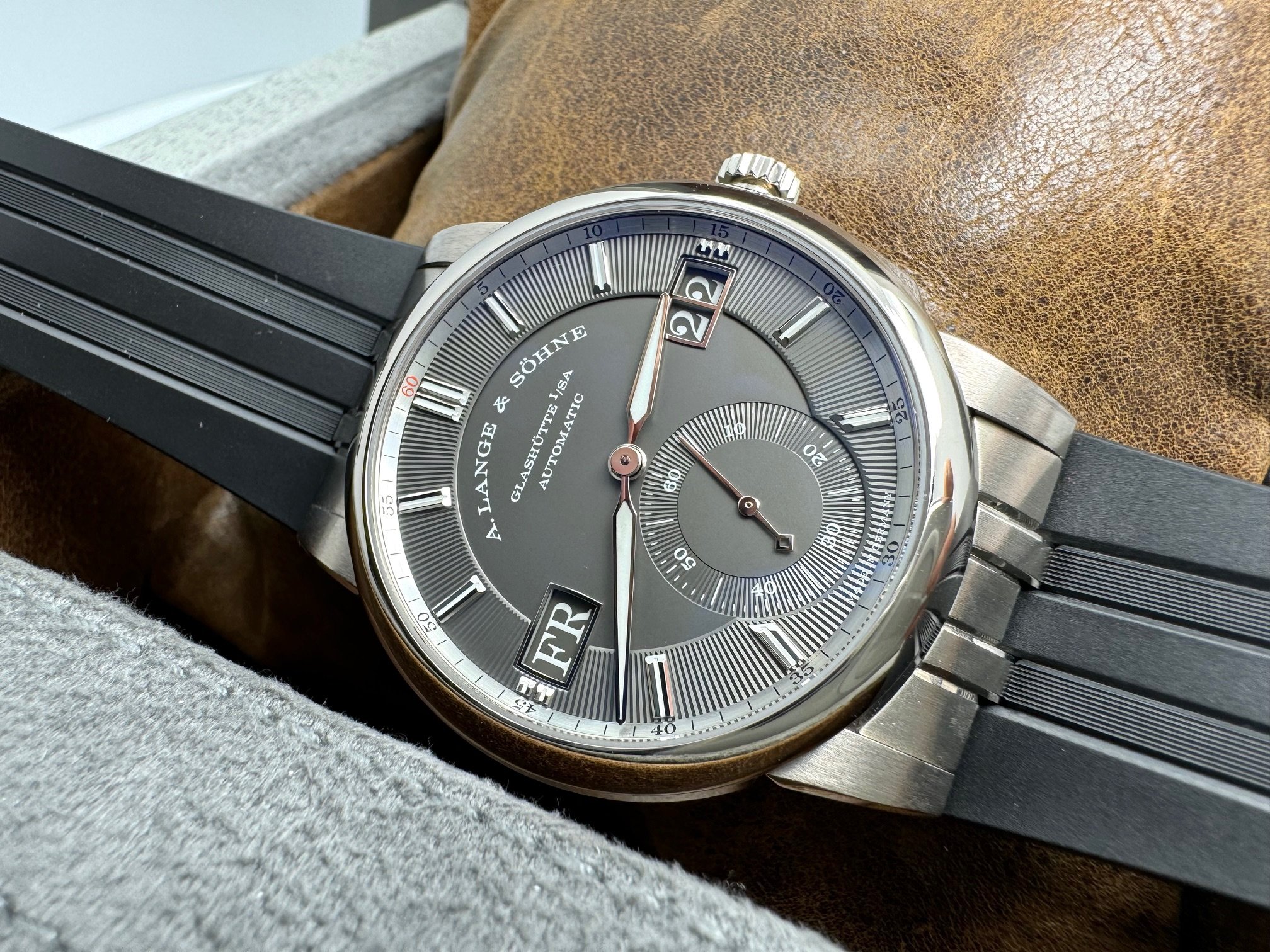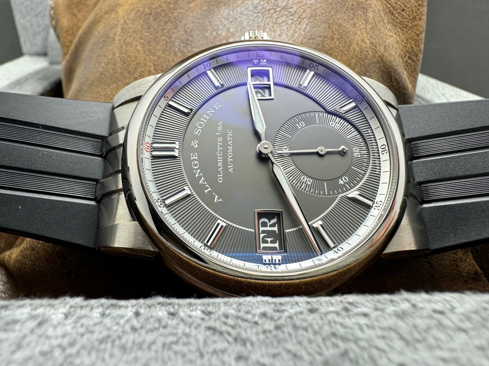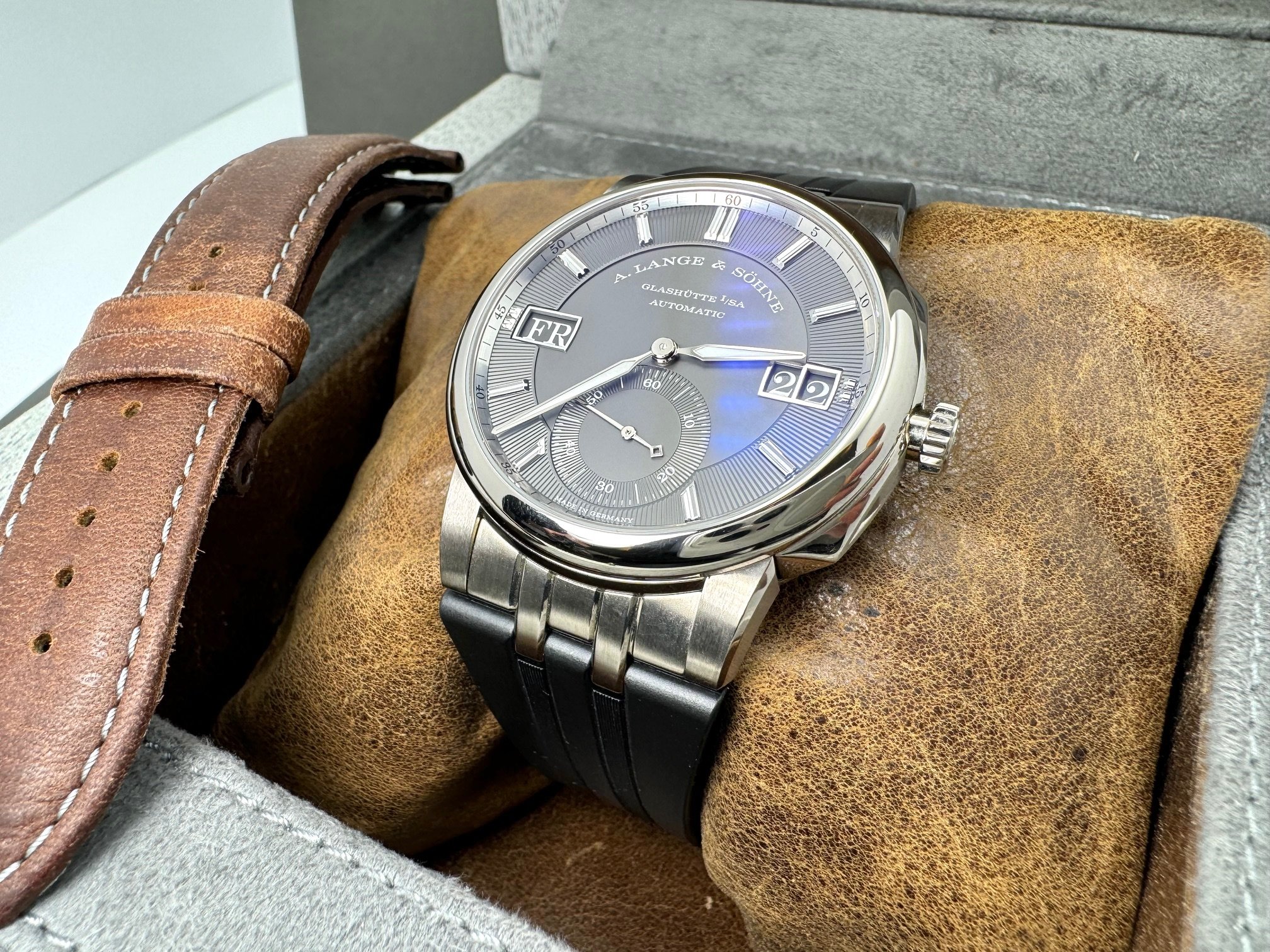 The case measures 40.5mm (11.1mm thickness) and the watch features include outsize date, day-of-week display, and a grey dial made of brass. It is powered by the L155.1 movement (312 unique parts) with an approximate 50 hour power reserve. This model is available exclusively in Lange boutiques.