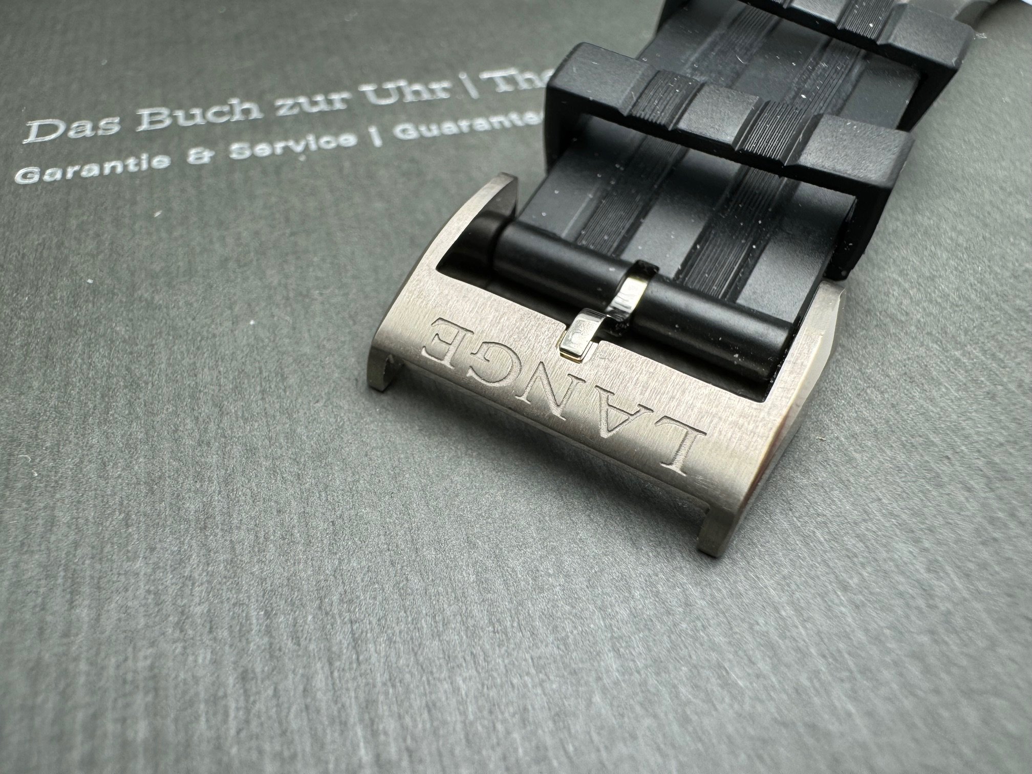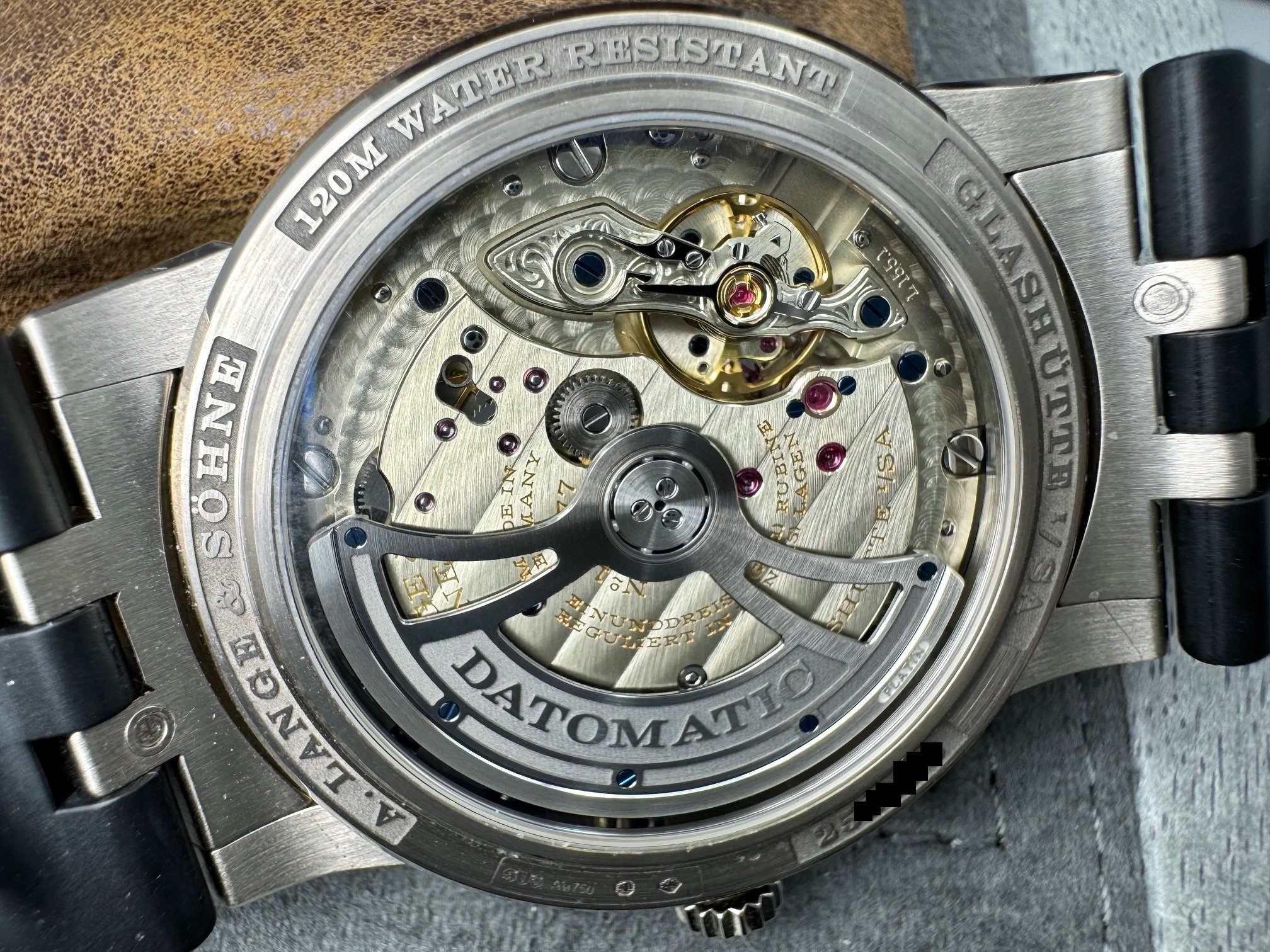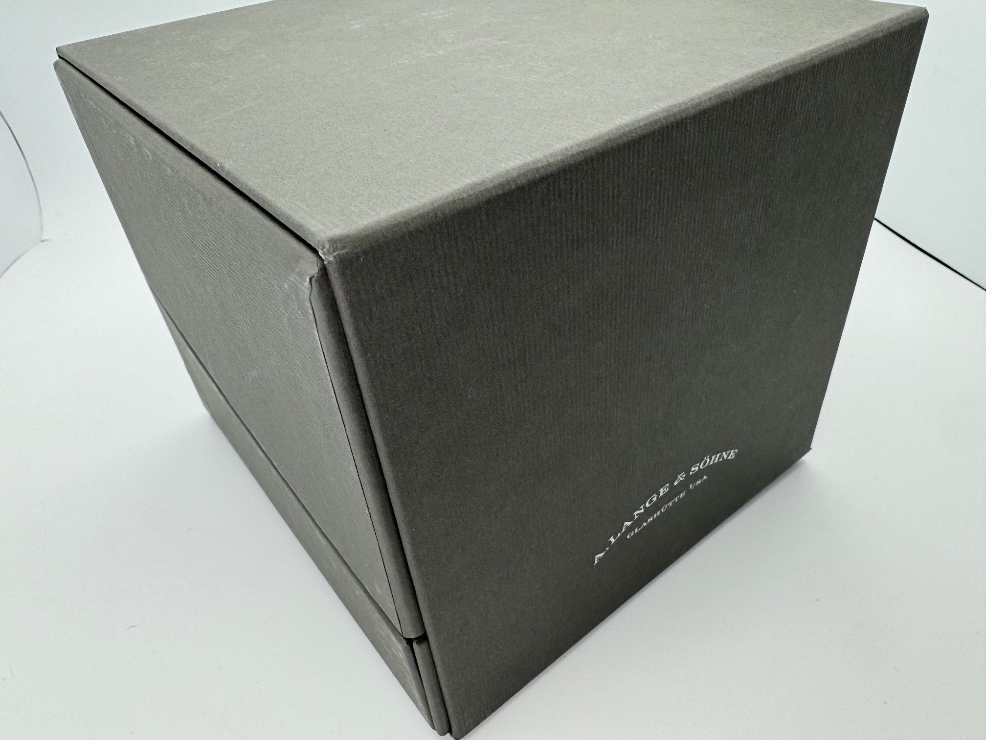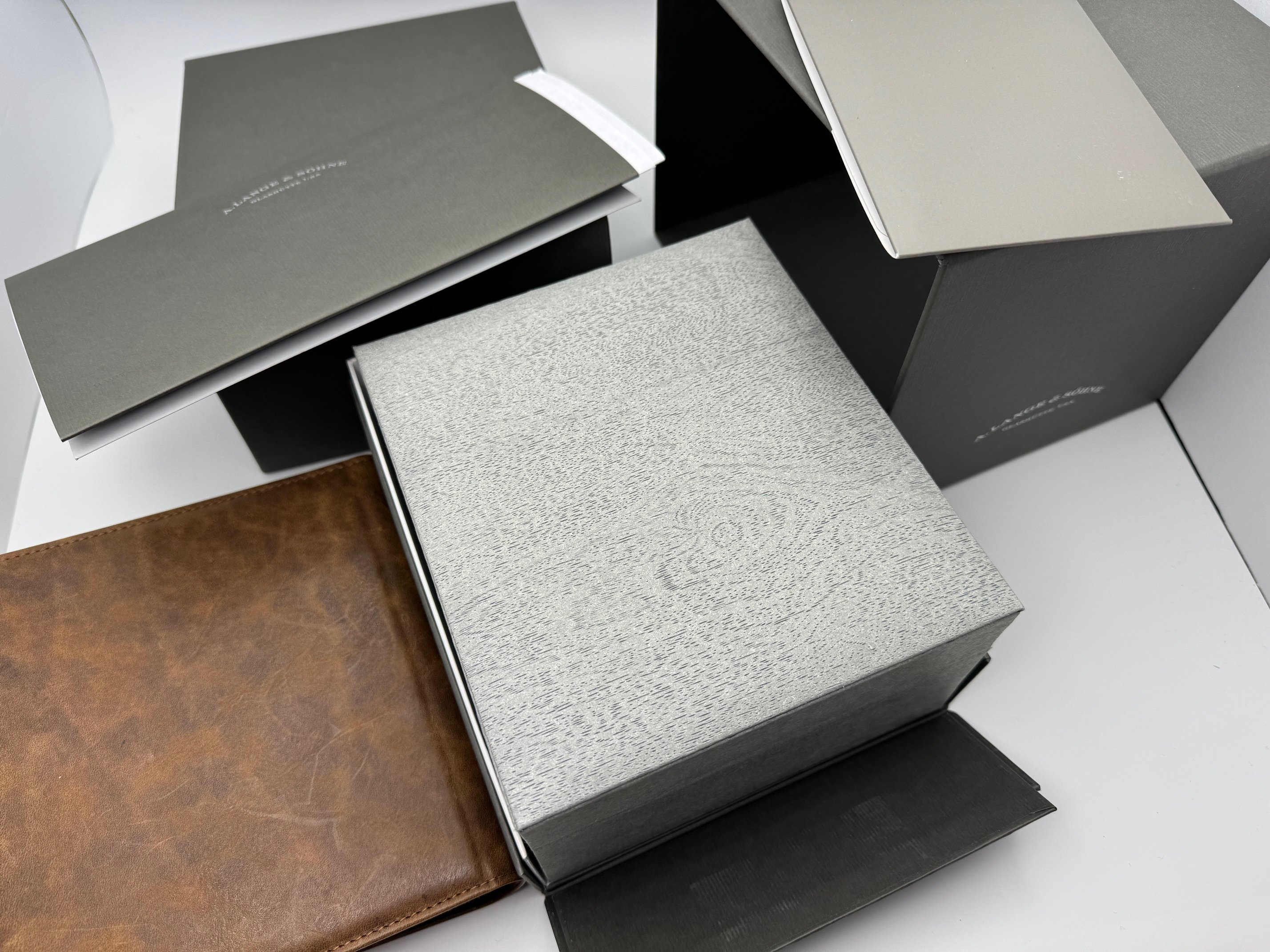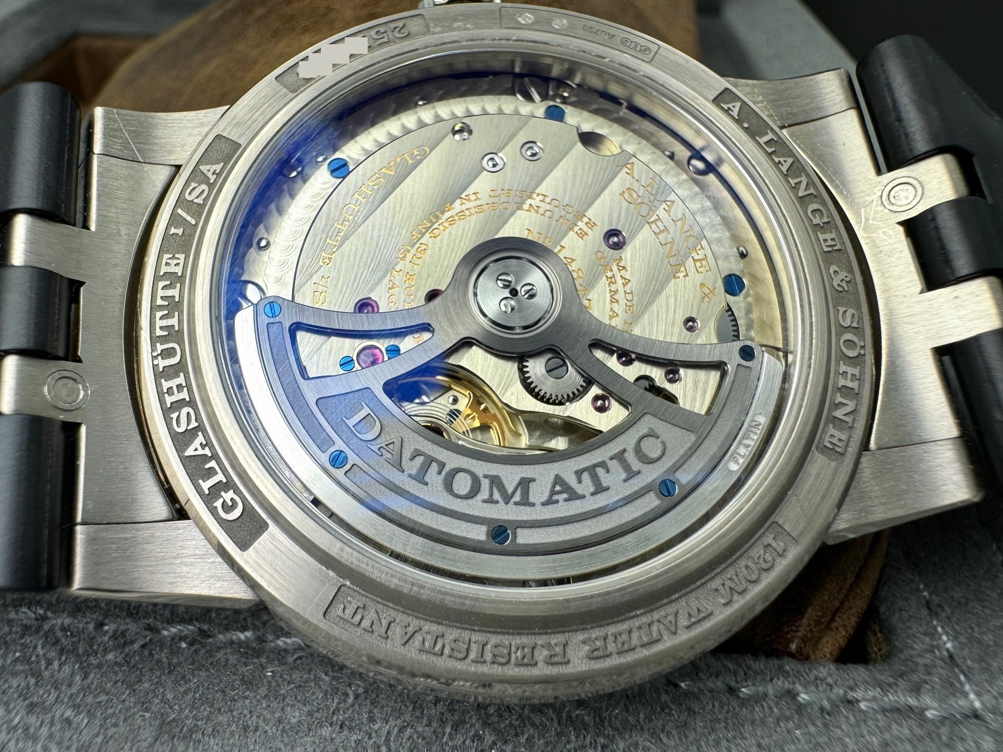The case measures 40.5mm (11.1mm thickness) and the watch features include outsize date, day-of-week display, and a grey dial made of brass. It is powered by the L155.1 movement (312 unique parts) with an approximate 50 hour power reserve. This model is available exclusively in Lange boutiques.