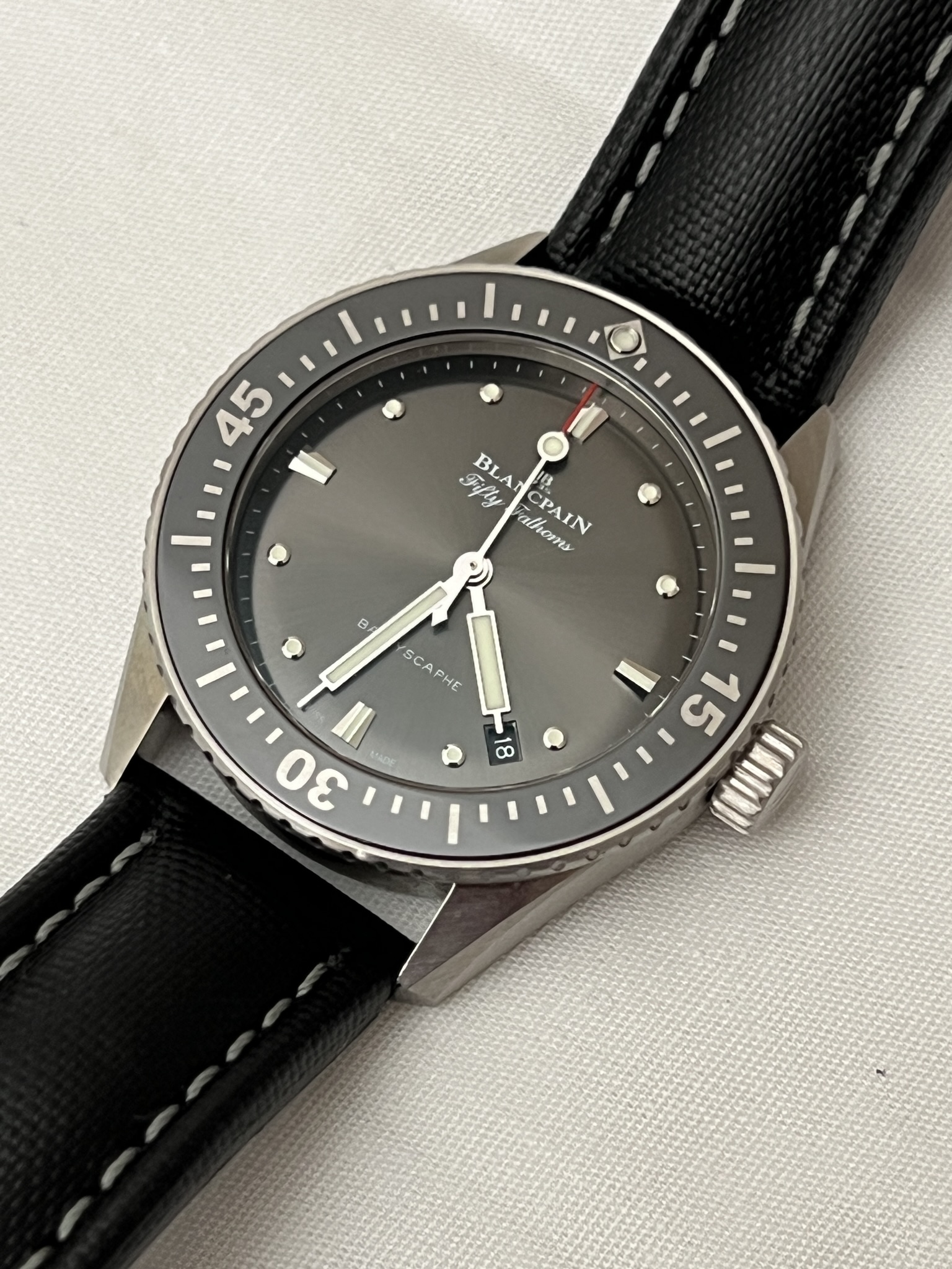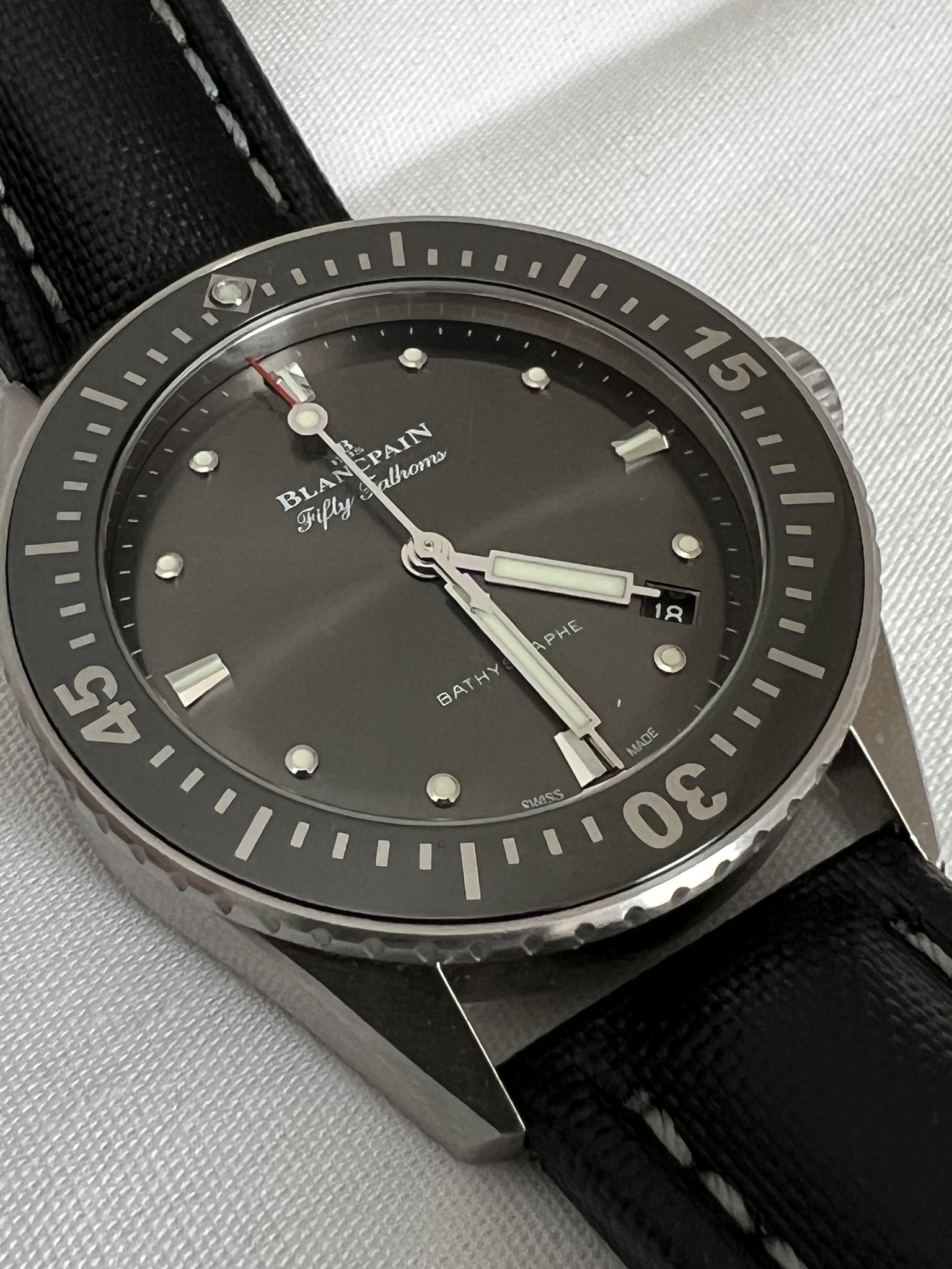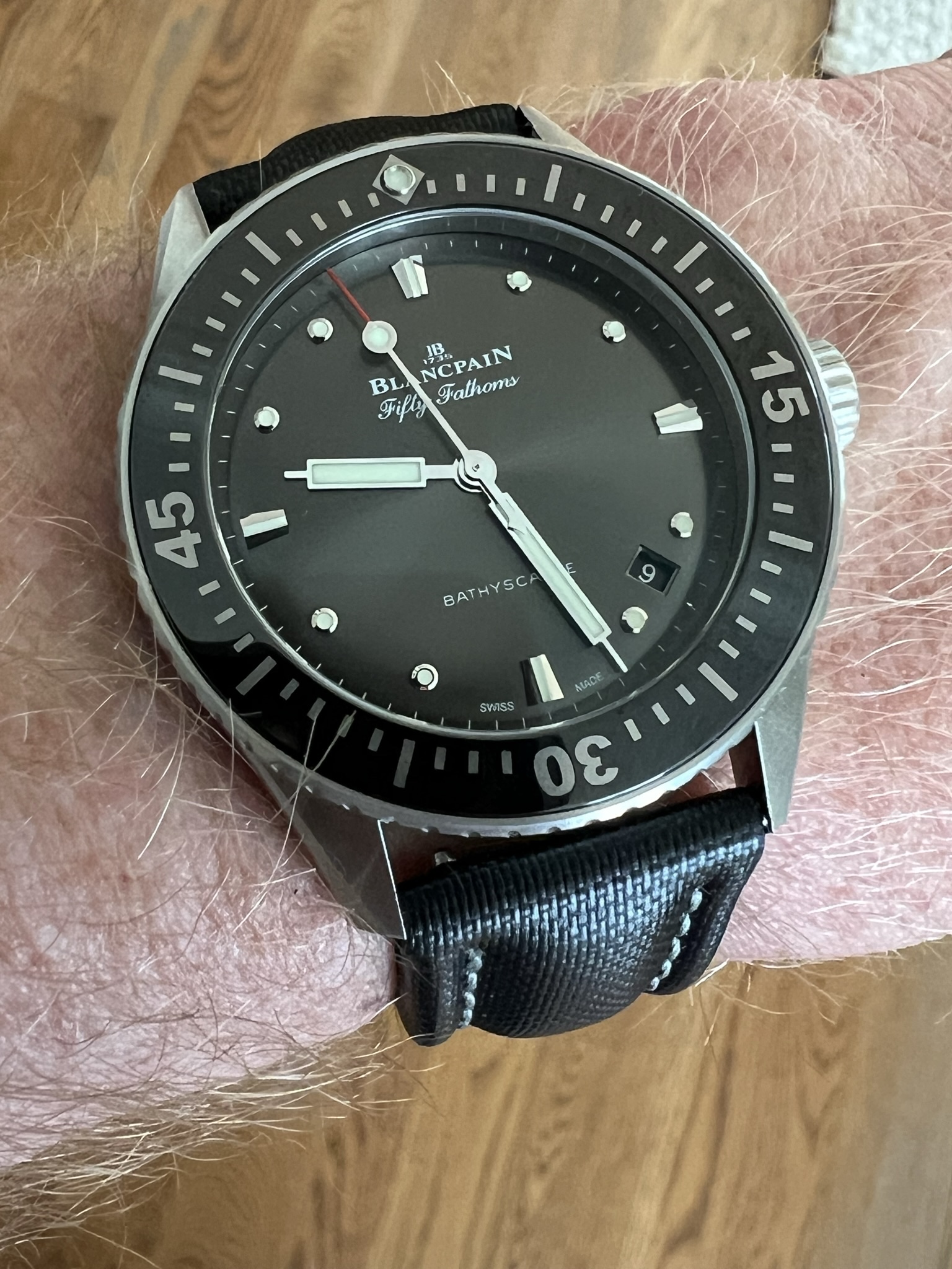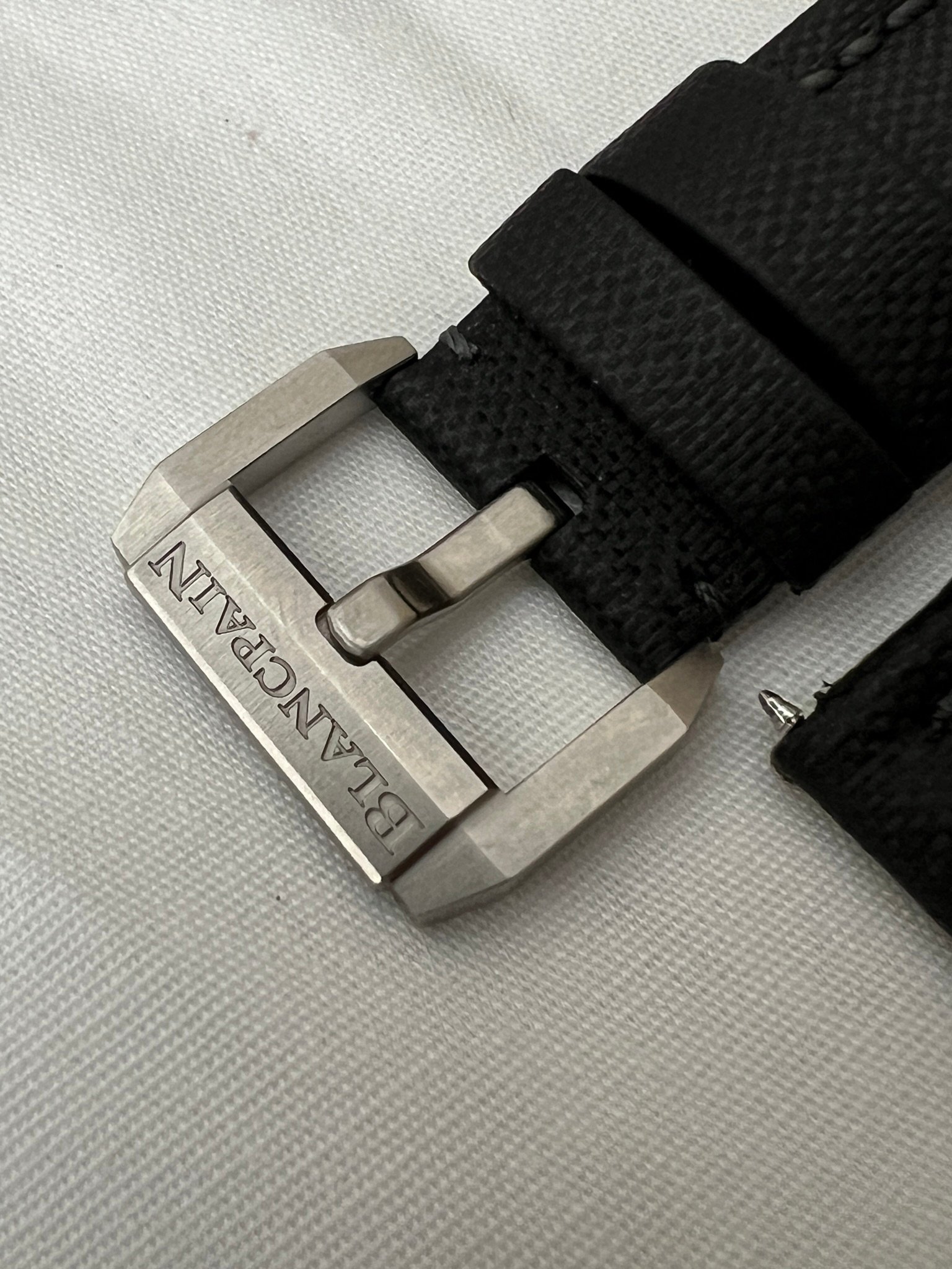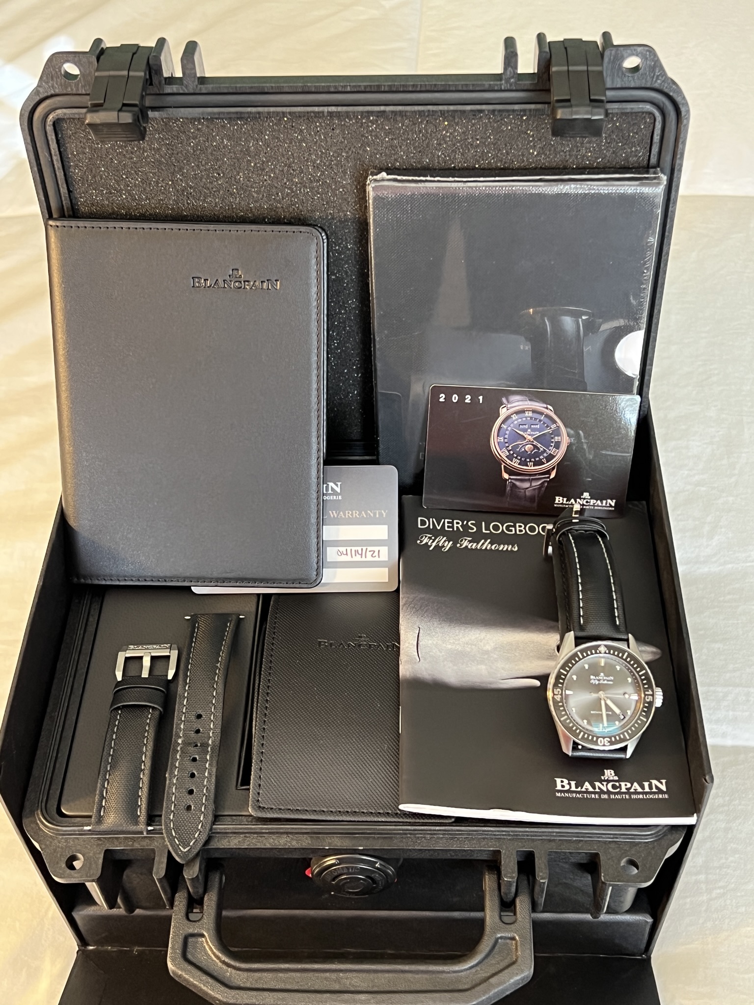 The watch has a five-day power reserve, uni-directional bezel, and a grey-black sunburst dial to die for. The serial number is edited out in the photos, but is in the 1000s. Comes with full kit -- both outer and inner (massively overengineered) box -- including warranty card indicating purchase from an authorized U.S. dealer in April 2021. I'm also including a new Artem sailcloth strap (retail $85 USD) made especially for Blancpain dive watches.