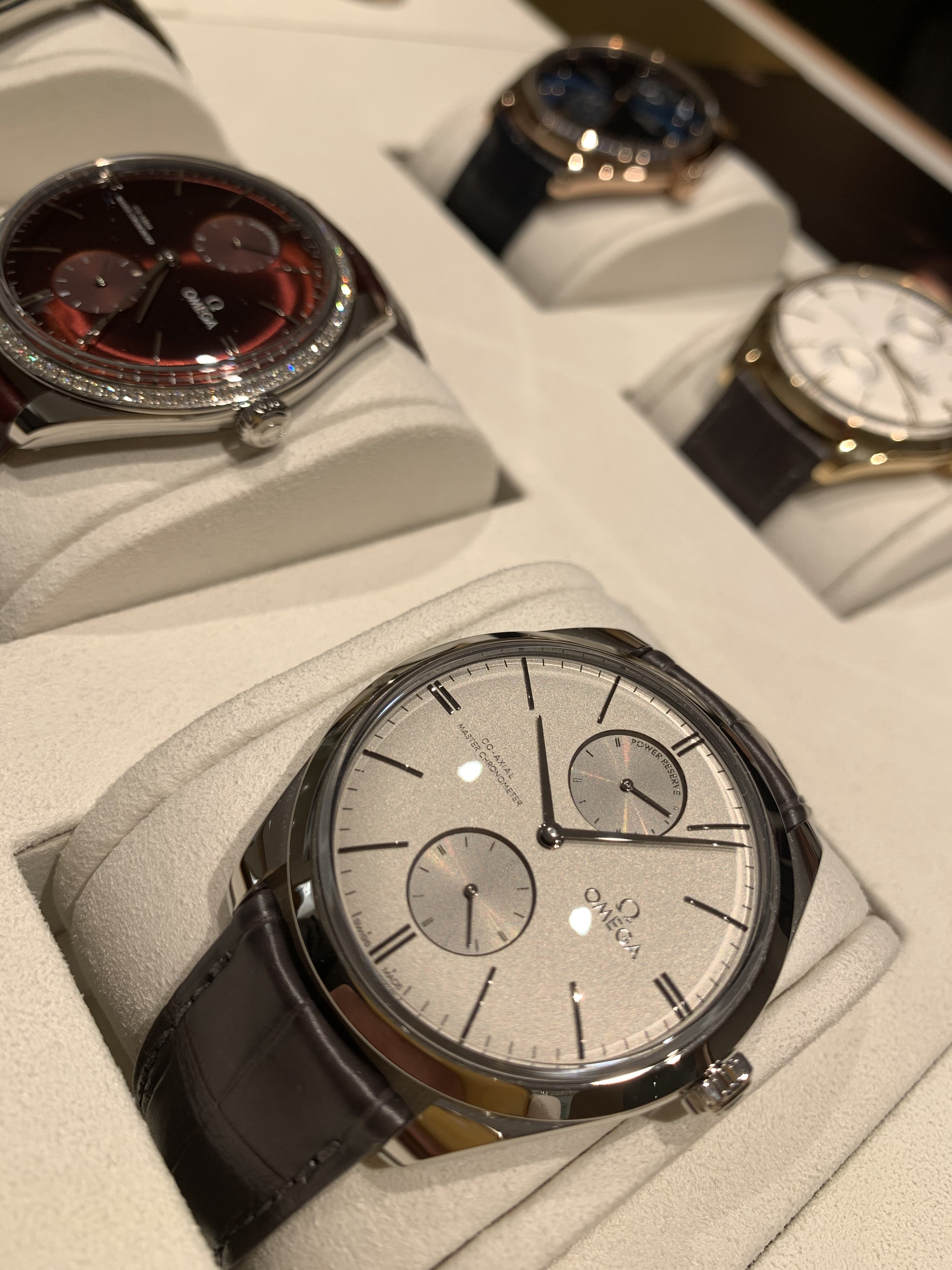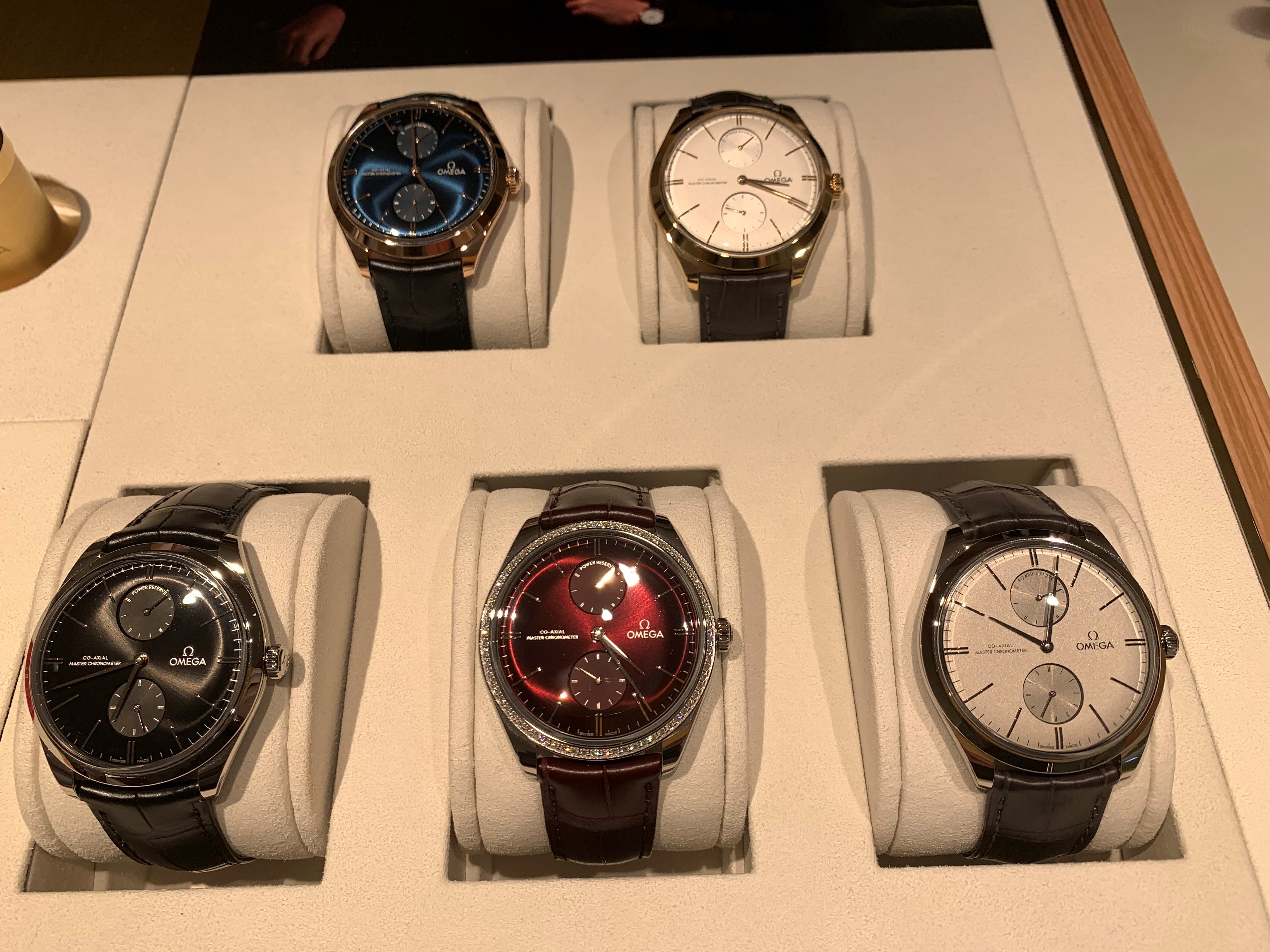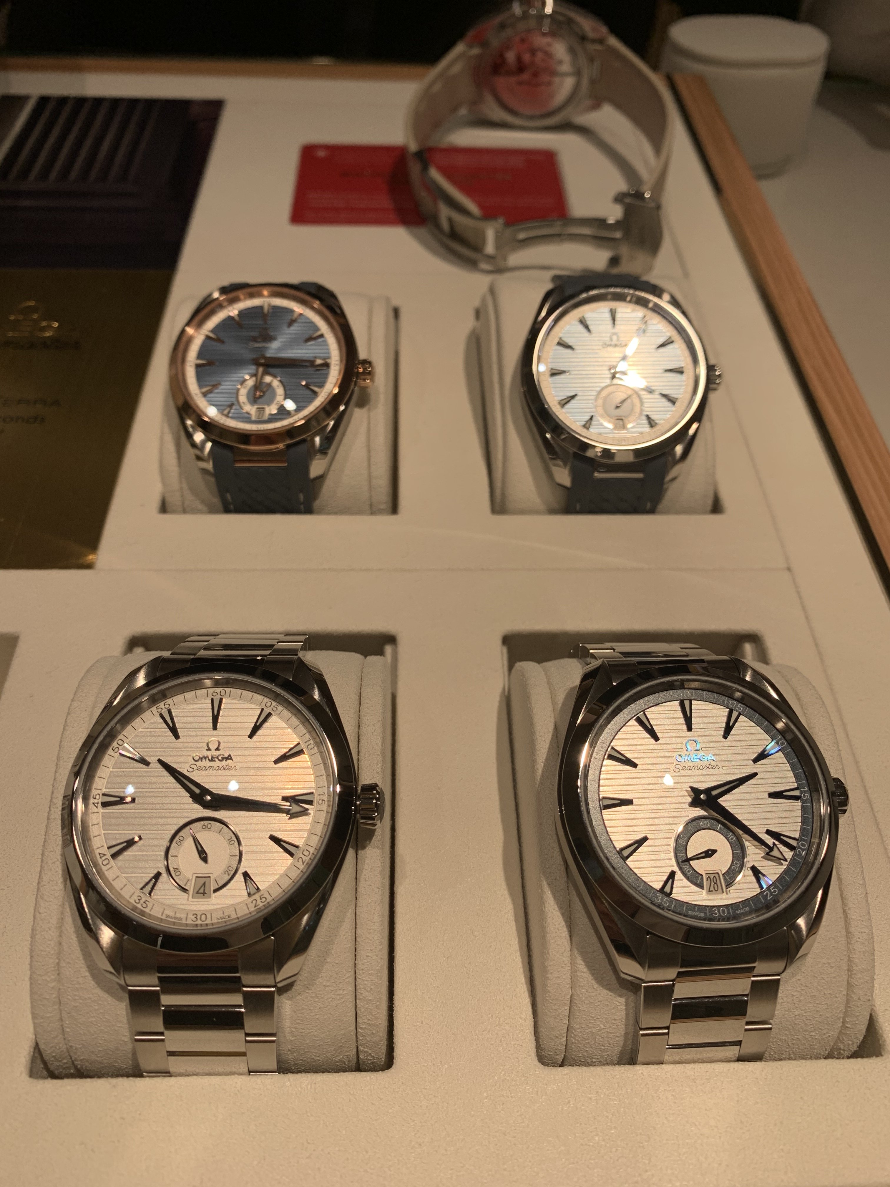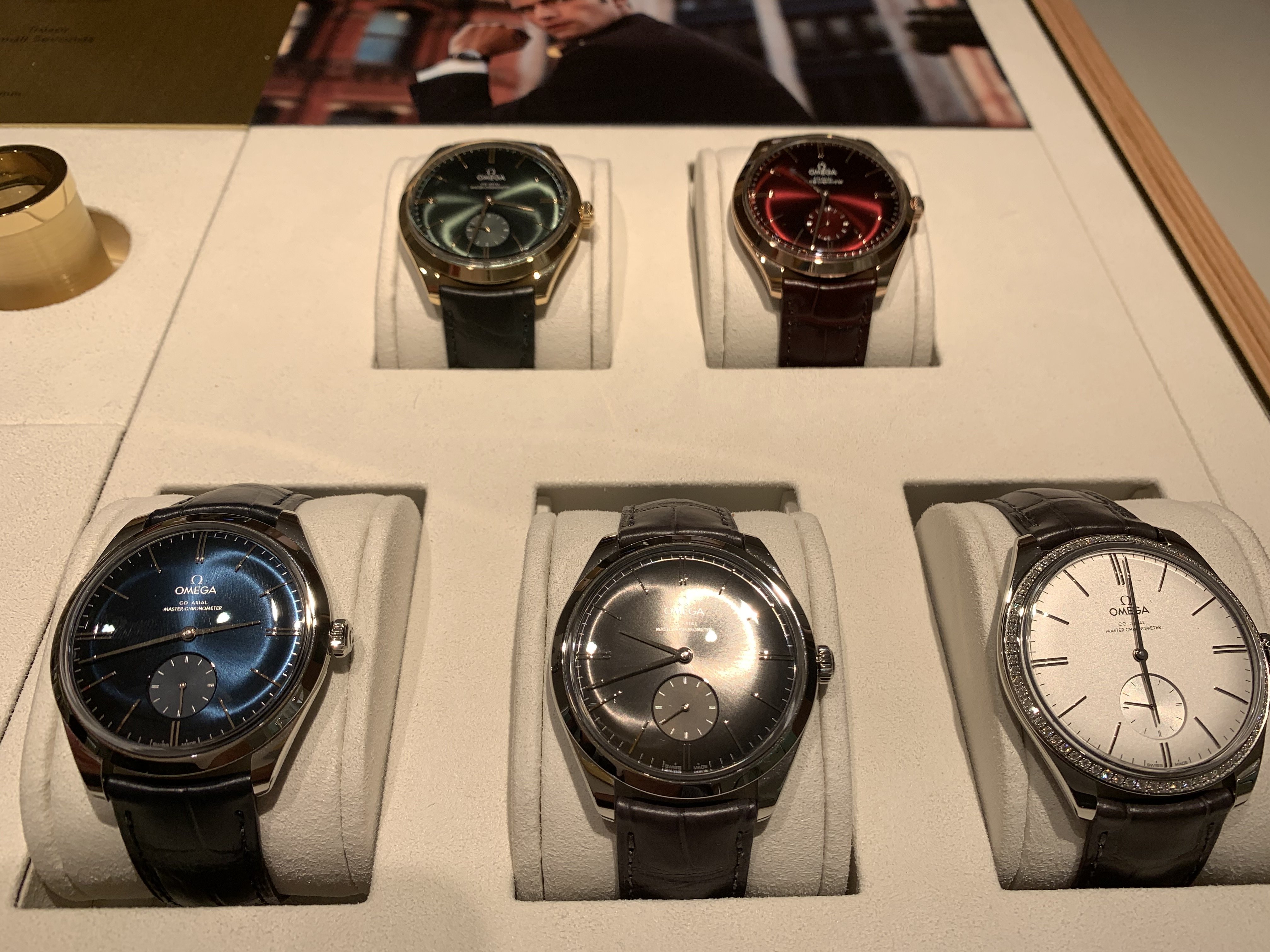 As per usual, I grabbed the opportunity when it presented itself to me to go and see the new Omega novelties in the flesh. And here are some pictures with a few impressions. The focus is not always a hit in some shots .. sorry! It is quite a challenge taking pictures on a phone with a gloved hand. That said, the biggest drawback as you most likely know, is the lighting and shadows in boutiques, especially those without windows to let in the natural light. It is the worst for looking at watches, and even worse for photography. My local boutique has floor to ceiling windows, so great lighting under normal circumstances on the main floor, however whenever something that requires special attention happens (like showing off all the new watches), its usually down downstairs in the 'bar/chill zone'. I had an hour, and could have taken more pics, but as usual staring usually takes preference.