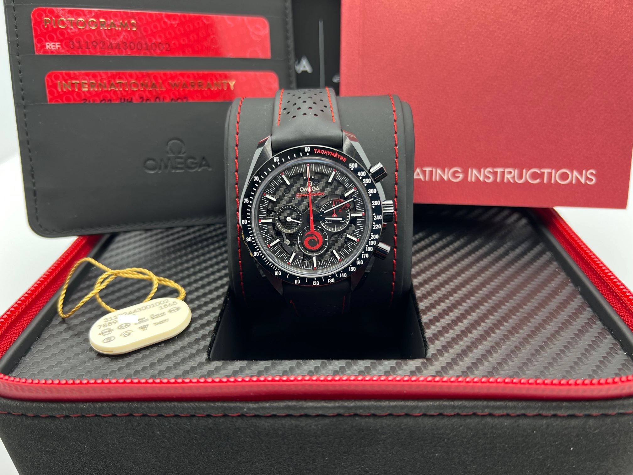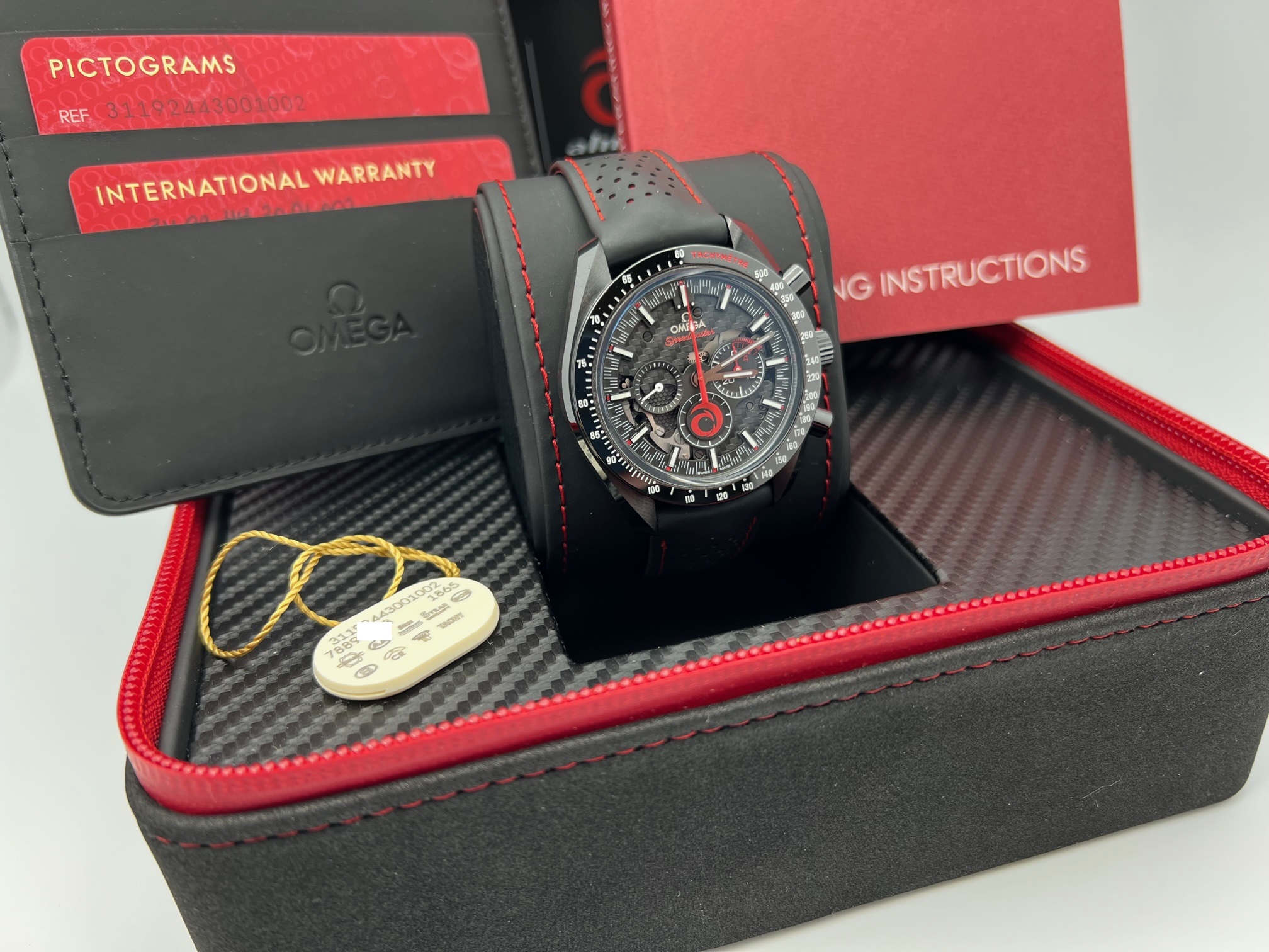 The watch comes complete with the cardboard shipping box, inner/outer presentation boxes, instruction manual, pictogram card, hang tag, and international warranty card.