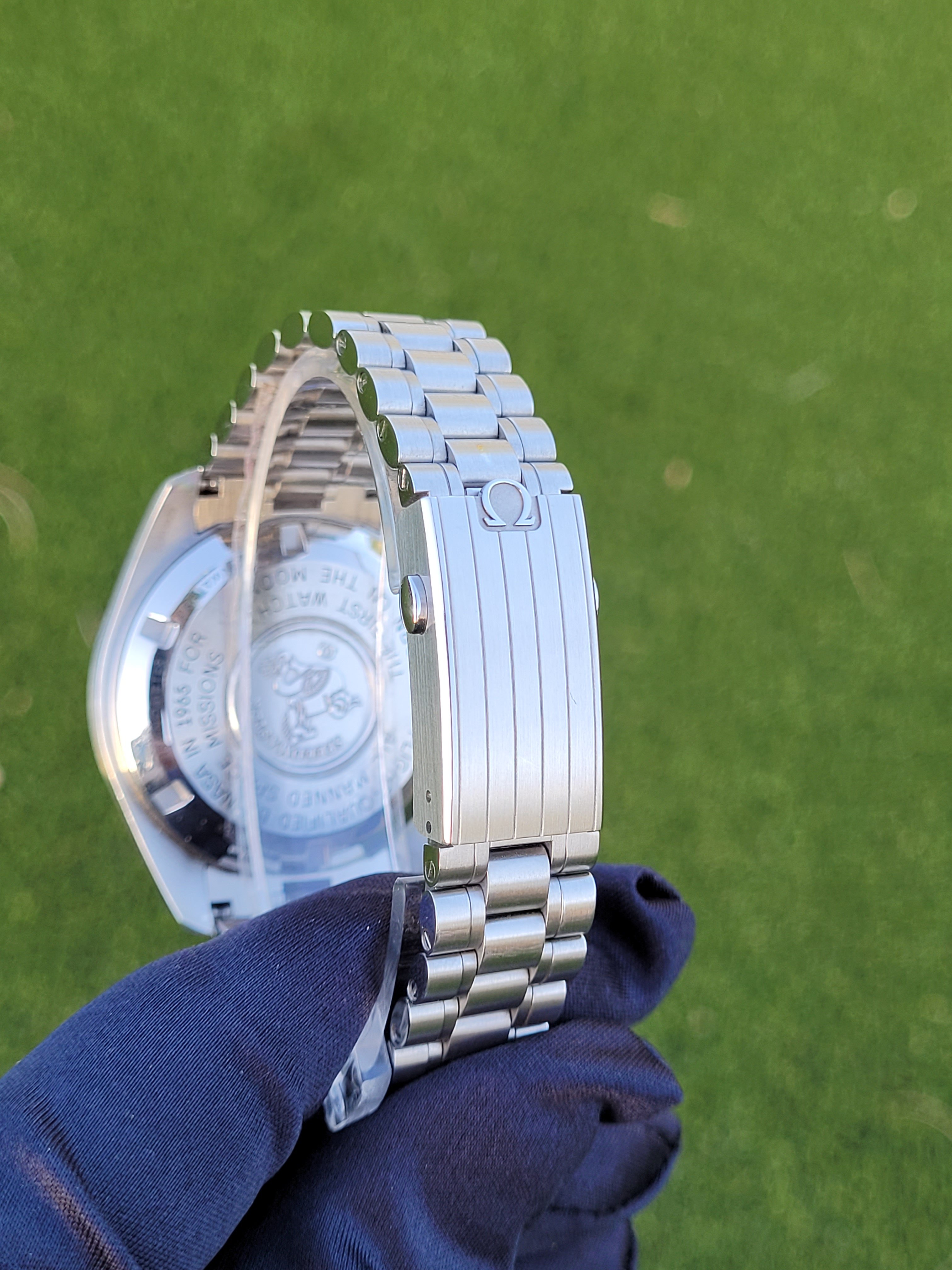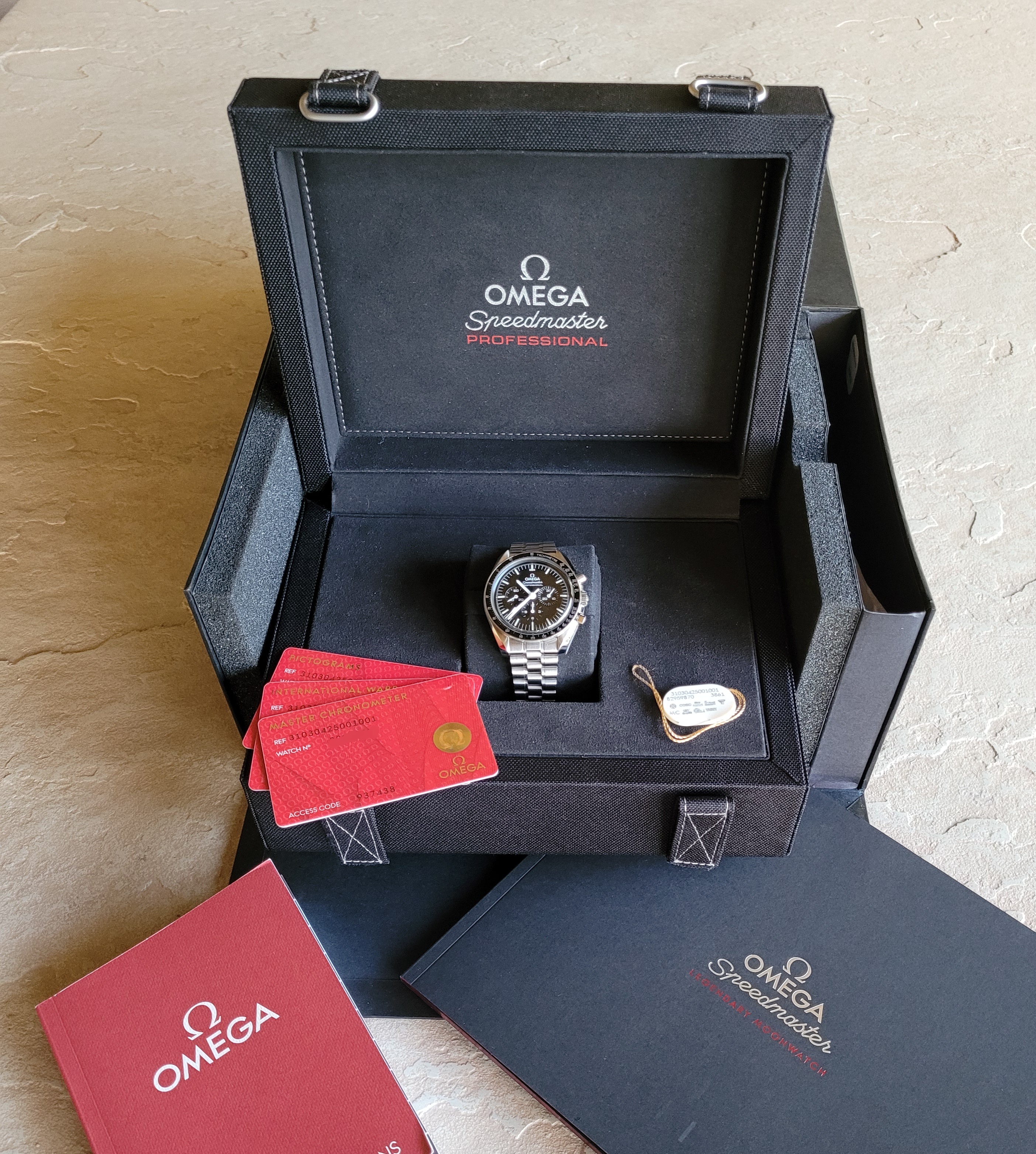 Box, Card, and Accessories: Outer black cardboard box + inner presentation box, all 3 Omega warranty cards, white hang tag, original purchase receipt, all instruction booklets, and all of the bracelet links are included in the sale.