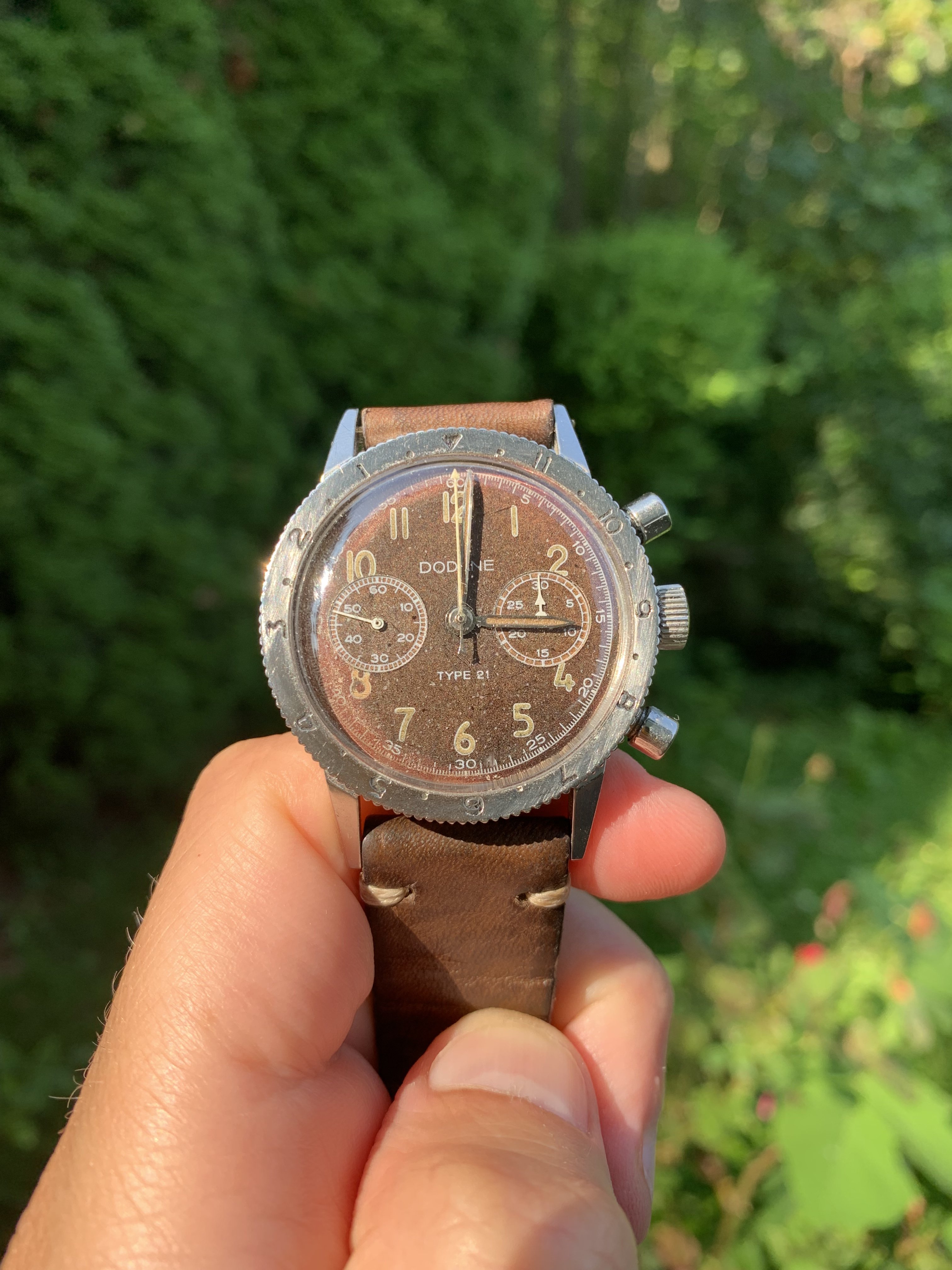 ·the unusual character of valjoux22 especially in this original military watch is the asymmetrical distance between two pushers to the crown. if you notice, the crown is much nearer to the upper (start) pusher than the lower p(stop) hence, very unique. apparently, this is not present in the new version anymore.😉