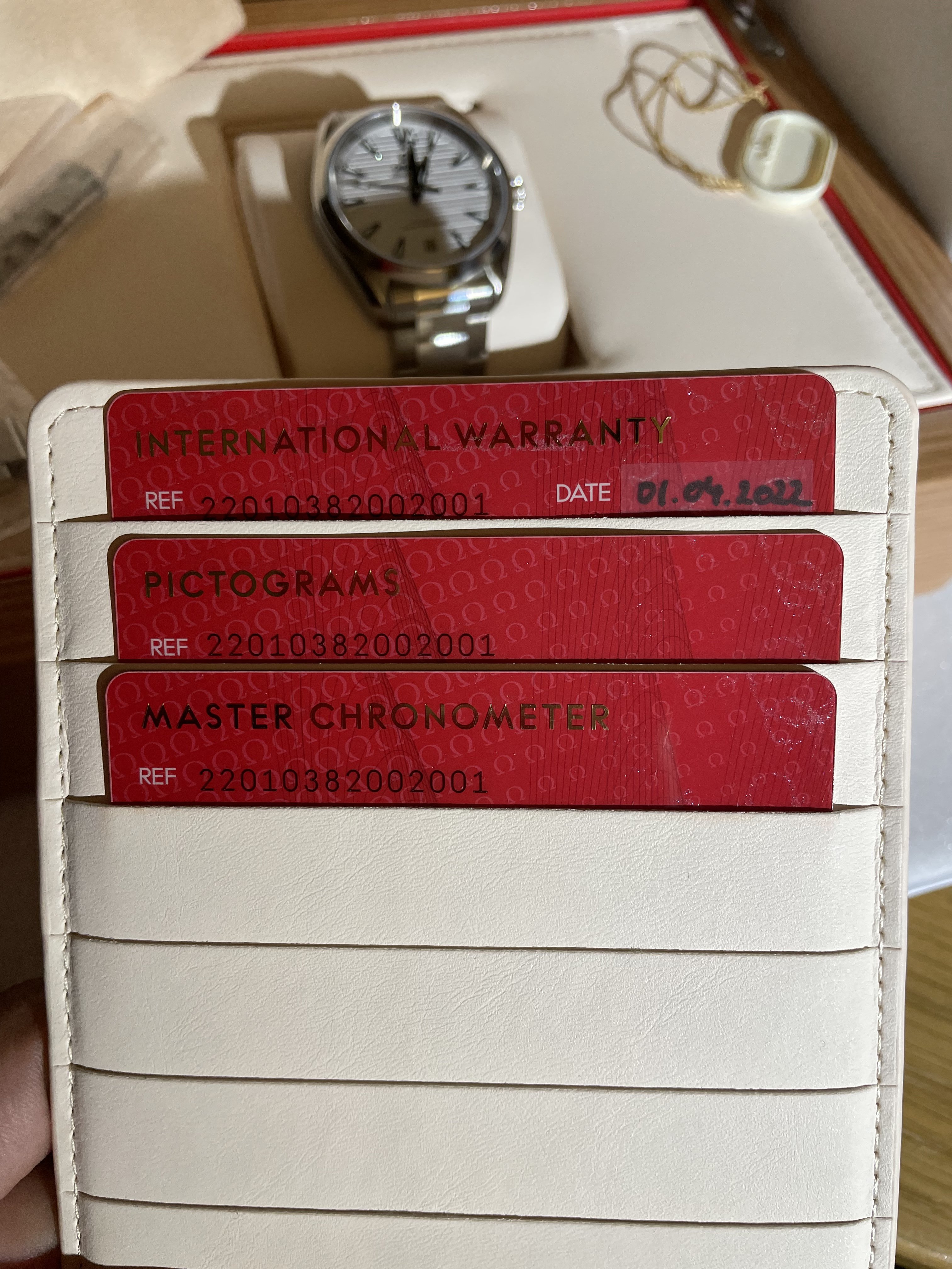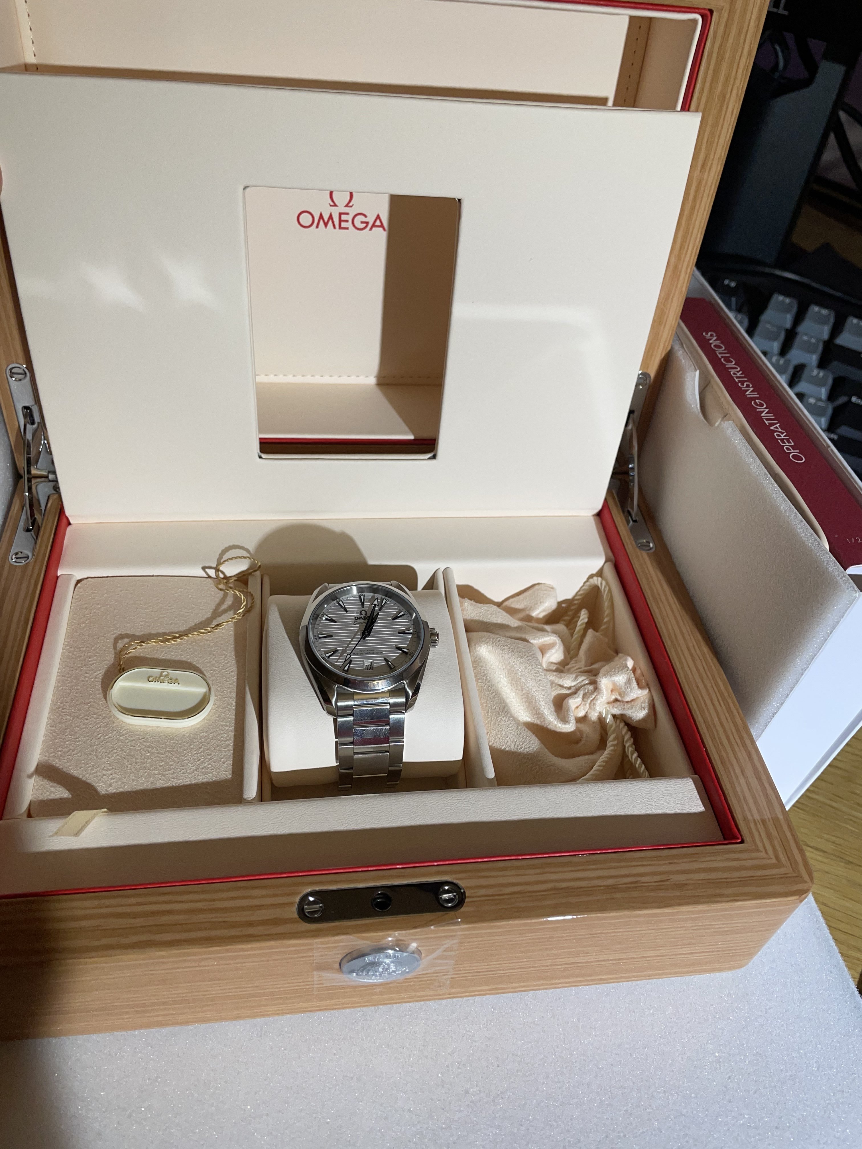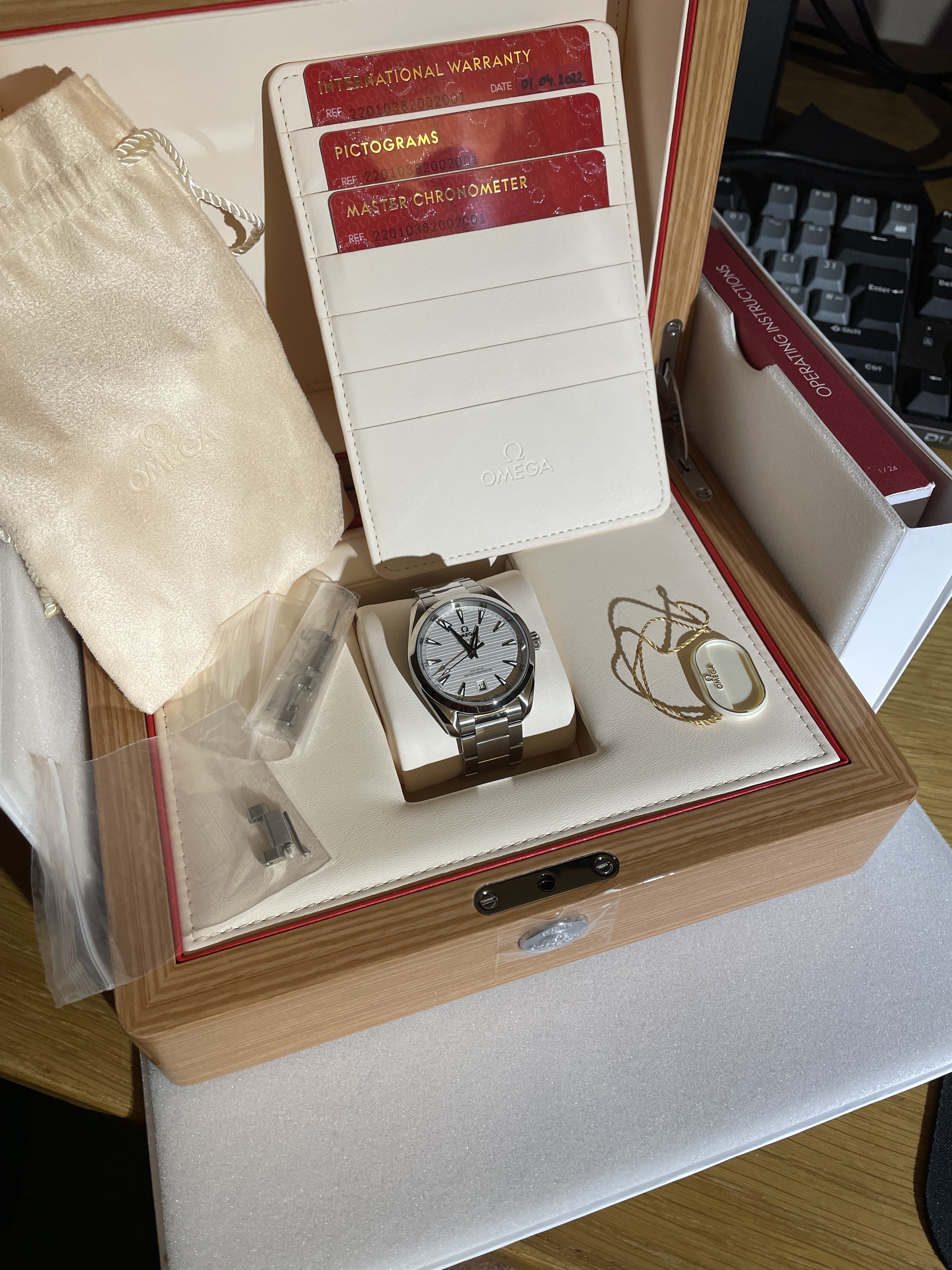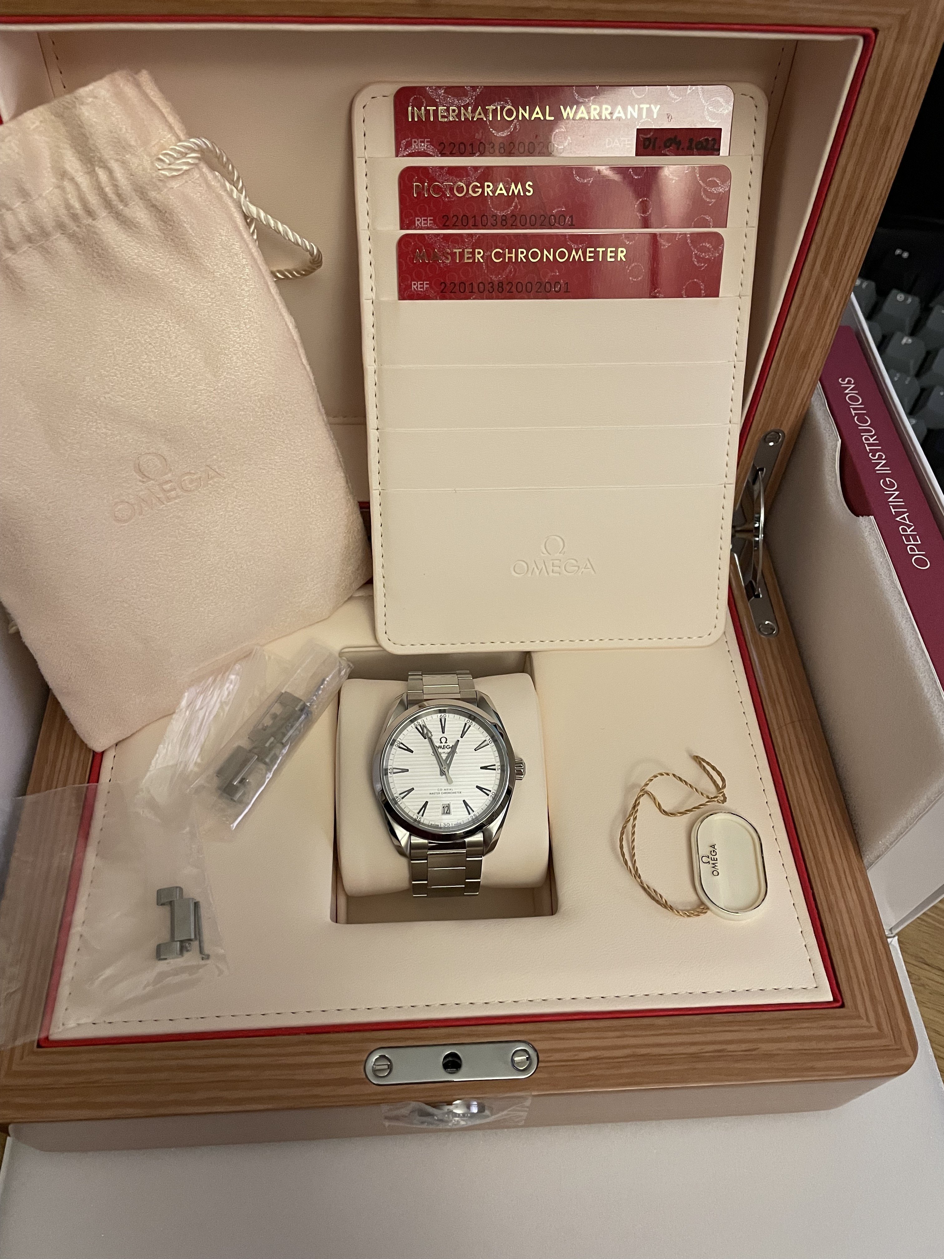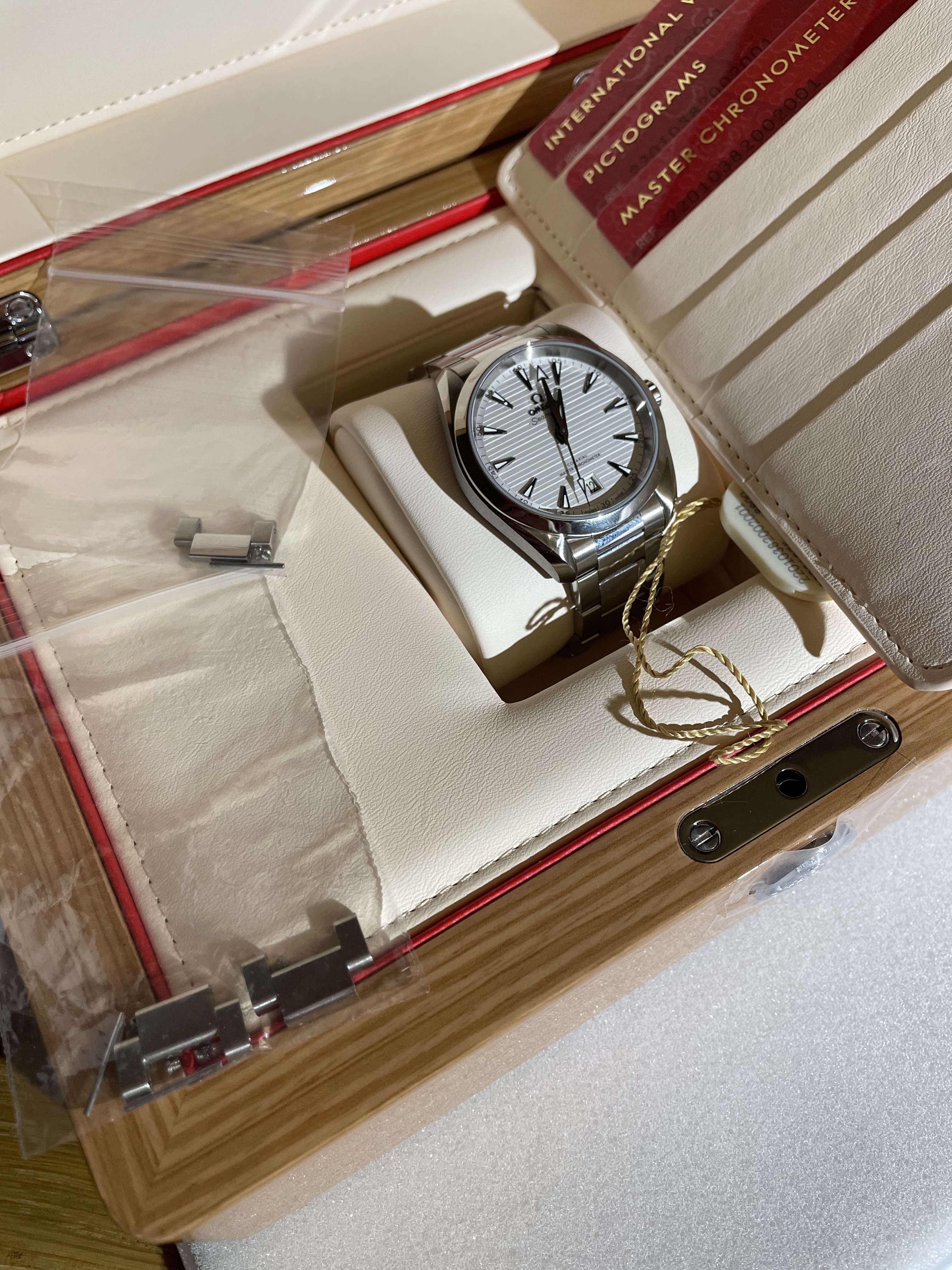 So we have a 38mm white dial Aqua Terra here - reference 220.10.38.20.02.001. I've had it for about 12 days. It is gaining +1s/d in the time that I've had it. I'd call the condition 9.8/10. You'd be hard pressed to think that this watch is pre-owned. This will come as a whole set - box, cards, leather wallet, box, manual, outer box, tag etc. etc. Just like receiving it from the AD minus the sticker on the case back.
