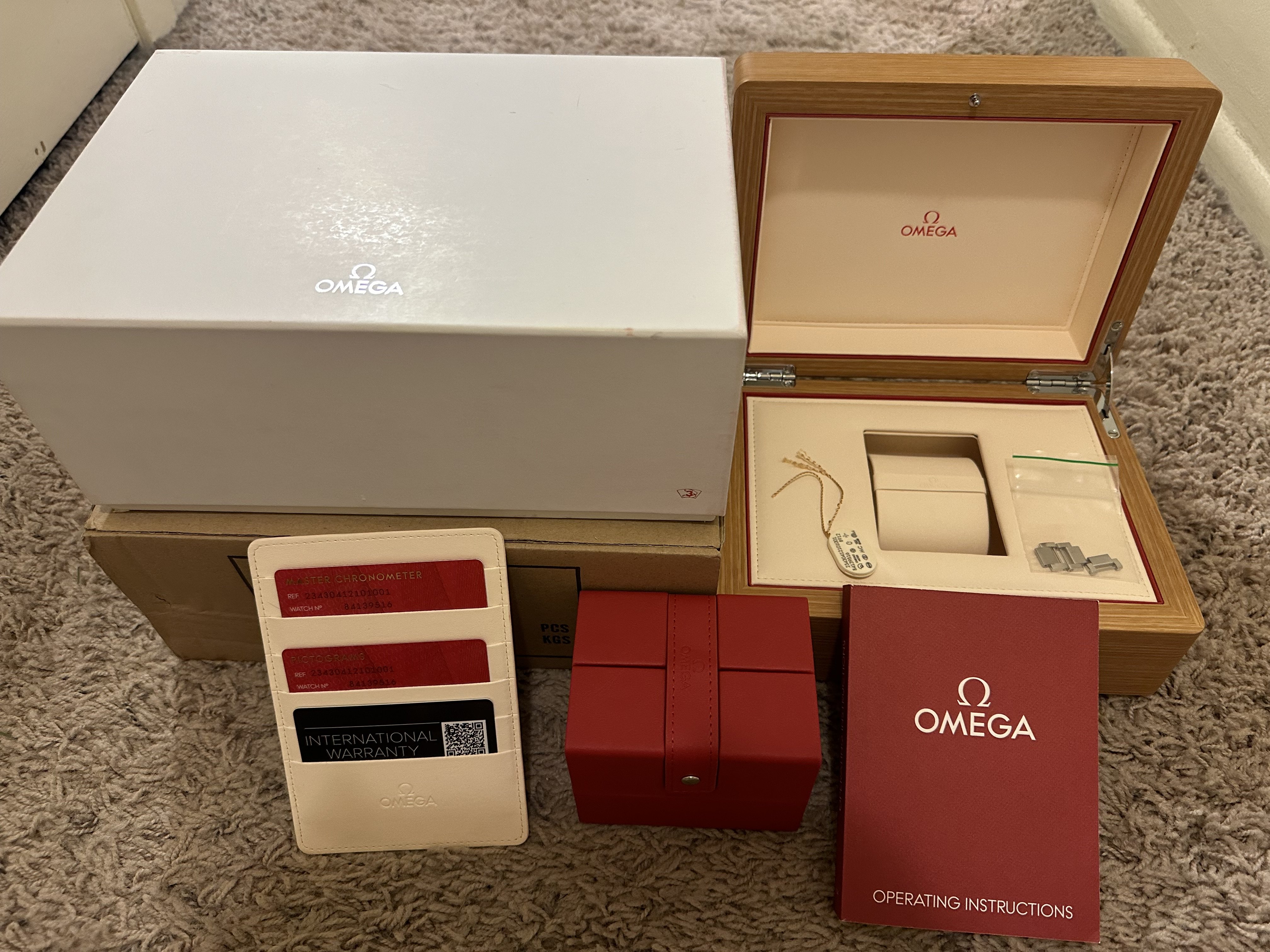 This watch is a full kit and comes with the outer cardboard box, the interior white cardboard box, the newest version of Omega's blond wood watch box with cream leather interior, the red leather travel case which is integrated into the larger box, the operating manual, leather "wallet" with the Master Chronometer card, Pictogram card, and Jomashop International Warranty card, hang tag, extra bracelet links and sales receipt. I'm also including two very nice straps for the watch that I purchased from Australian strap maker Artisan Straps: the first is a natural Chromexcel strap and the second is a black shell cordovan strap. These are $100+ straps, both with quick release spring bars, and have been very sparingly worn and are in excellent condition. Photos below.