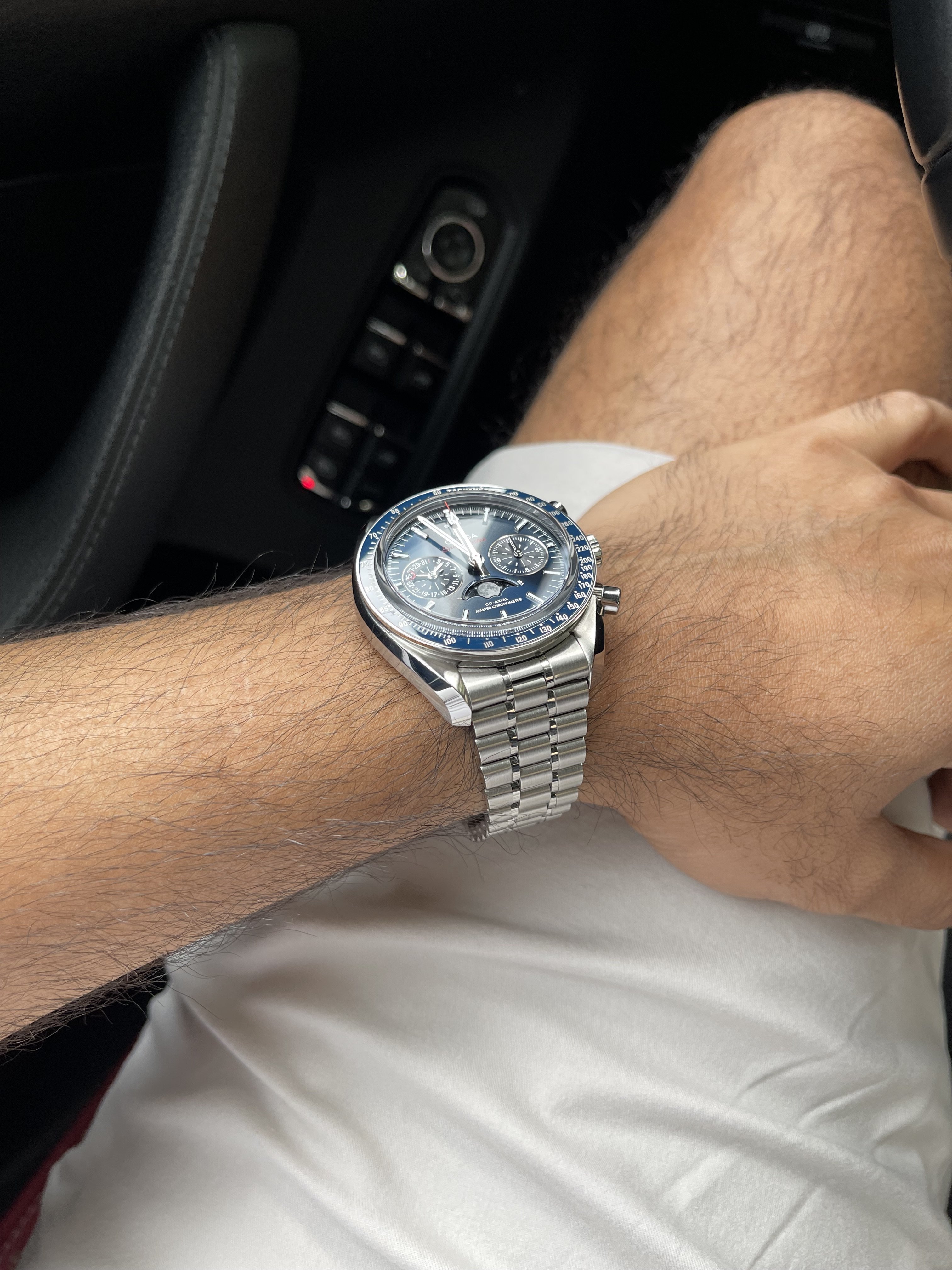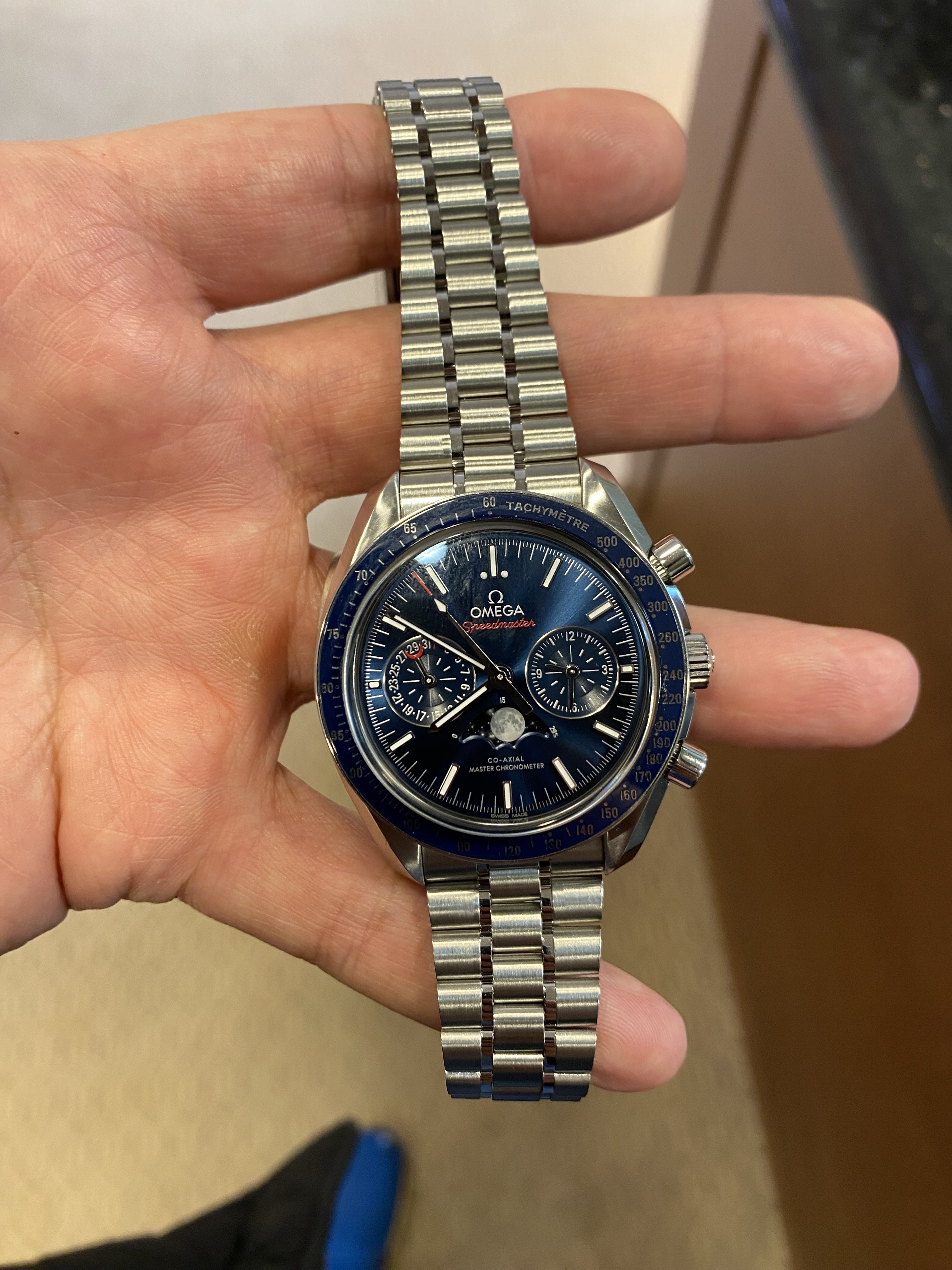 If you have a white coat at an omega boutique they can get it to fit with the thinner spring bars. I don't have the part number but they're thinner than the stock bracelet bars. It was a very nice endlink to case fit. I went through my photos and didn't have any shown on wrist.