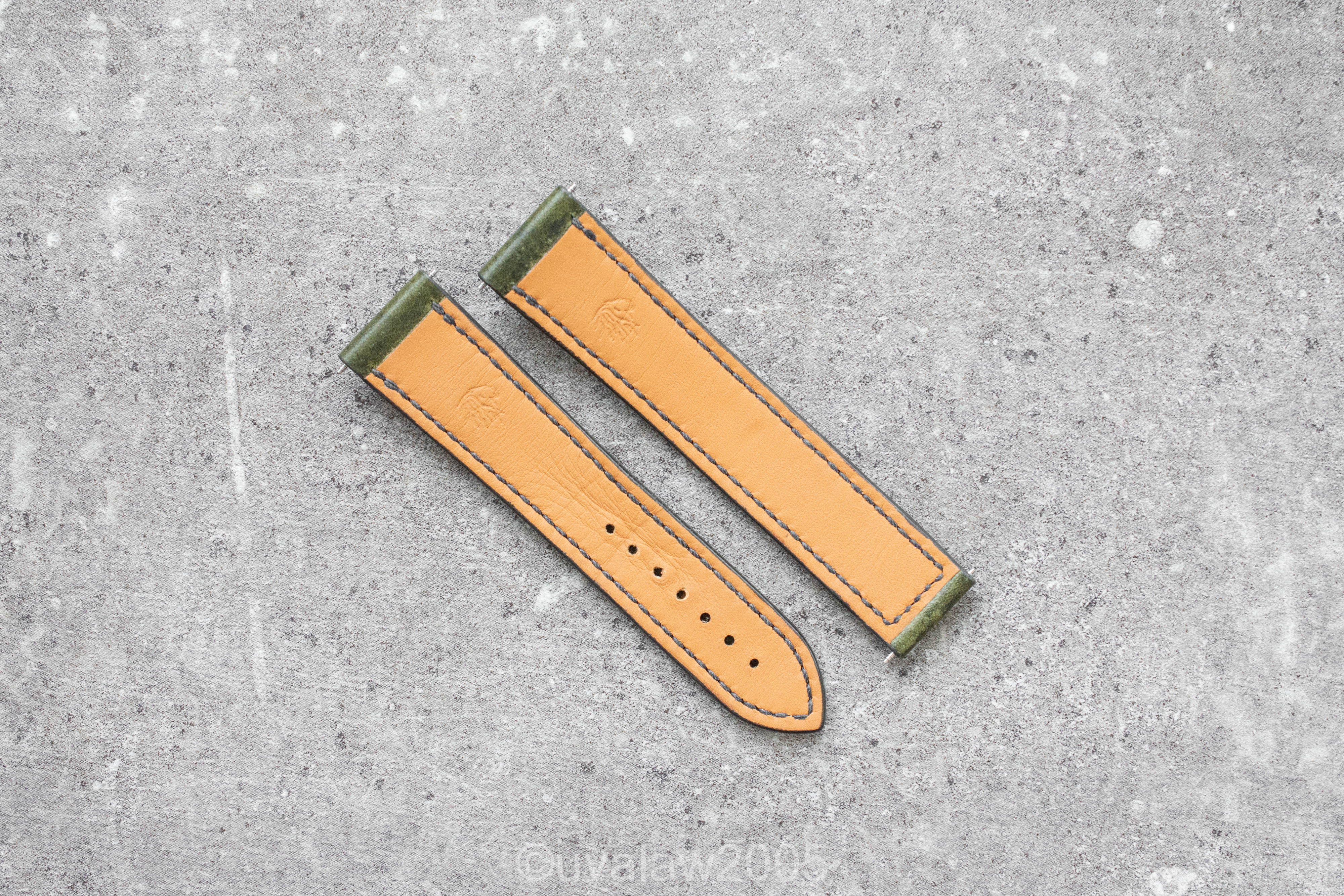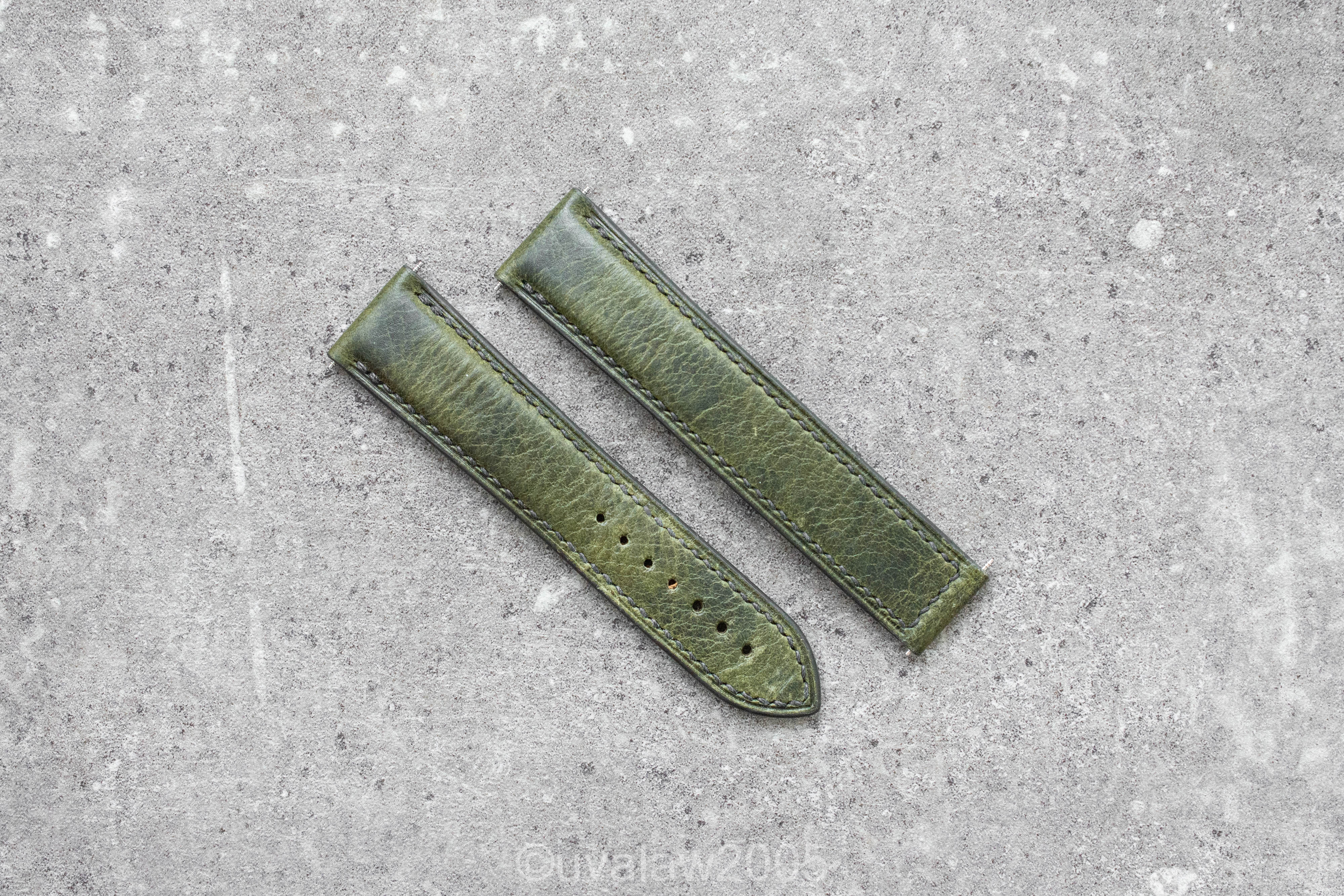 ·For sale is a gently worn custom 20mm Olive Green Waxy leather strap for Omega deployant clasp, handsewn by Russian strap artisan Valery Tkach. Measures 100mm/95mm and tapers to 18mm at the clasp.