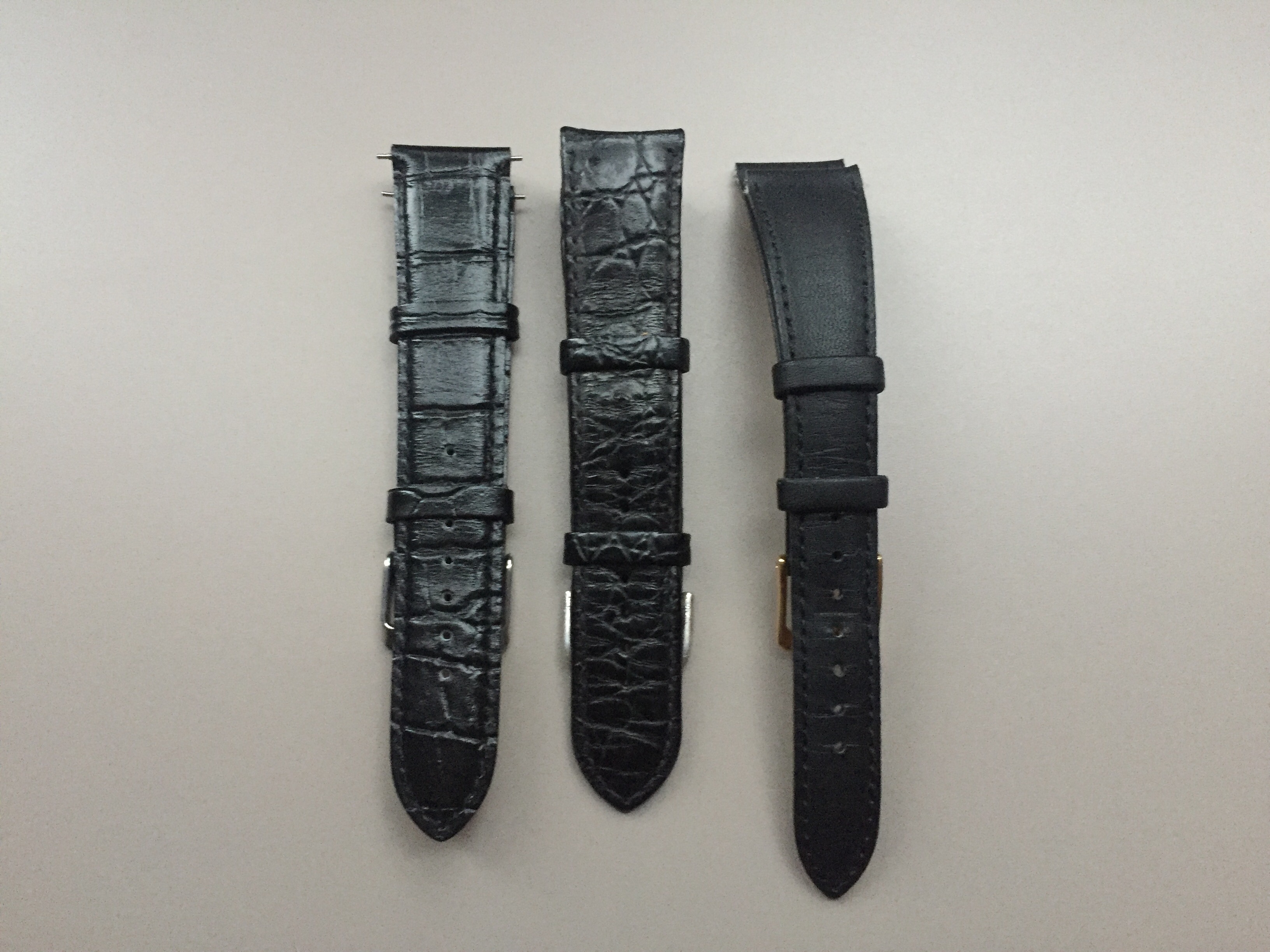 Three (3) black leather straps that I'm assuming came on watches I purchased. One is unworn while the other two are worn, including the open ended one with metal clips on the back.