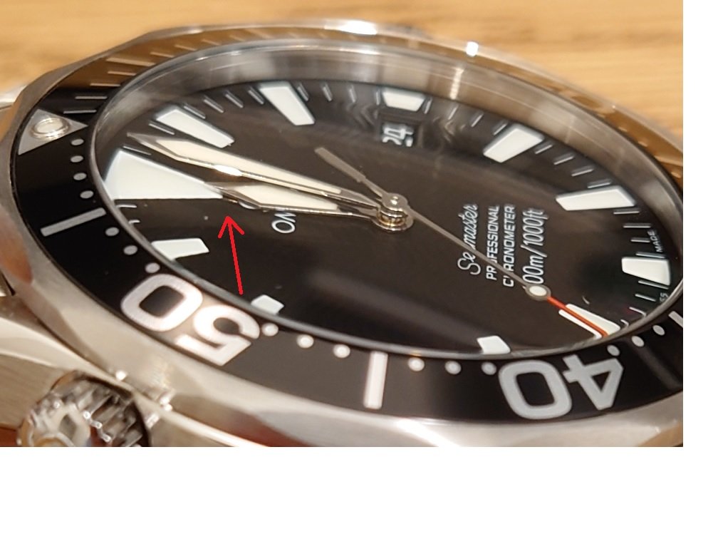 It seems there is very little space between the hour hand and the 12 o'clock lume plot (really the size of a thin hair and I even wonder if it doesn't actually touch it). The hour hand seems to be bent slightly downwards in the direction of the dial. On my other watches I have the impression that the hand sits a little higher with regard to teh dial.