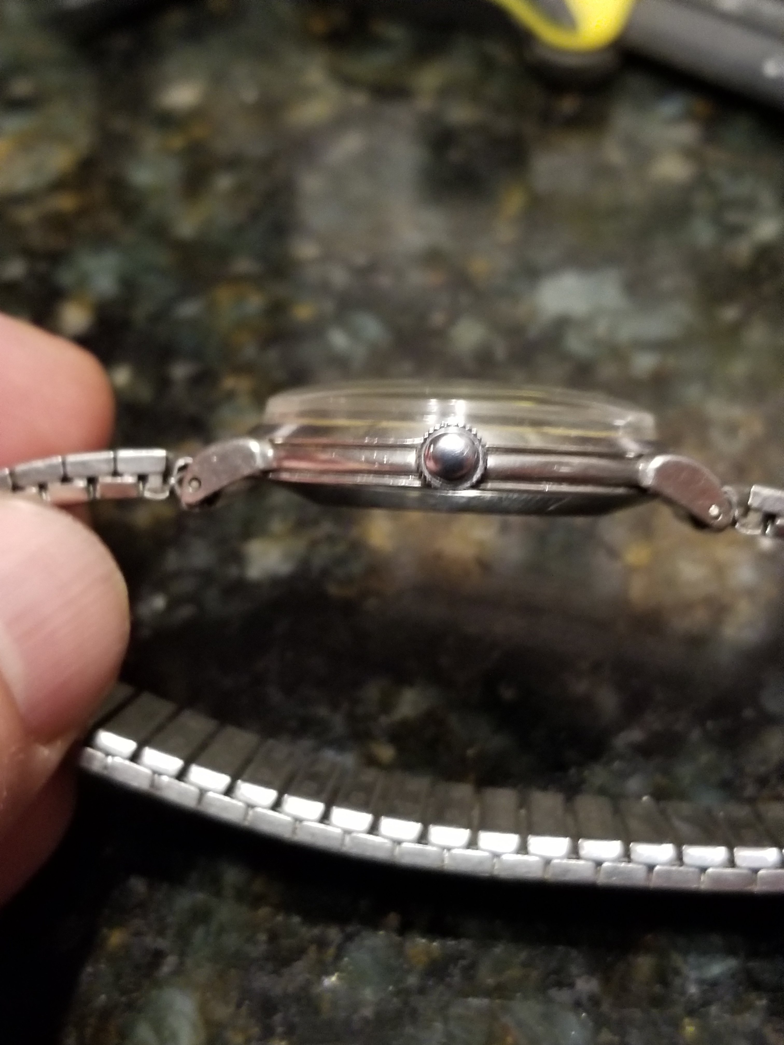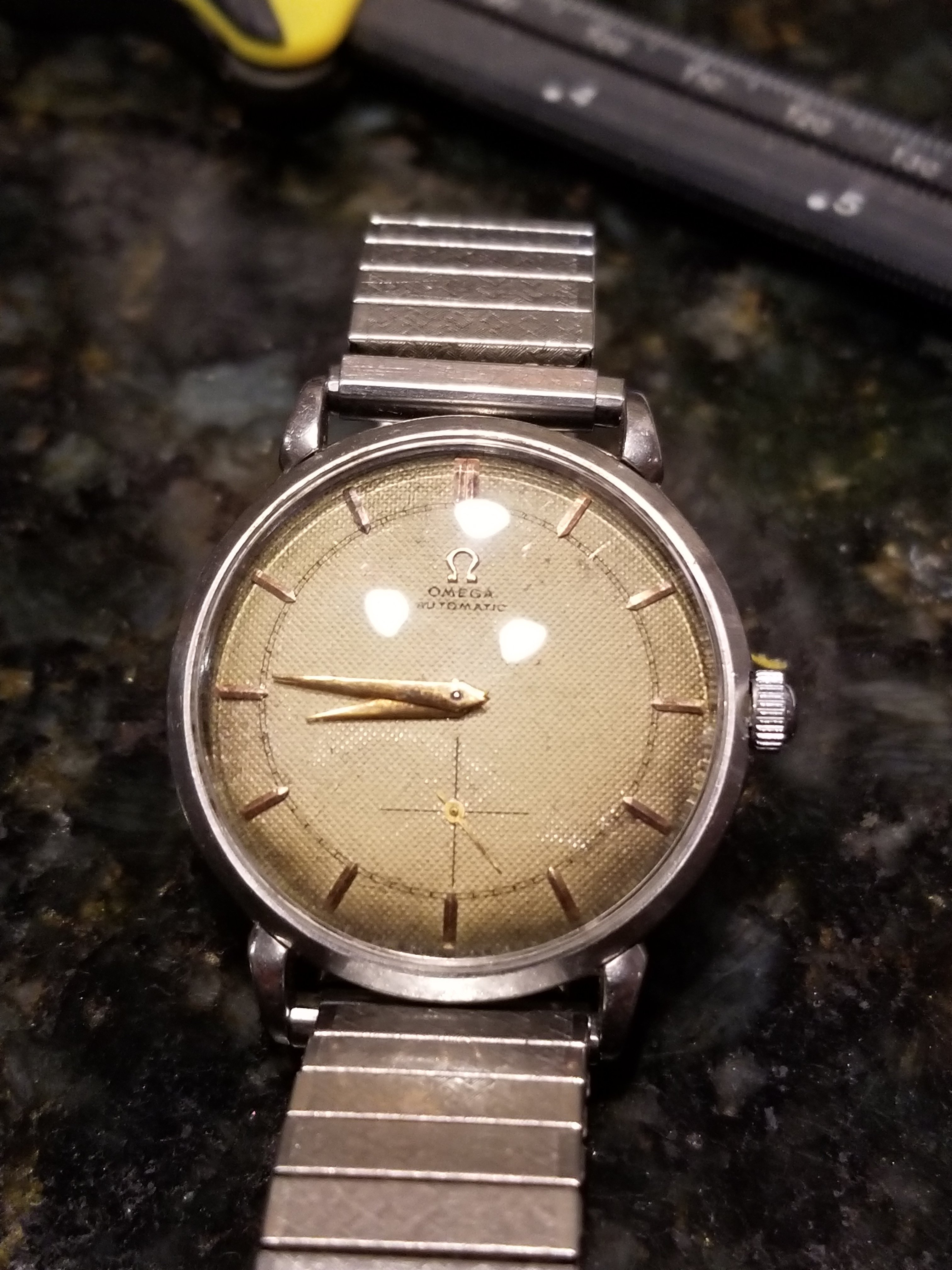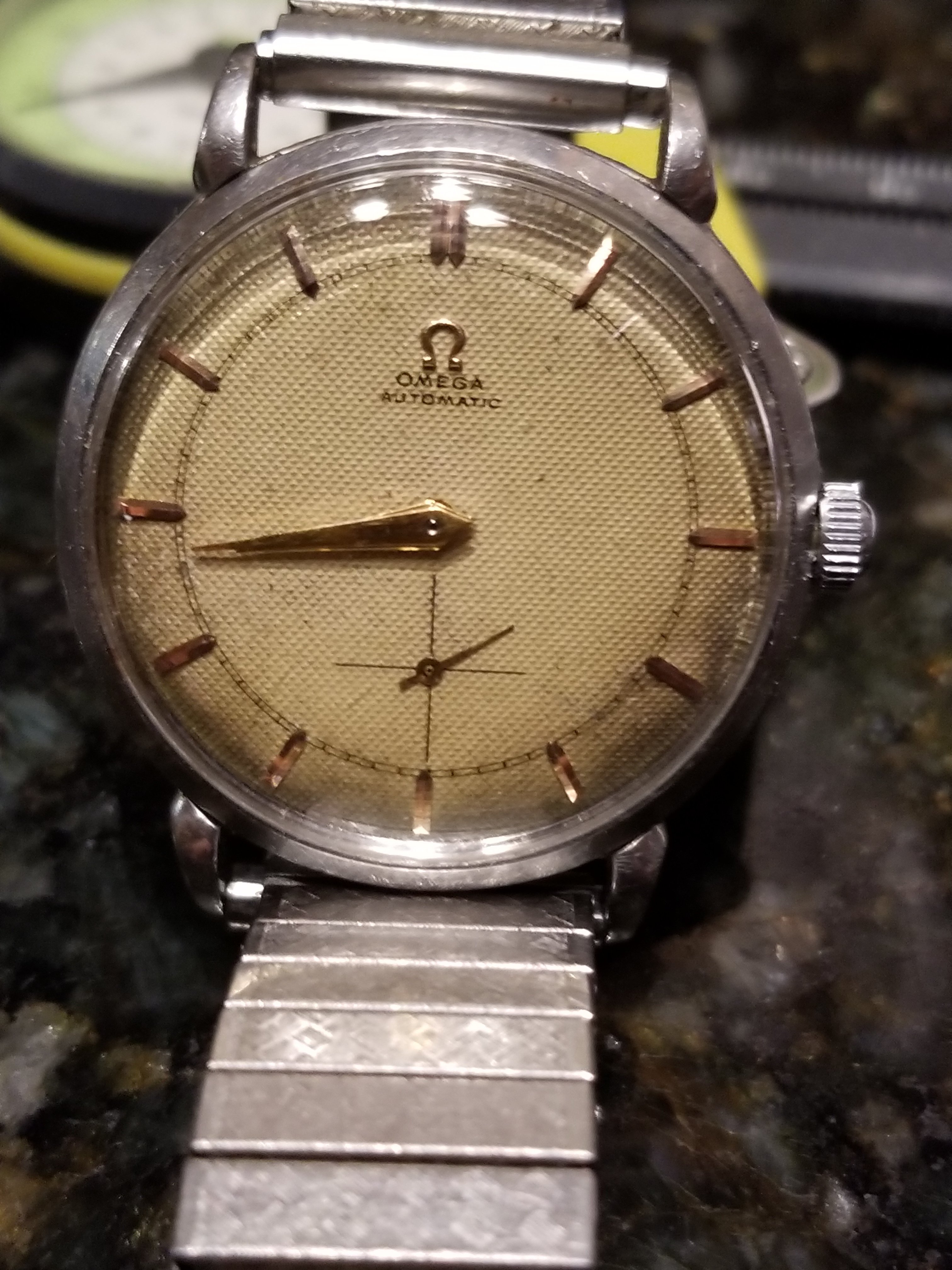 ·A watch I referenced in a previous post arrived finally today. It was advertised as a 2398-5 H and I was wondering if you all could confirm. It's running like a top so I think I'll use it but sparingly for now until more pressing service needs are completed. I have a few questions about the combination of steel case, waffle dial with rose gold hardware. Is there anything unusual about that configuration and is it at all collectable? What would be the appropriate strap/bracelet for it (I kind of hate expanding bracelets). Would a "gentle cleaning/polish) diminish it's collectability?